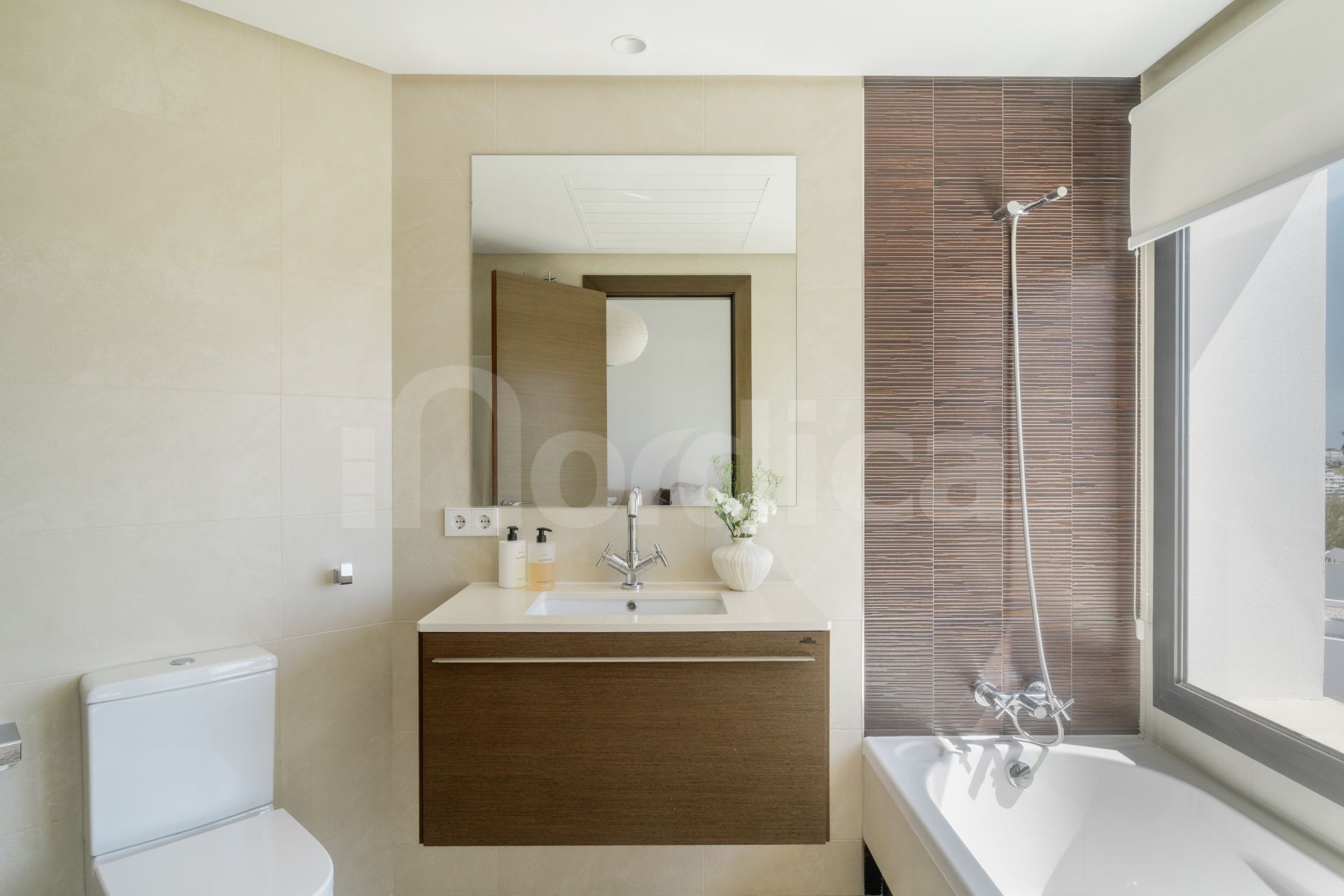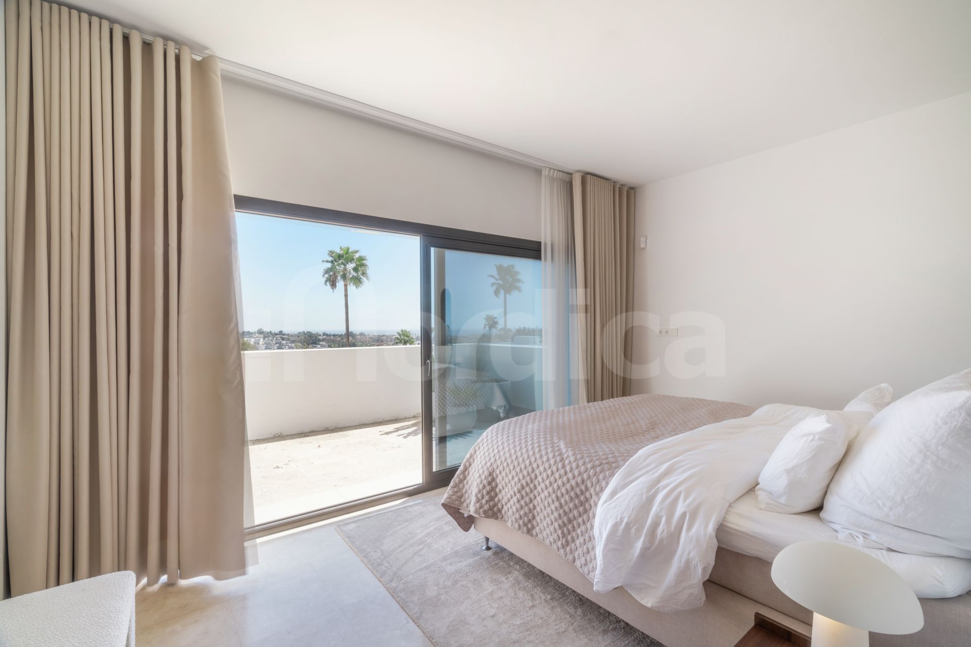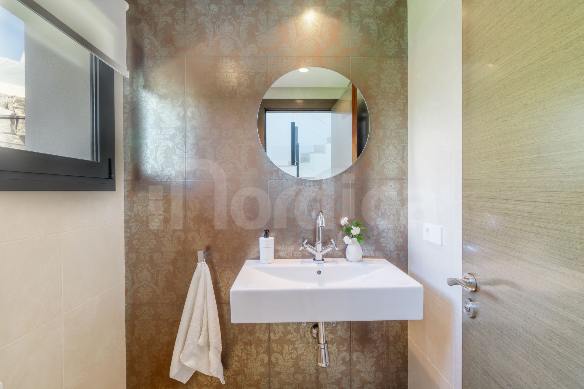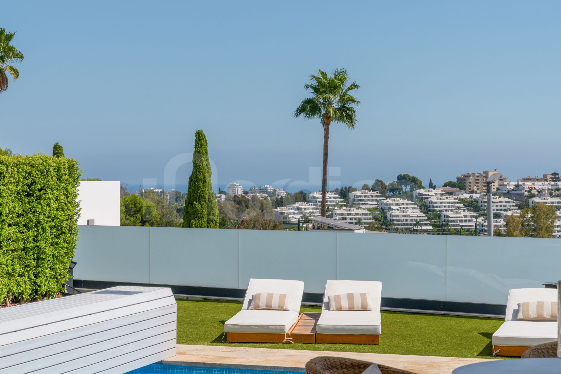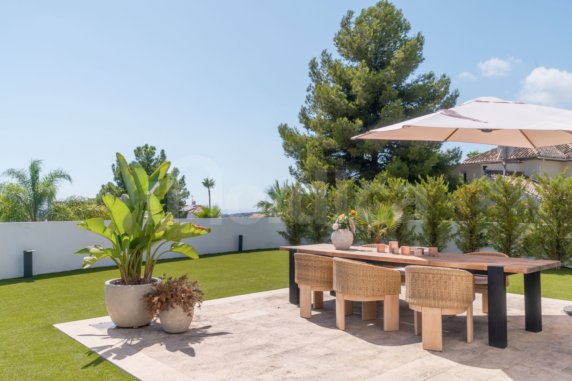 Denna hörnvilla med fem sovrum i de inhägnade områdena Atalaya Fairways och La Alquería erbjuder en kombination av modern design, funktionalitet och avskildhet. Belägen precis vid säkerhetsgrinden har Atalaya Fairways både vakt och kameror i hela området. Dess hörnläge ger ytterligare integritet. Villan är en av de största i urbanisationen och erbjuder den bästa utsikten.