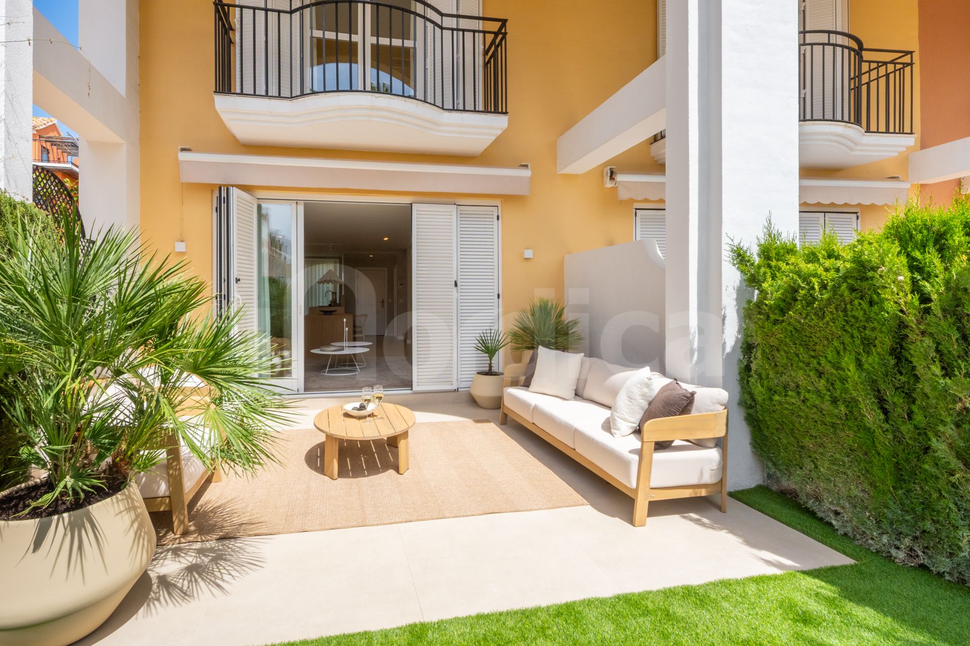 Utomhus finns en privat trädgård i söderläge med terrass, perfekt för avkoppling eller middagar utomhus under det behagliga medelhavsklimatet.