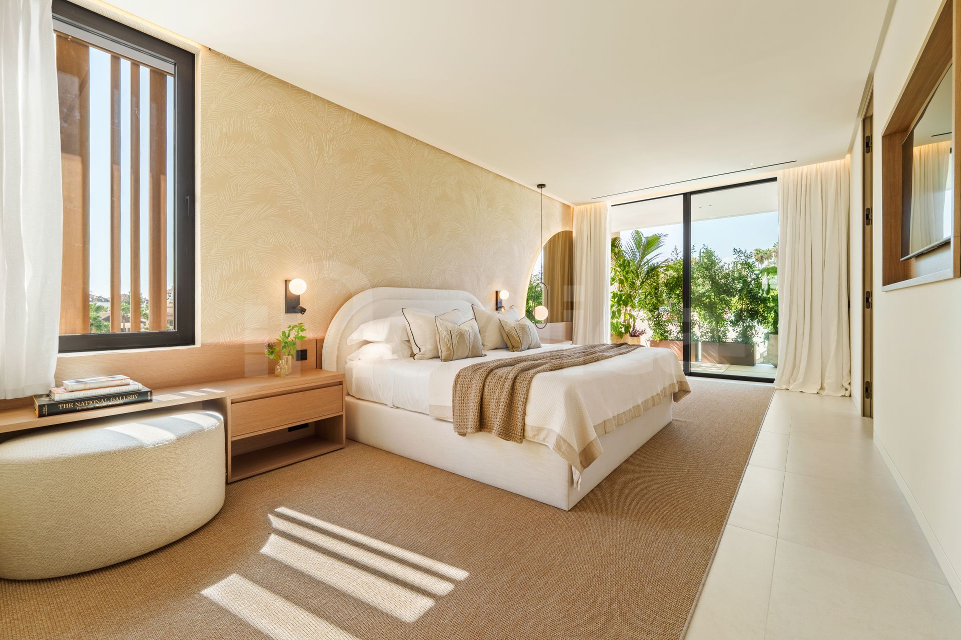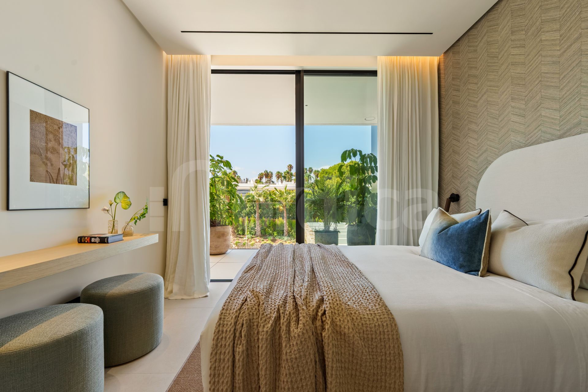 På övervåningen finns tre sovrum. Två gästrum med egna badrum och tillgång till en terrass. På denna våning hittar du även master bedroom, en rymlig svit med modern design, walk-in closet och ett badrum med regndusch och badkar.