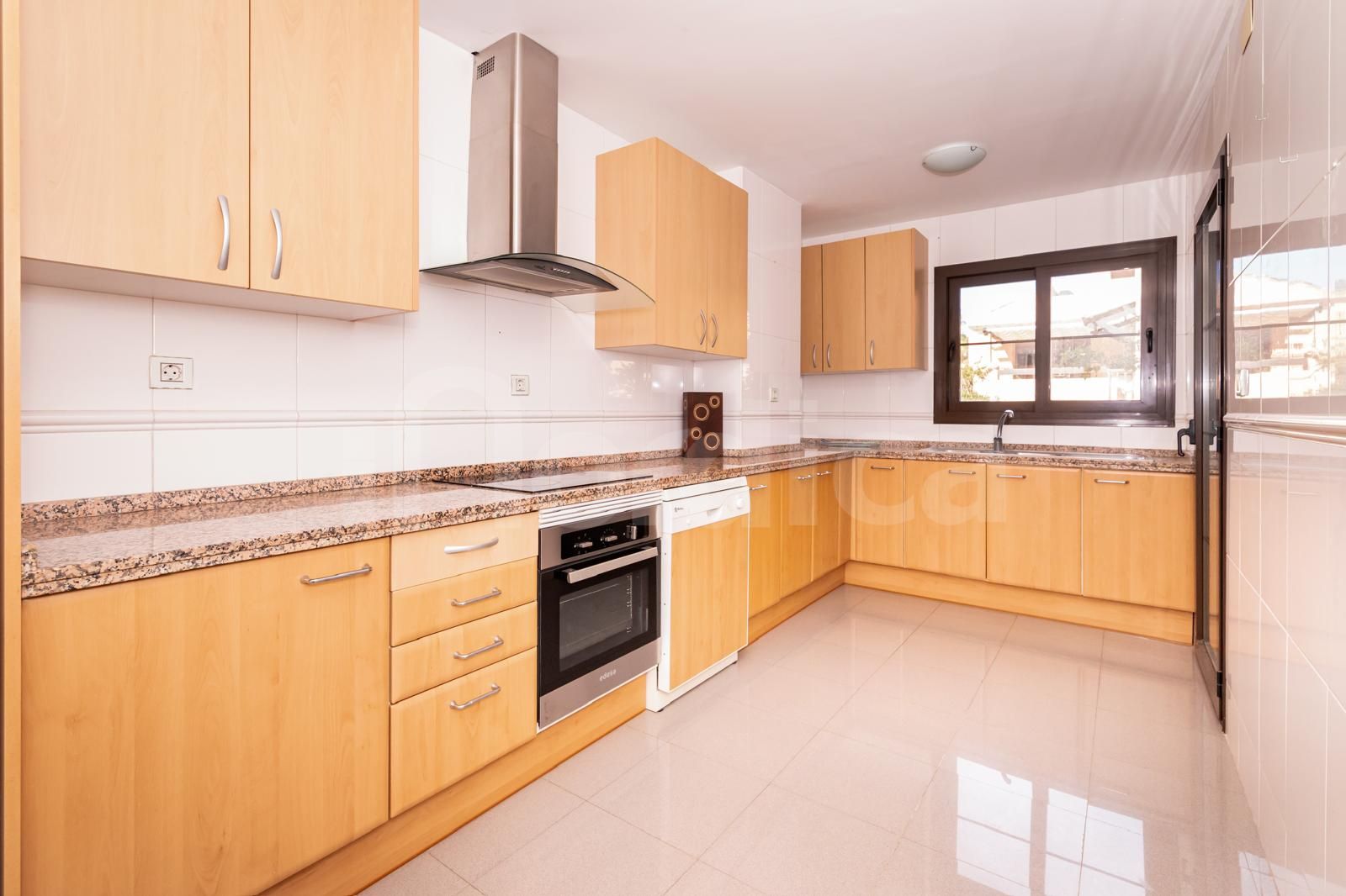 Lägenheten har en välkomnande entréhall som leder till ett rymligt vardagsrum och matsal med öppen spis, ett delvis utrustat kök, ett huvudsovrum med eget badrum samt tre ytterligare sovrum som delar på två välutrustade badrum. Vardagsrummet öppnar upp mot en stor terrass med både öppna och täckta sektioner, varav en del är inglasad med glasgardiner, vilket ger ett mångsidigt utomhusutrymme som kan nyttjas året runt.