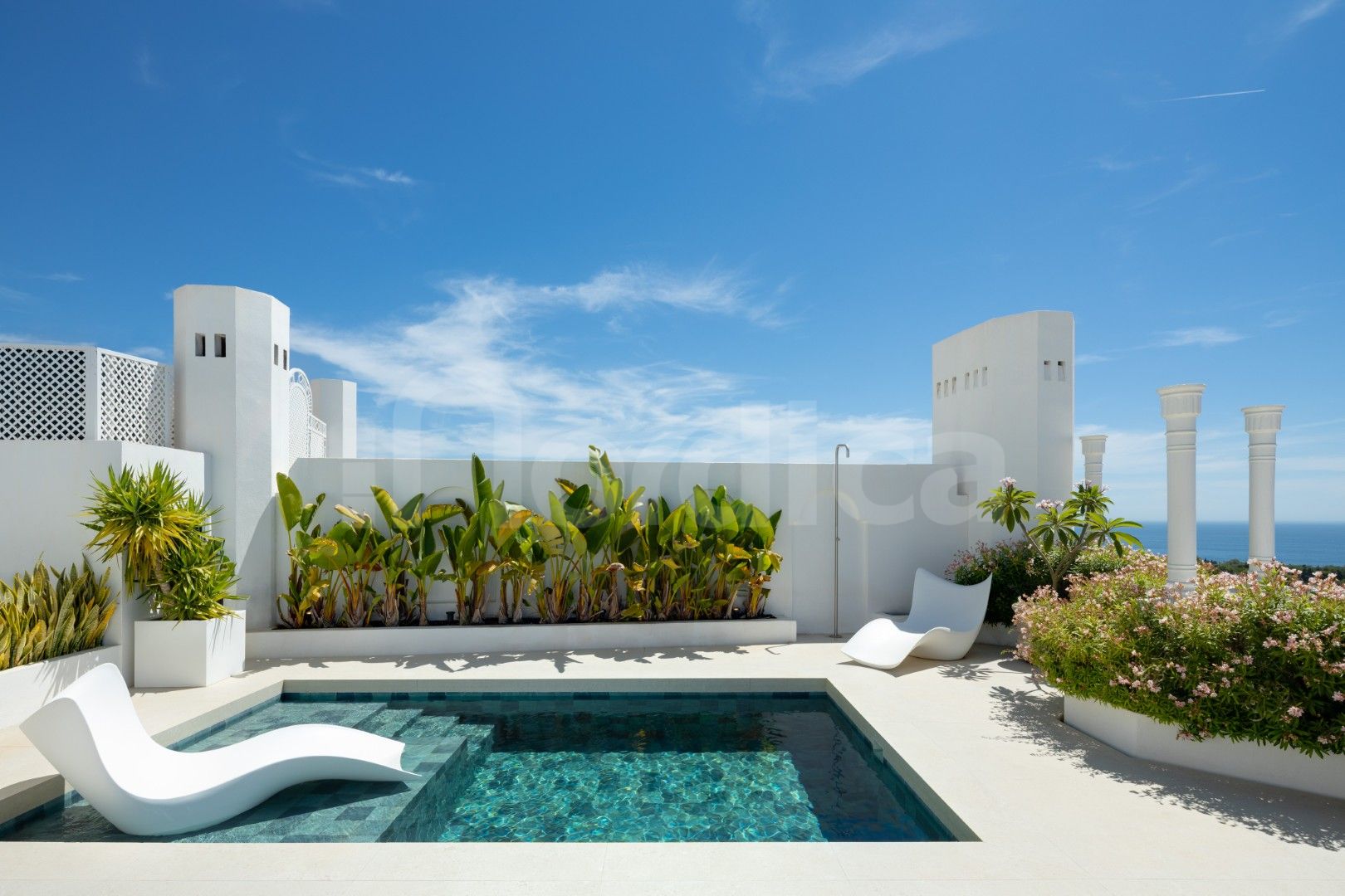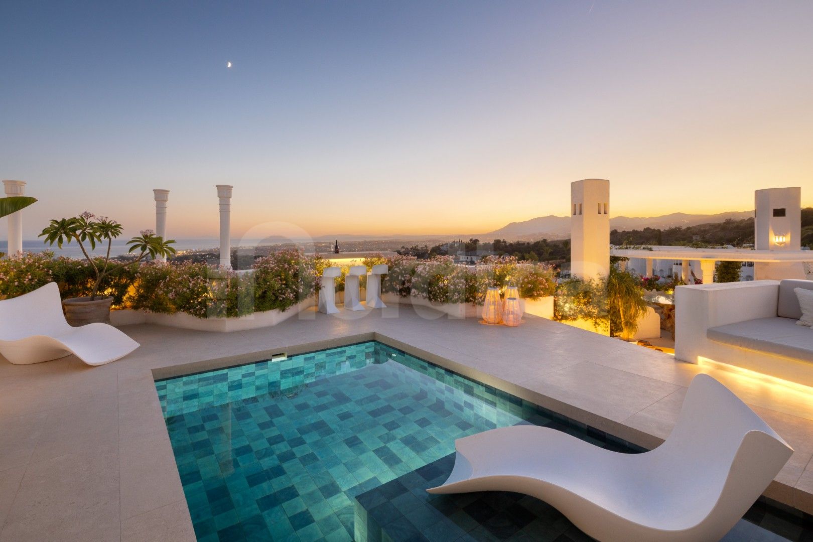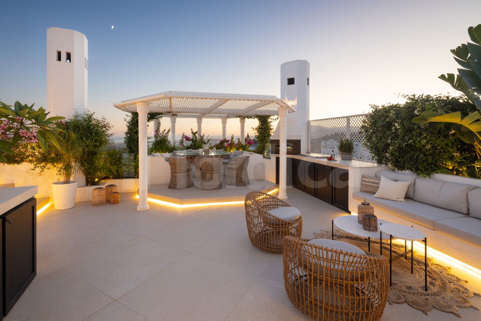Denna enastående lyxvindsvåning till salu i Jardines Colgantes, Marbella erbjuder en sällsynt möjlighet att förvärva en totalrenoverad medelhavsresidens i ett av Marbellas mest prestigefyllda bostadsområden på höjden. Belägen inom det exklusiva Marbella Hill Club-området är denna eleganta duplexvindsvåning utformad för köpare som söker avskildhet, arkitektonisk kvalitet och en förhöjd livsstil bara några minuter från Golden Mile.