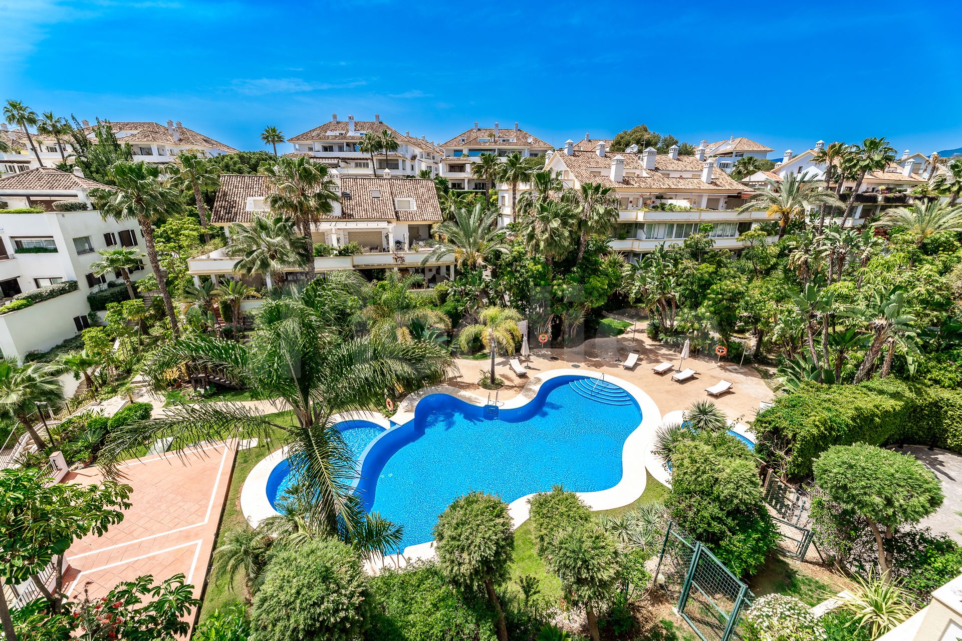 Bostaden är belägen i Lomas del Rey, ett privat och säkert inhägnat område omgivet av frodiga tropiska trädgårdar och rofyllda omgivningar, vilket ger en lyxig boendeupplevelse i resortstil. De generösa terrasserna erbjuder panoramautsikt över havet och La Concha.