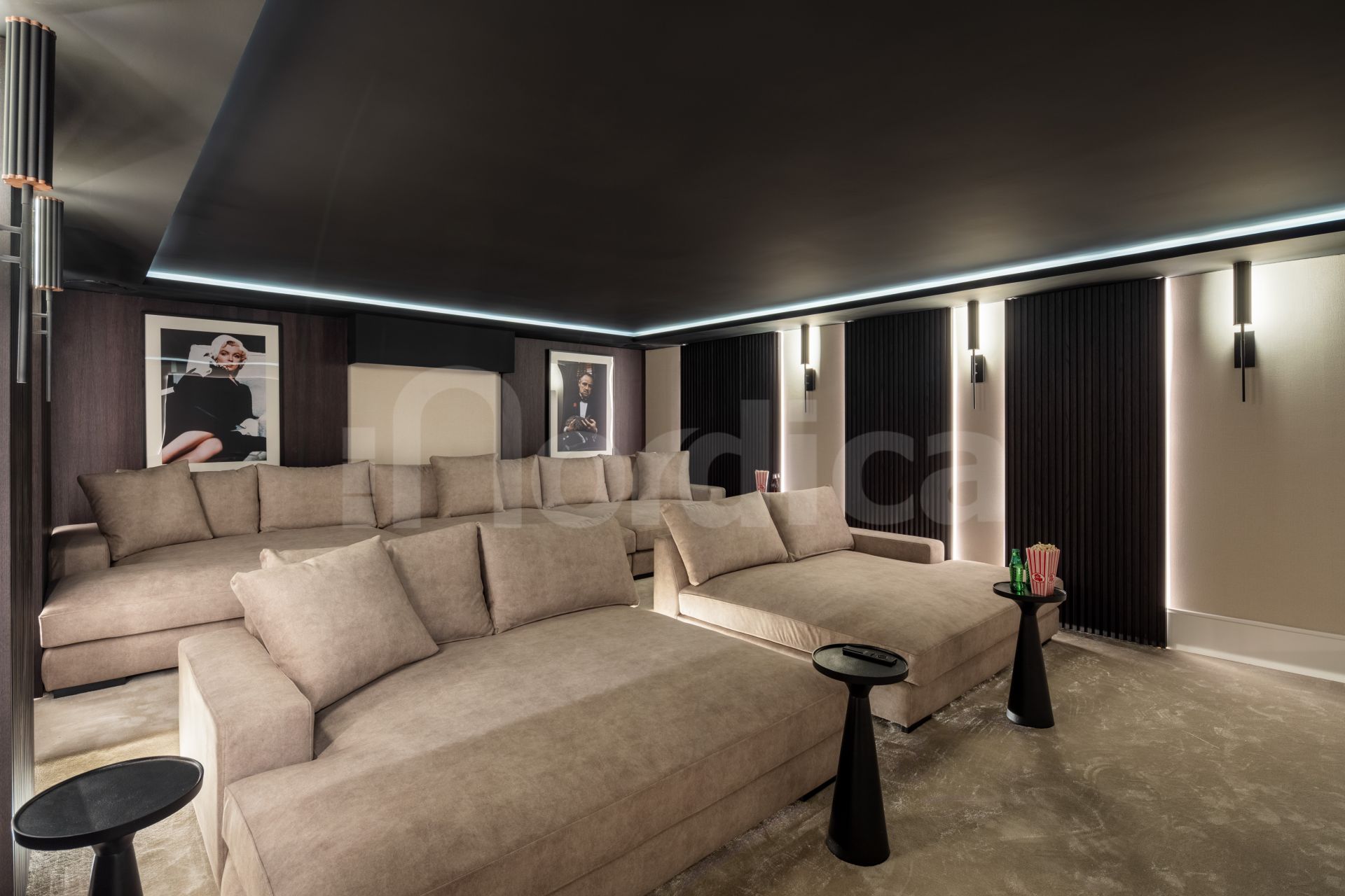 Villans nedre plan är utformat för underhållning och har en stilfull bar och lounge, ett specialbyggt vinkällare och ett biorum. För bilentusiaster finns ett privat garage med en unik glasvägg som visar upp fordonen som en del av hemmets estetik.