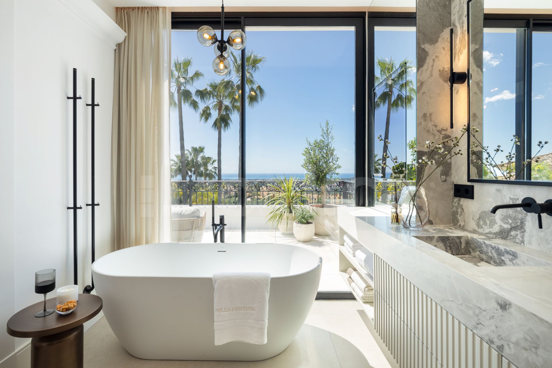 Villa Fortuna erbjuder rymliga interiörer, stora terrasser och hisnande havsutsikt, vilket gör den till en fridfull tillflyktsort för den som söker avkoppling. Villan har fem generöst tilltagna sovrum, alla med eget badrum. Den öppna bottenvåningen är utformad för ett modernt liv, med ett rymligt vardagsrum, ett specialdesignat danskt kök utrustat med exklusiva vitvaror från Gaggenau och Siemens. Intill köket finns en elegant matsal och en mysig TV-lounge, vilket ger en bekväm plats att koppla av på.