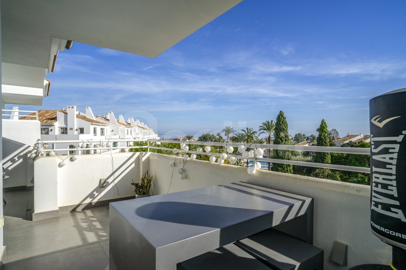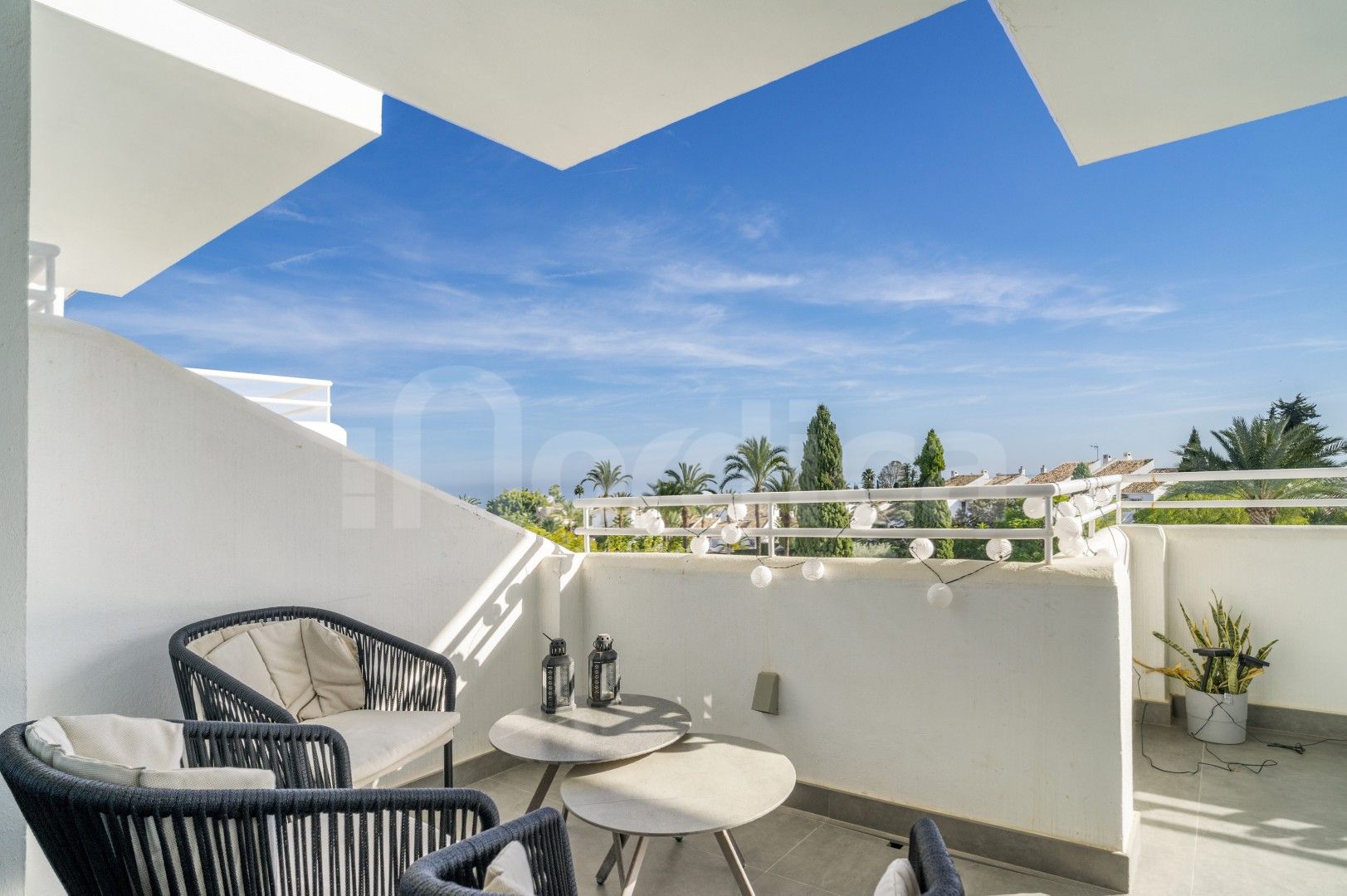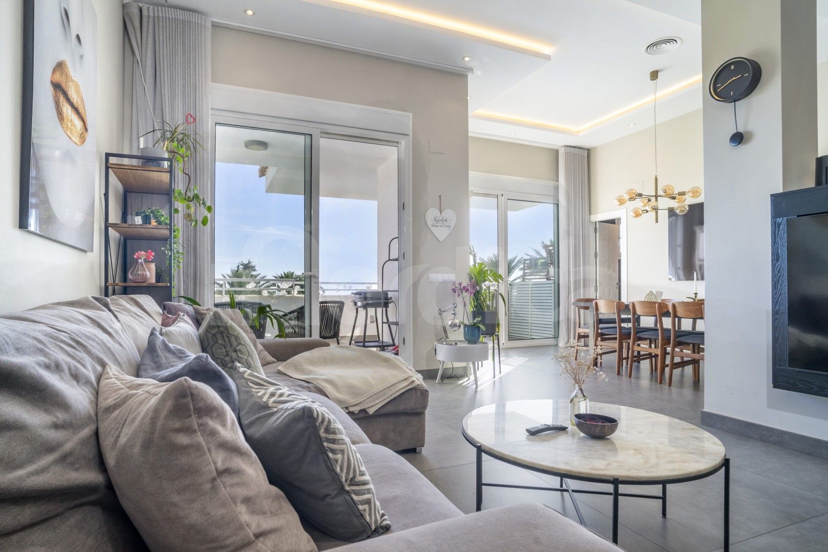 Lägenheten har en ljus och rymlig öppen planlösning där ett fullt utrustat modernt kök smidigt ansluter till matplats och vardagsrum, vilket skapar en idealisk plats för vardagsliv och umgänge. Från vardagsrummet leder stora dörrar ut till en privat terrass som erbjuder fantastisk fri utsikt över Medelhavet samt den gemensamma poolen och de anlagda trädgårdsområdena, vilket ger en avkopplande miljö för att njuta av utomhuslivet året runt.
