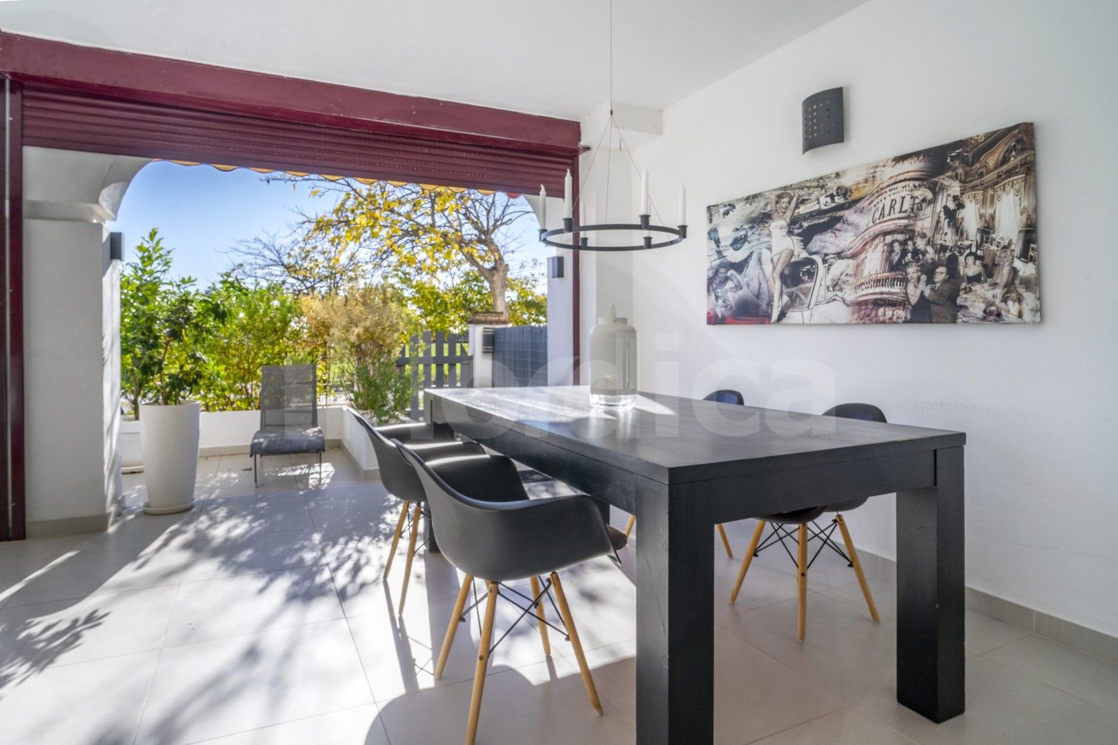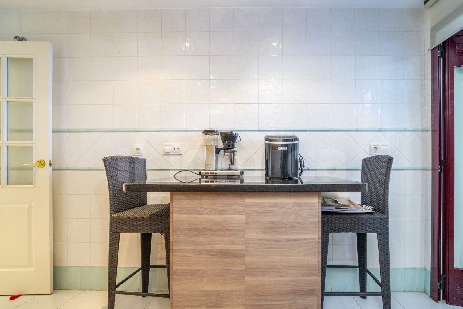 Lägenheten erbjuder en ljus och bekväm planlösning med ett kombinerat mat- och vardagsrum som öppnar direkt ut mot en rymlig privat terrass. Terrassen har både täckta och öppna ytor, vilket gör att du kan njuta av utomhuslivet året runt, oavsett om det gäller måltider, avkoppling eller underhållning. Det fullt utrustade köket är praktiskt och stilfullt, med en frukostbar utformad som en väggfast köksö, och kompletteras av ett separat grovkök för extra bekvämlighet.