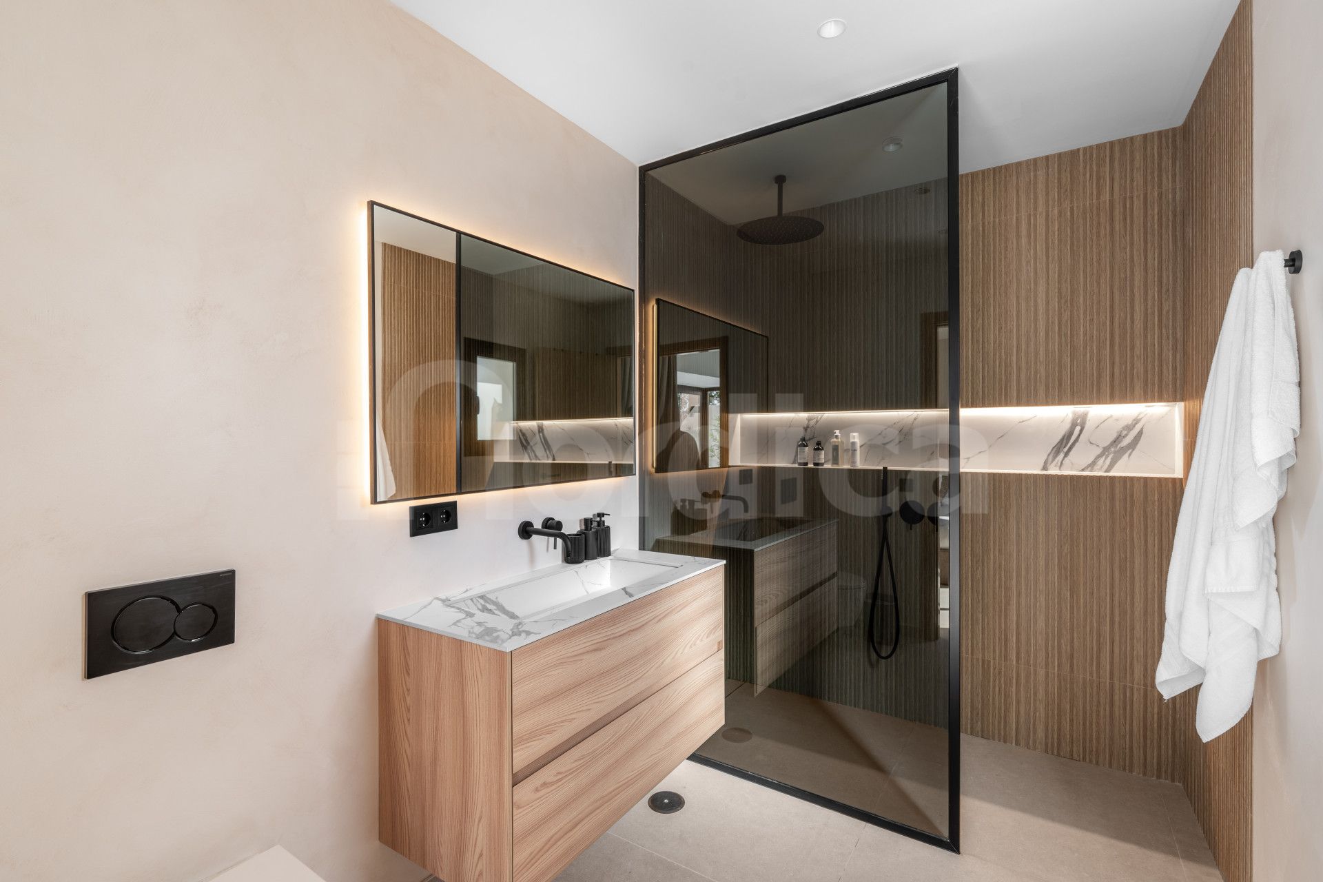 Im Obergeschoss befinden sich drei gut geschnittene Schlafzimmer. Das Hauptschlafzimmer verfügt über einen großen Ankleidebereich, ein eigenes Bad und direkten Zugang zu einer privaten Terrasse. Von hier aus führt eine Treppe zum Dachsolarium, das einen ruhigen Rückzugsort bietet und dem Käufer vielfältige Gestaltungsmöglichkeiten eröffnet. Zwei weitere Schlafzimmer teilen sich ein hochwertig ausgestattetes Badezimmer.