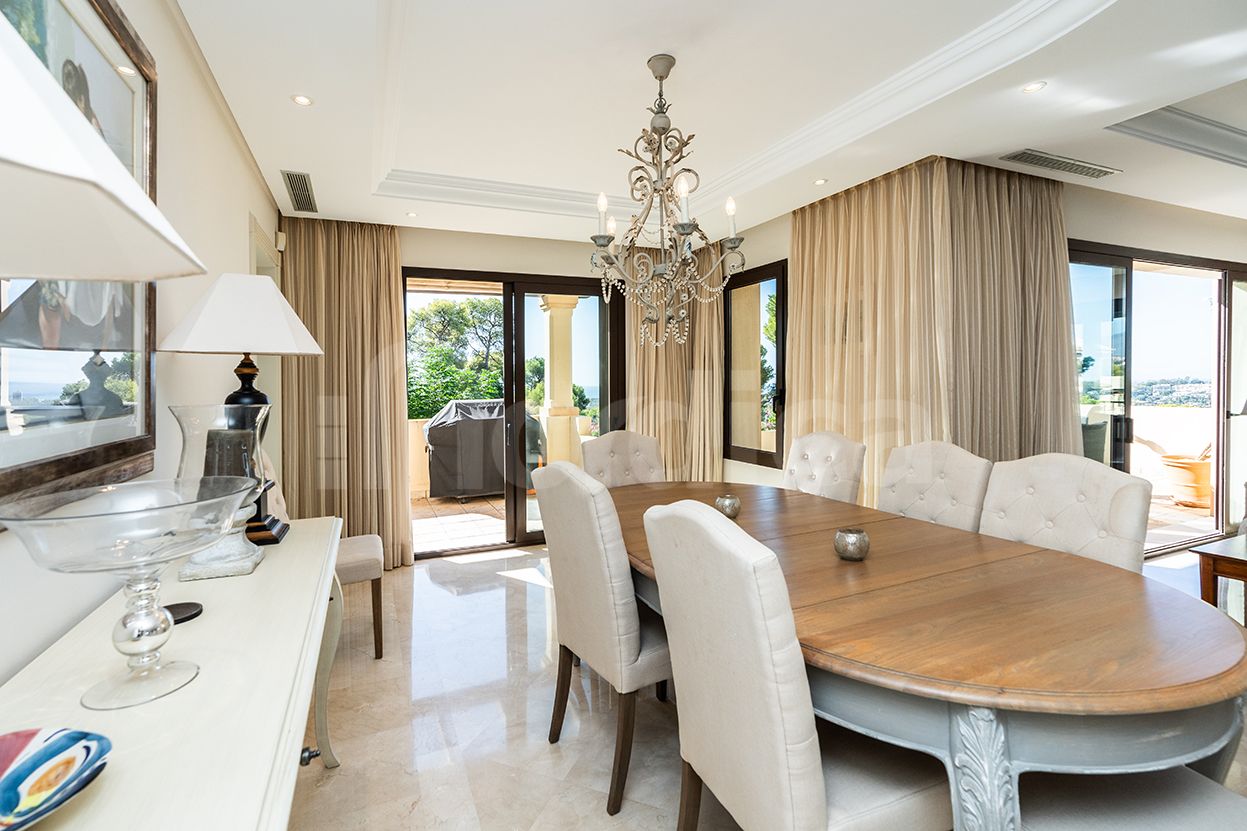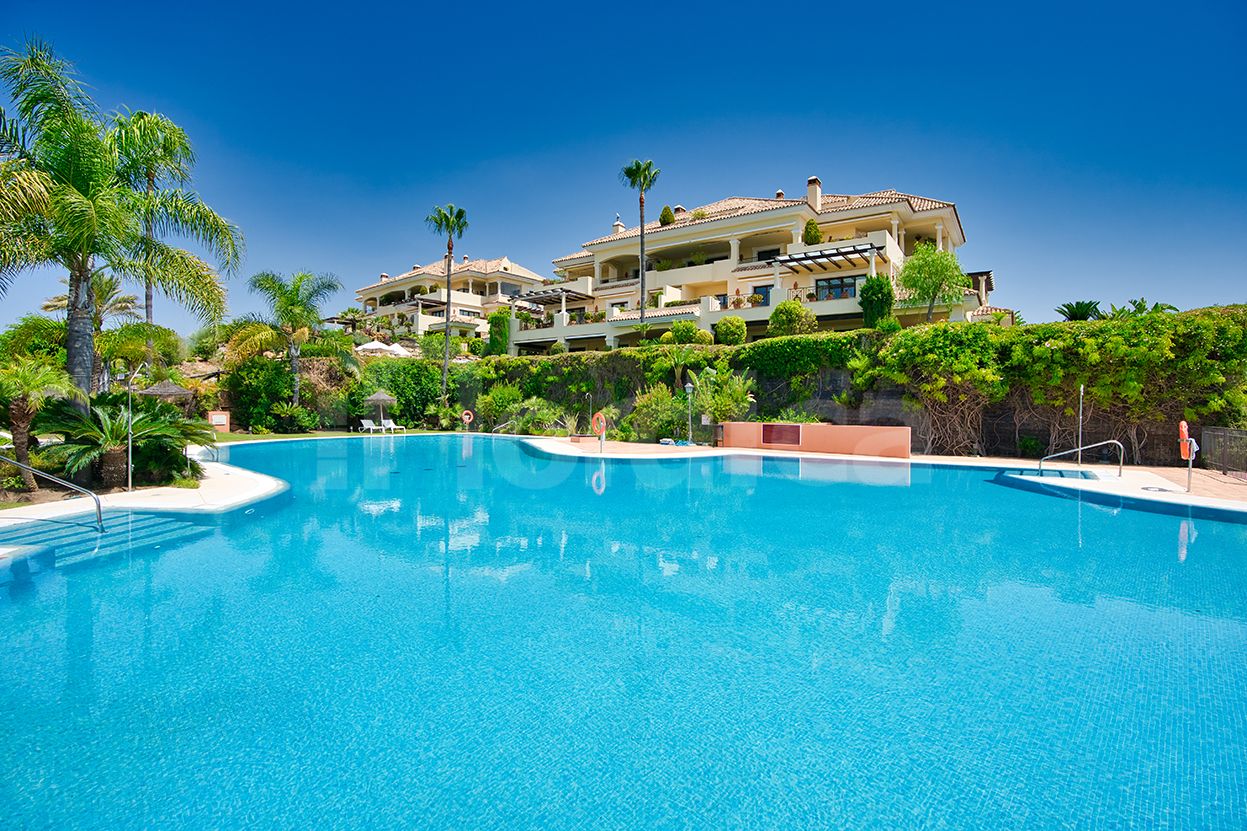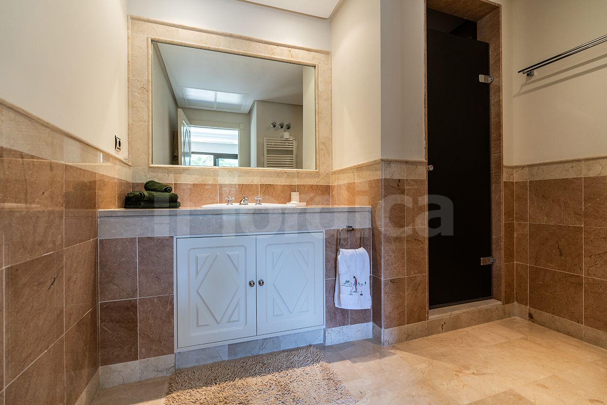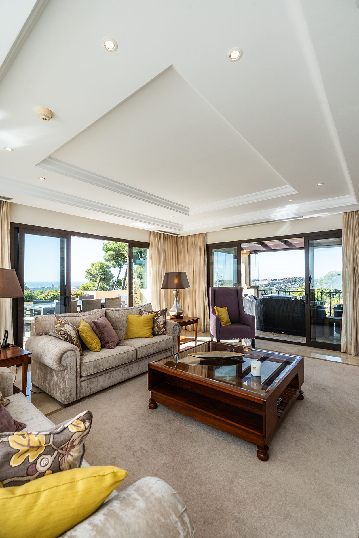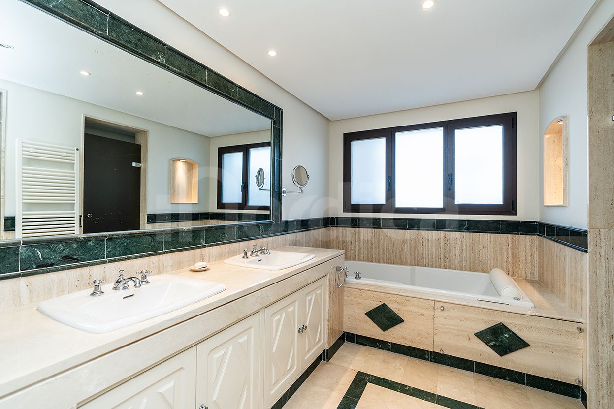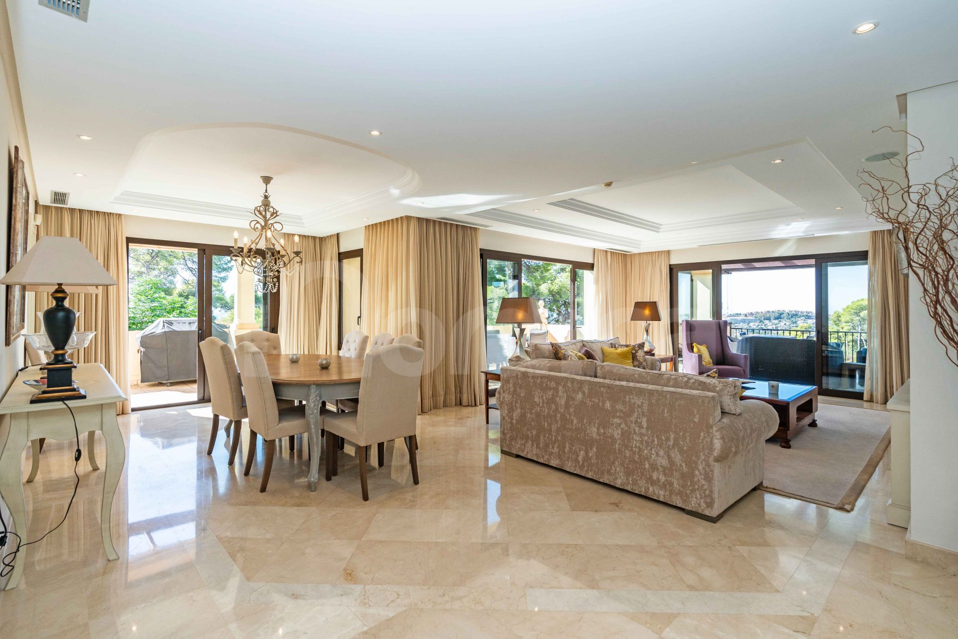 Diese gepflegte Wohnung im Originalzustand bietet Privatsphäre und Ruhe, helle und großzügige Wohnbereiche, hochwertige Ausstattung und erstklassige Annehmlichkeiten vor Ort. Die Immobilie umfasst eine elegante Eingangshalle mit Gäste-WC, ein großes, helles Wohn-/Esszimmer mit Zugang zu einer über 100 m² großen Terrasse, von der ein Teil durch Glasvorhänge geschlossen ist. Das Hauptschlafzimmer mit Bad en suite hat ebenfalls Zugang zur Hauptterrasse, und es gibt zwei weitere Schlafzimmer, jeweils mit eigenem Bad und privaten Terrassen. Die Küche ist voll ausgestattet und verfügt über einen separaten Hauswirtschaftsraum. Weitere Ausstattungsmerkmale sind: Individuelle Klimaanlage in jedem Raum, Fußbodenheizung im gesamten Apartment, cremefarbener Marmorboden, zwei große Tiefgaragenstellplätze und ein 20 m² großer Abstellraum.