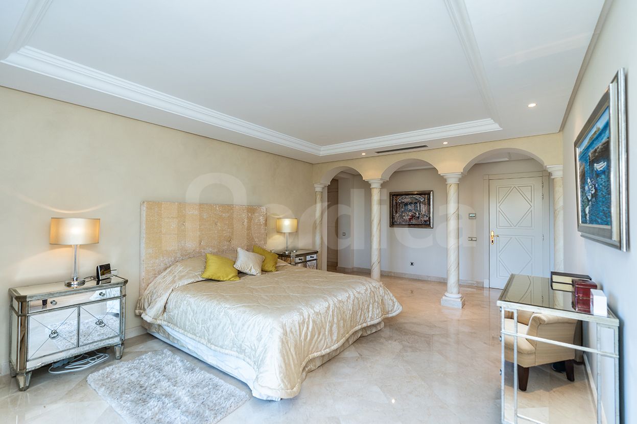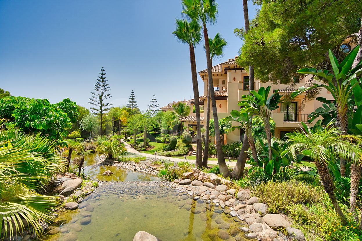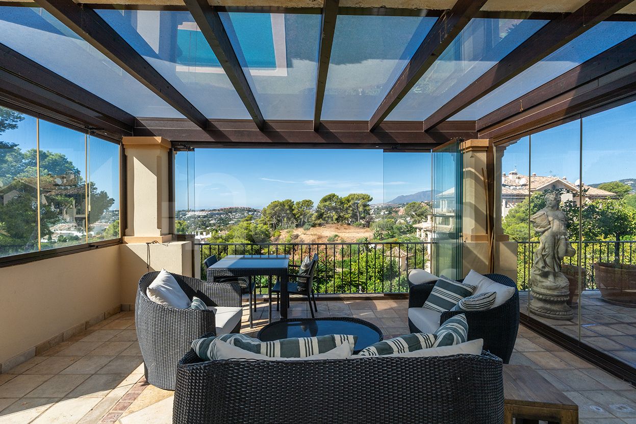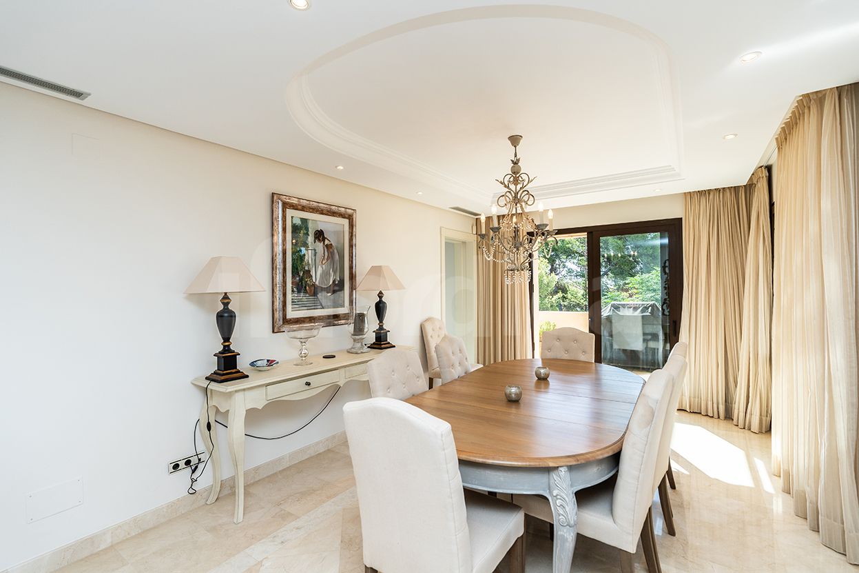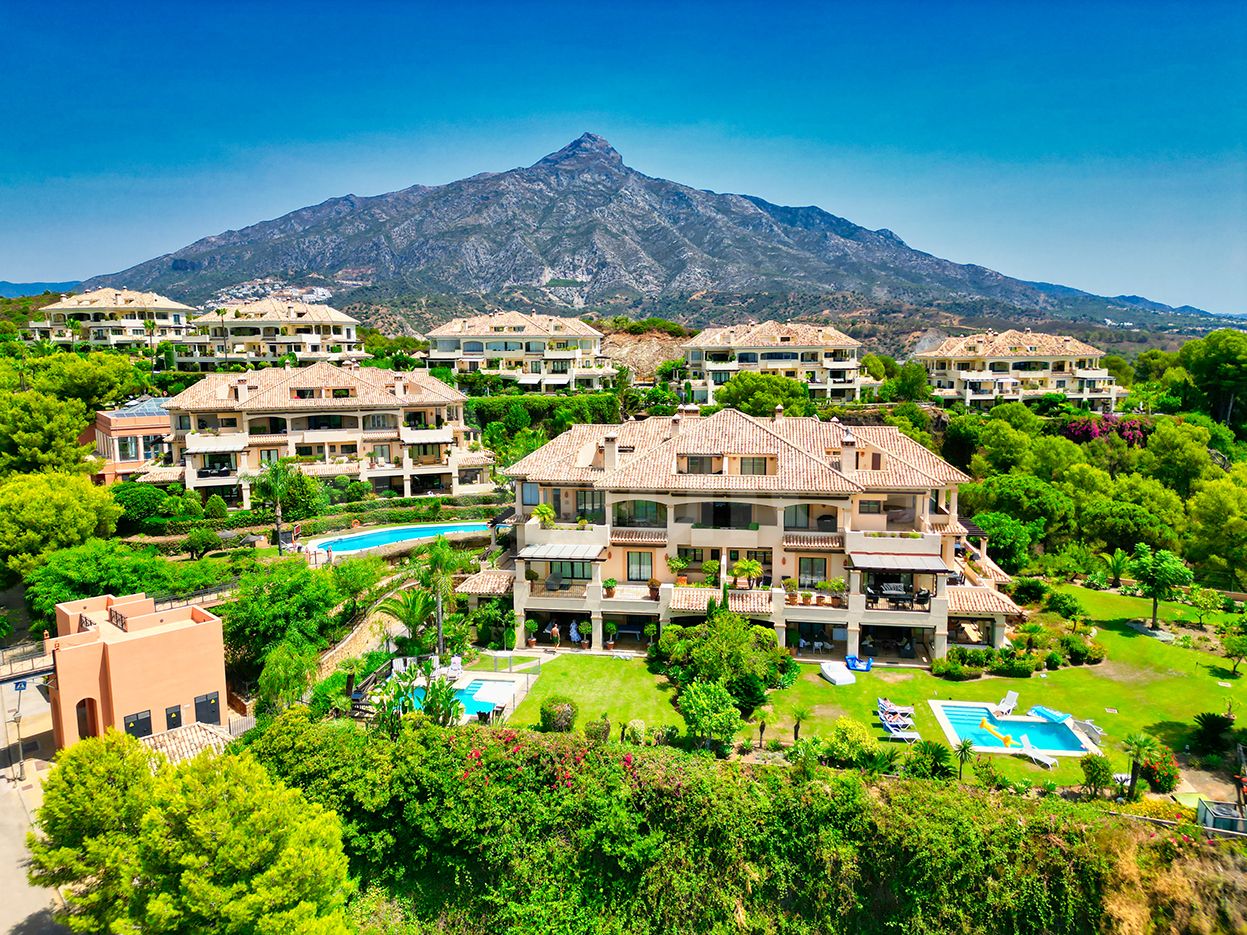 Diese gepflegte Wohnung im Originalzustand bietet Privatsphäre und Ruhe, helle und großzügige Wohnbereiche, hochwertige Ausstattung und erstklassige Annehmlichkeiten vor Ort. Die Immobilie umfasst eine elegante Eingangshalle mit Gäste-WC, ein großes, helles Wohn-/Esszimmer mit Zugang zu einer über 100 m² großen Terrasse, von der ein Teil durch Glasvorhänge geschlossen ist. Das Hauptschlafzimmer mit Bad en suite hat ebenfalls Zugang zur Hauptterrasse, und es gibt zwei weitere Schlafzimmer, jeweils mit eigenem Bad und privaten Terrassen. Die Küche ist voll ausgestattet und verfügt über einen separaten Hauswirtschaftsraum. Weitere Ausstattungsmerkmale sind: Individuelle Klimaanlage in jedem Raum, Fußbodenheizung im gesamten Apartment, cremefarbener Marmorboden, zwei große Tiefgaragenstellplätze und ein 20 m² großer Abstellraum.
