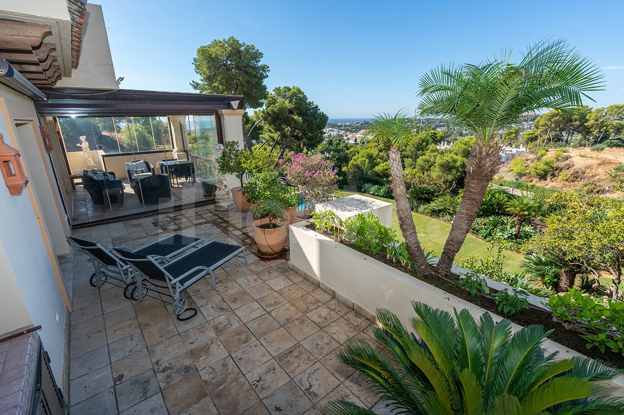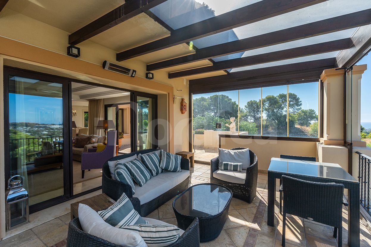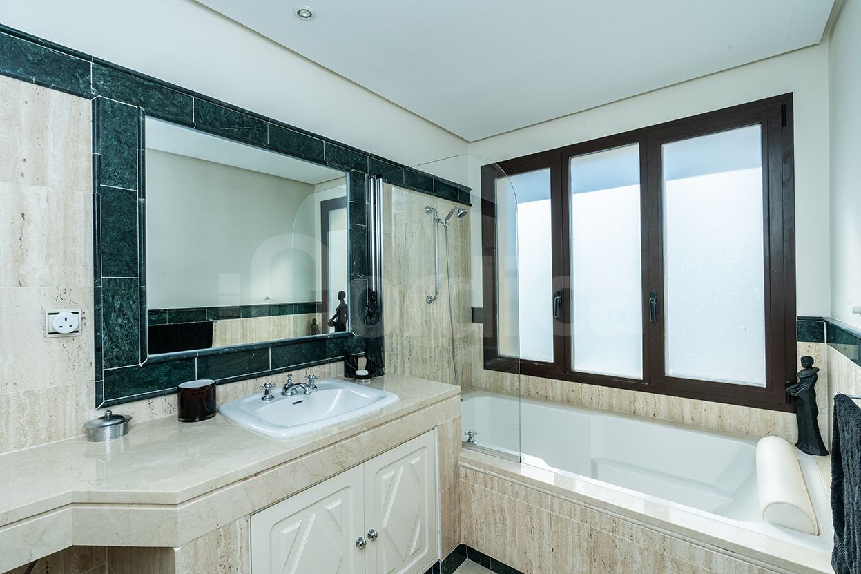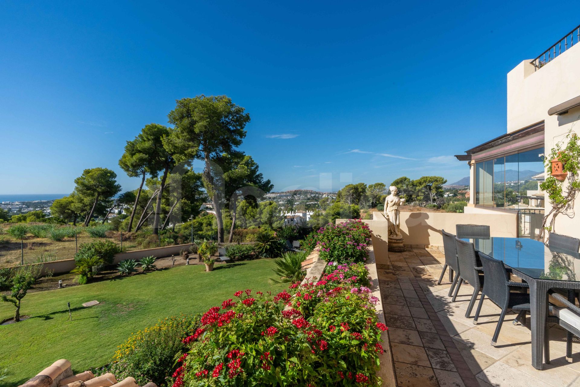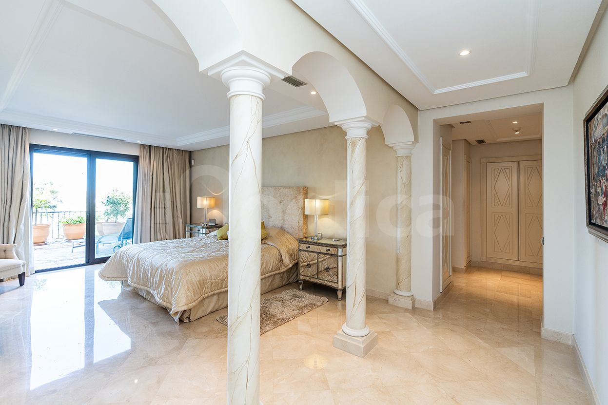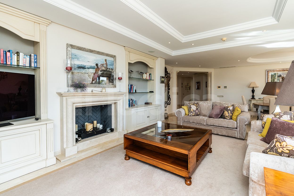 Diese gepflegte Wohnung im Originalzustand bietet Privatsphäre und Ruhe, helle und großzügige Wohnbereiche, hochwertige Ausstattung und erstklassige Annehmlichkeiten vor Ort. Die Immobilie umfasst eine elegante Eingangshalle mit Gäste-WC, ein großes, helles Wohn-/Esszimmer mit Zugang zu einer über 100 m² großen Terrasse, von der ein Teil durch Glasvorhänge geschlossen ist. Das Hauptschlafzimmer mit Bad en suite hat ebenfalls Zugang zur Hauptterrasse, und es gibt zwei weitere Schlafzimmer, jeweils mit eigenem Bad und privaten Terrassen. Die Küche ist voll ausgestattet und verfügt über einen separaten Hauswirtschaftsraum. Weitere Ausstattungsmerkmale sind: Individuelle Klimaanlage in jedem Raum, Fußbodenheizung im gesamten Apartment, cremefarbener Marmorboden, zwei große Tiefgaragenstellplätze und ein 20 m² großer Abstellraum.
