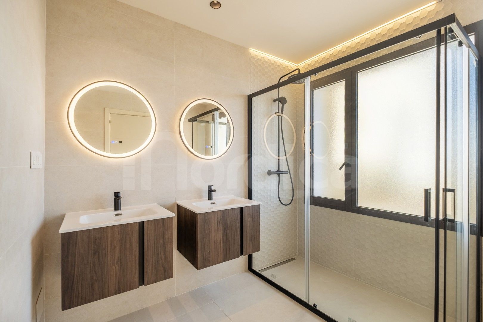 Aus jedem Blickwinkel öffnet sich der Wohnraum zur Terrasse, wodurch der Raum mit Sonnenlicht durchflutet wird und ein perfekter Übergang zwischen Innen- und Außenbereich entsteht. Auf dieser Hauptebene befinden sich zwei Doppelschlafzimmer mit eigenen Badezimmern – eines davon ist derzeit als Büro gestaltet, kann aber problemlos wieder in ein Schlafzimmer umgewandelt werden.