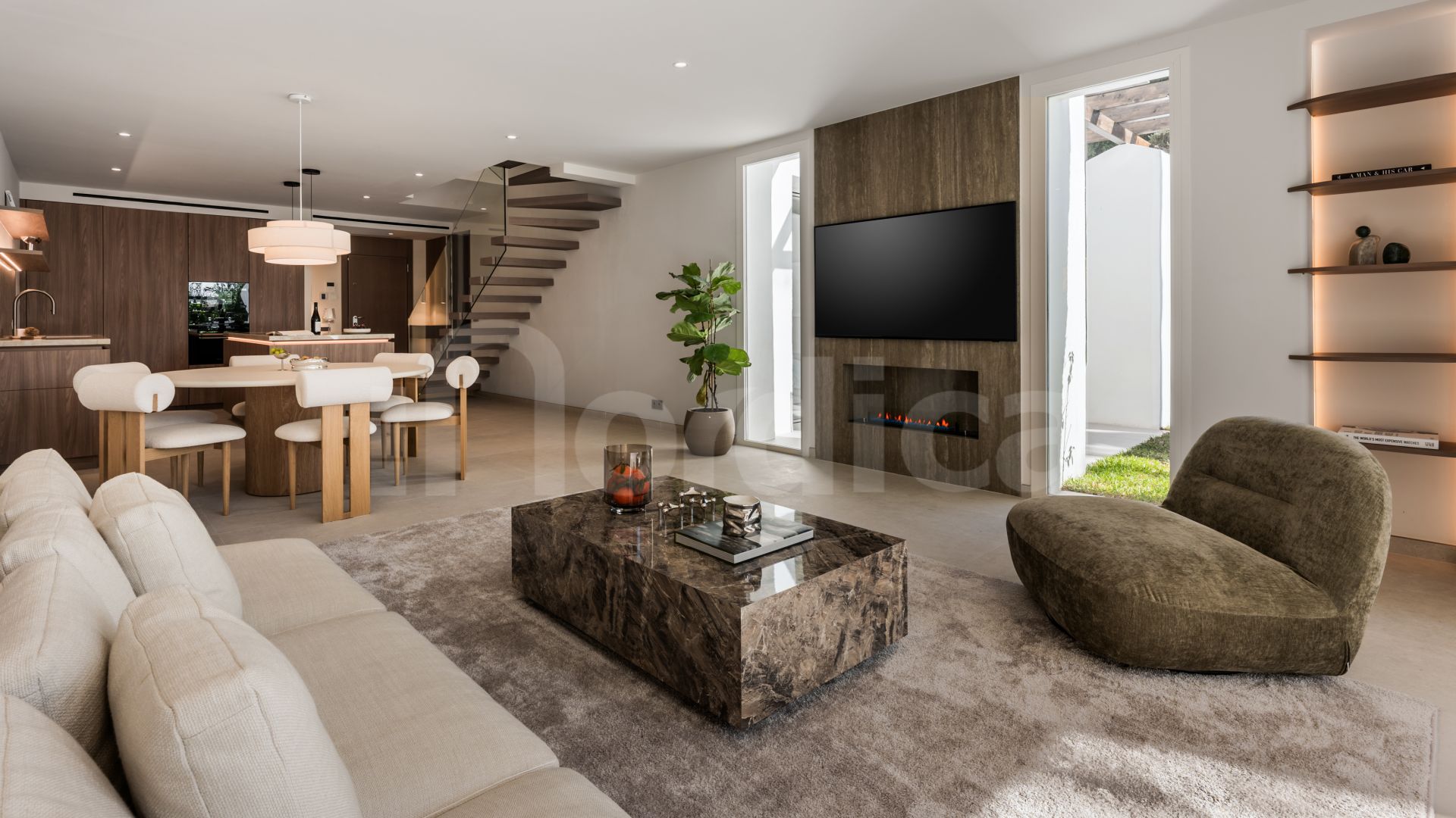 Das Innere besticht durch ein elegantes, zeitgenössisches Design mit hochwertigen Ausstattungen. Der offene Wohnbereich umfasst eine Designerküche, einen Essbereich und ein helles Wohnzimmer, das sich zur Terrasse und zum Garten öffnet. Im Erdgeschoss befindet sich zudem ein luxuriöses Schlafzimmer mit eigenem Bad und Ankleidebereich.