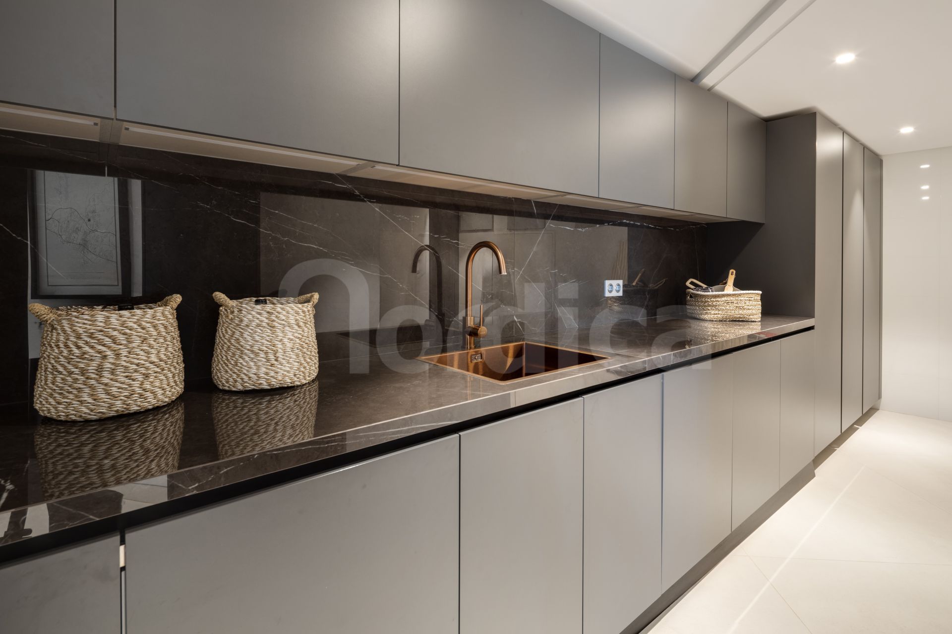 Im Herzen des Hauses befindet sich eine hochmoderne Küche, ausgestattet mit erstklassigen Snaidero-Einbauten, entworfen von Paolo Pininfarina – bekannt für seine Arbeit mit Ferrari – in Zusammenarbeit mit Omeo Design. Diese moderne Küche ist sowohl funktional als auch optisch beeindruckend und ideal, um Gäste zu bewirten oder Familienmahlzeiten zu genießen.