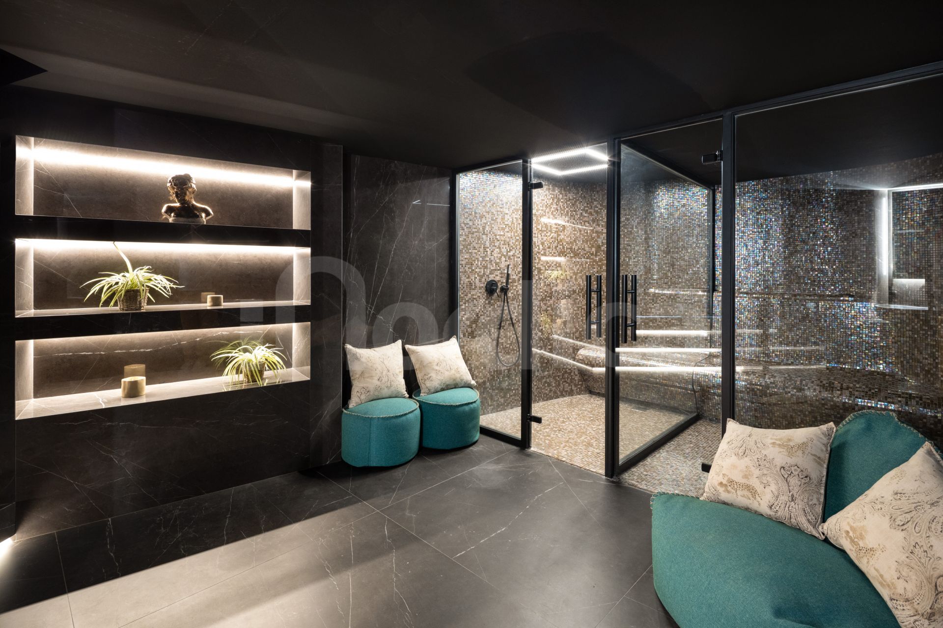 Das Untergeschoss bietet zusätzliche Bereiche für Freizeit und Komfort, darunter ein privates Kino und einen maßgefertigten Weinkeller. Im Außenbereich umgeben die angelegten Gärten einen ruhigen Infinity-Salzwasserpool, einen Whirlpool und eine stilvolle Chill-out-Zone mit Feuerstelle – perfekt, um die entspannte Atmosphäre zu genießen. Ein automatisches Bewässerungssystem sorgt das ganze Jahr über für mühelose Gartenpflege.