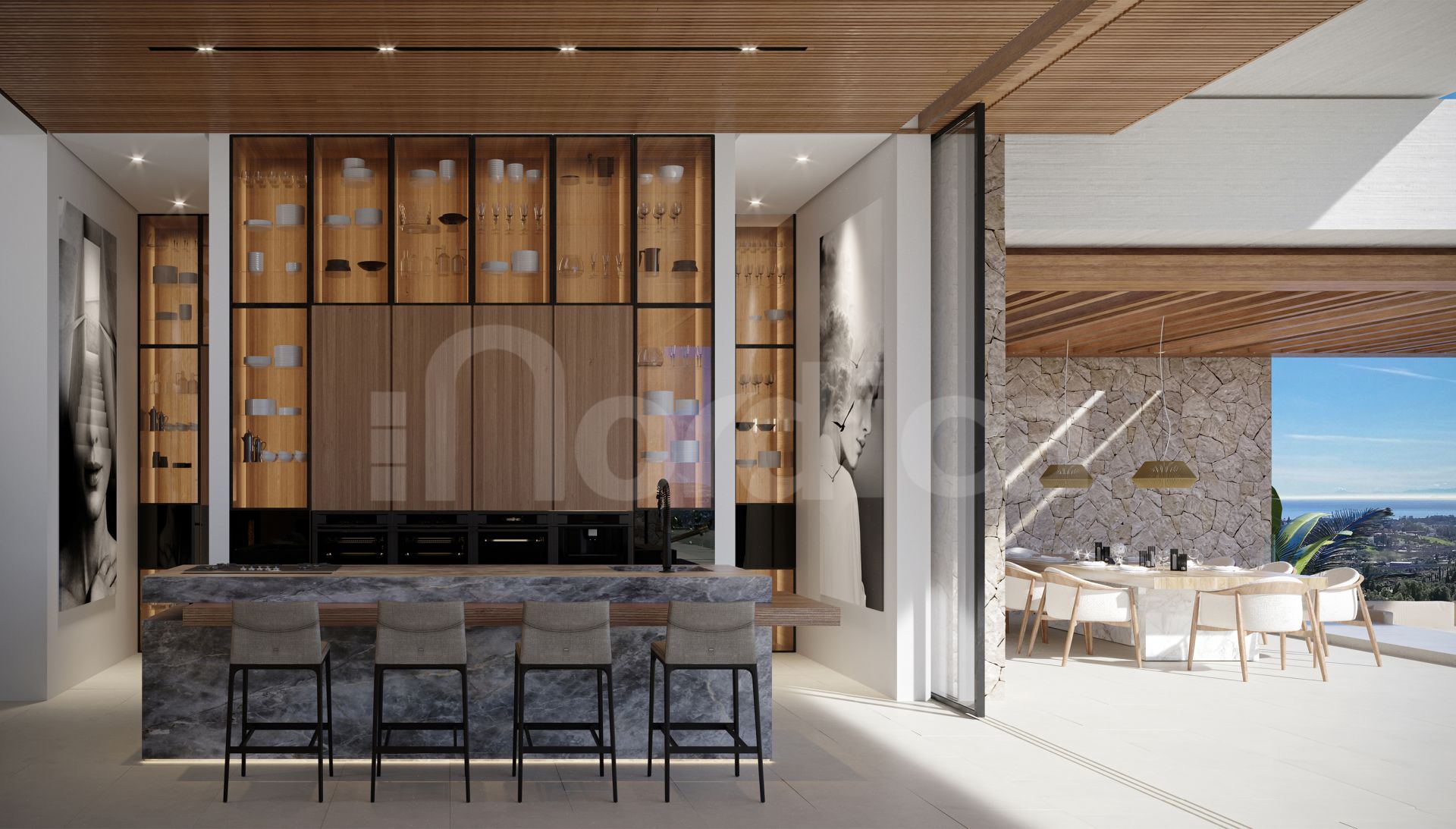 Die Innenräume sind mit höchster Präzision geplant. Bodentiefe Fenster in den Hauptwohnräumen und Schlafzimmern lassen viel Tageslicht herein und rahmen die herrlichen Ausblicke ein. Die Villa wird zudem ein Hallenbad, ein privates Fitnessstudio und ein separates Büro mit eigenem Zugang umfassen – ideal für diskretes Arbeiten oder Besprechungen zu Hause.
