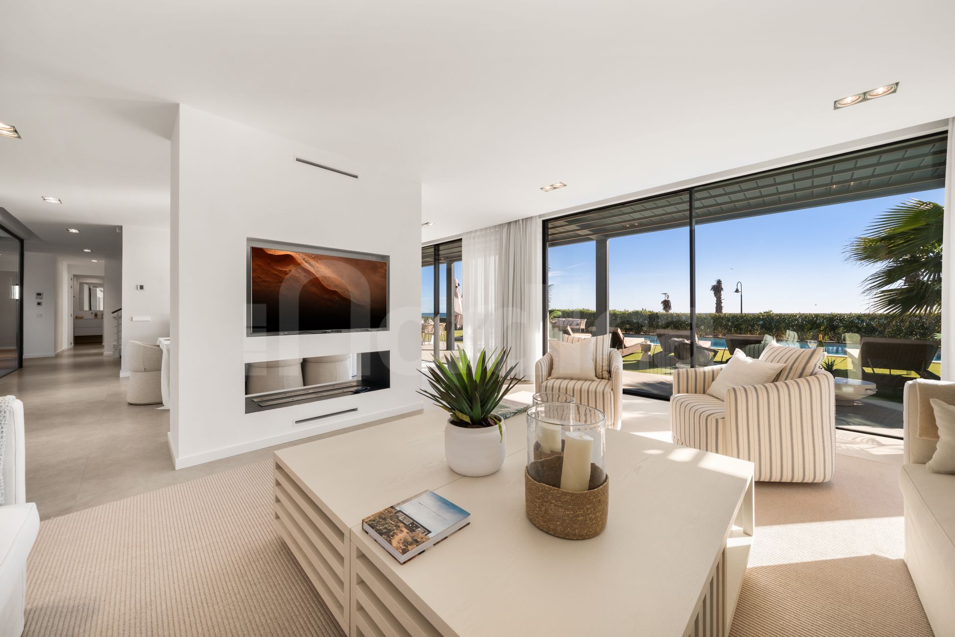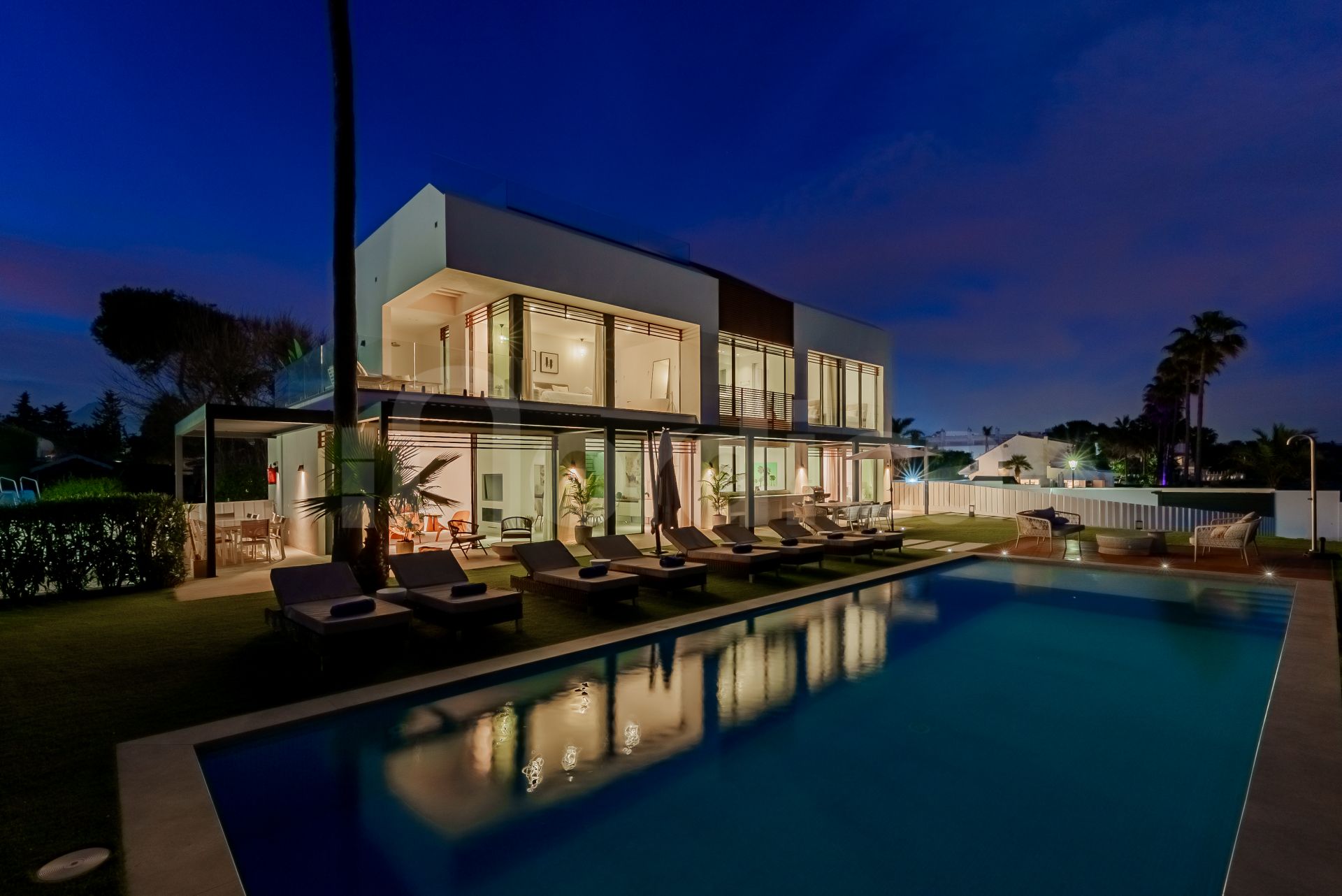 Diese zeitgenössische Vorzeigevilla befindet sich in privilegierter Strandlage in der New Golden Mile und bietet einen Panoramablick auf das Meer. Sie ist von einem weitläufigen privaten Garten mit großem Swimmingpool umgeben. Das ideale Familienanwesen bietet einen dynamischen Lebensstil im Freien mit direktem Zugang zum Strand vom Vorgarten aus. Beach House 1 präsentiert ein modernes, offenes Layout mit großen bodentiefen Fenstern, die viel Licht in die Immobilie lassen. Die Villa verfügt über zeitgenössische Innenräume gepaart mit hochwertigen Oberflächen. Sie bietet 5 geräumige Schlafzimmer, alle mit en-suite Badezimmern, jedes mit wunderschönem Meerblick. Ein fantastisches Merkmal dieser Immobilie ist die weitläufige Dachterrasse, die ultimative Unterhaltungsmöglichkeiten mit mehreren Lounge-Bereichen, einem Jacuzzi und dem atemberaubenden Panoramablick auf das Mittelmeer bietet. Auf der Kellerebene bietet dieses Anwesen ein luxuriöses Spa mit beheiztem Innenpool und Sauna. Gelegen an der New Golden Mile in Playa del Saladillo, hat diese Immobilie direkten Zugang zu schönen breiten Stränden und herrlichen Sanddünen. In kurzer Gehweite finden Sie großartige Chiringuitos und nur 5 Gehminuten entfernt den Anantara (Villa Padierna) Beach Club. Mit dem Auto erreichen Sie San Pedro in 7 Minuten und Puerto Banus in nur 10 Minuten.