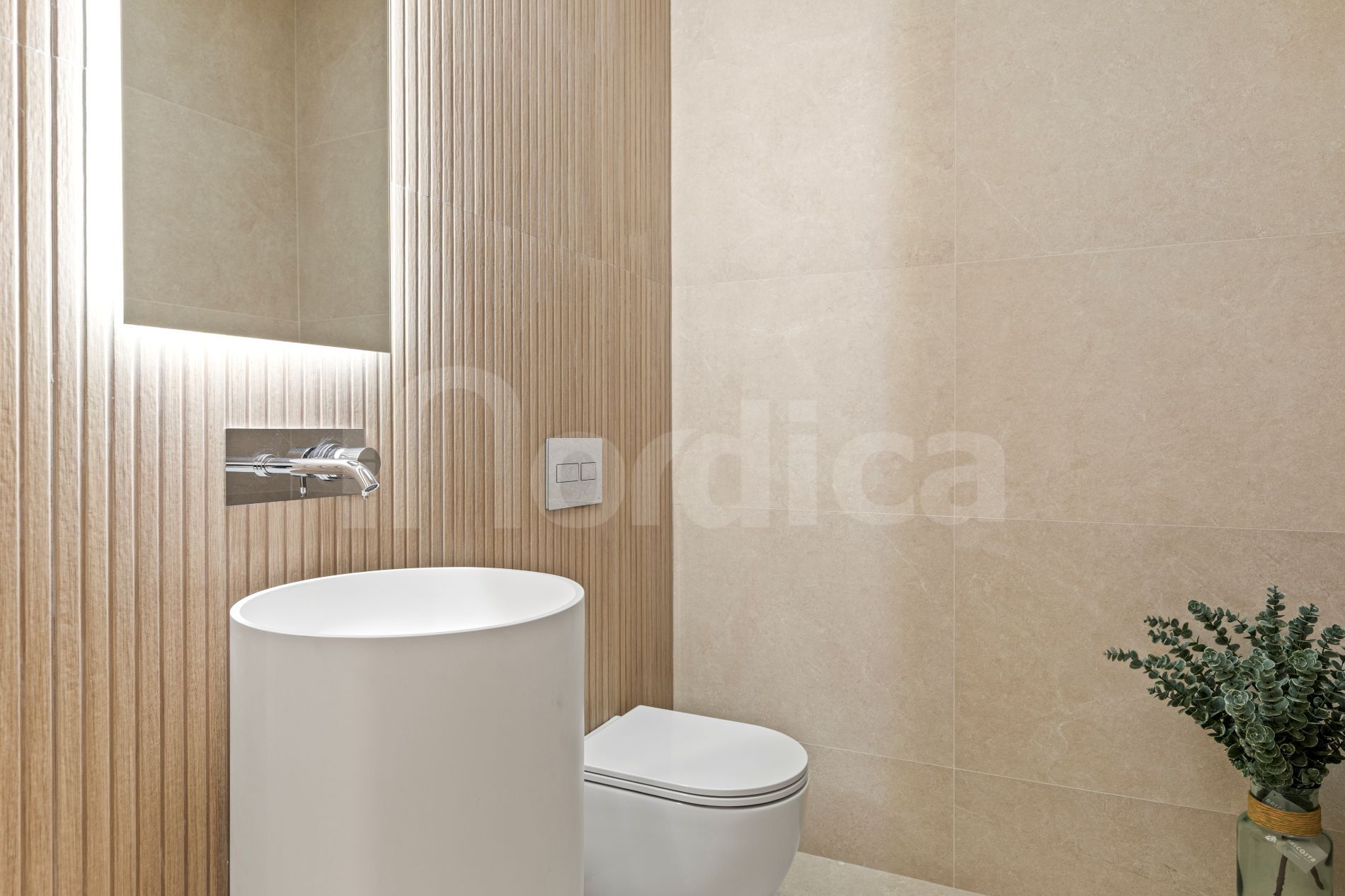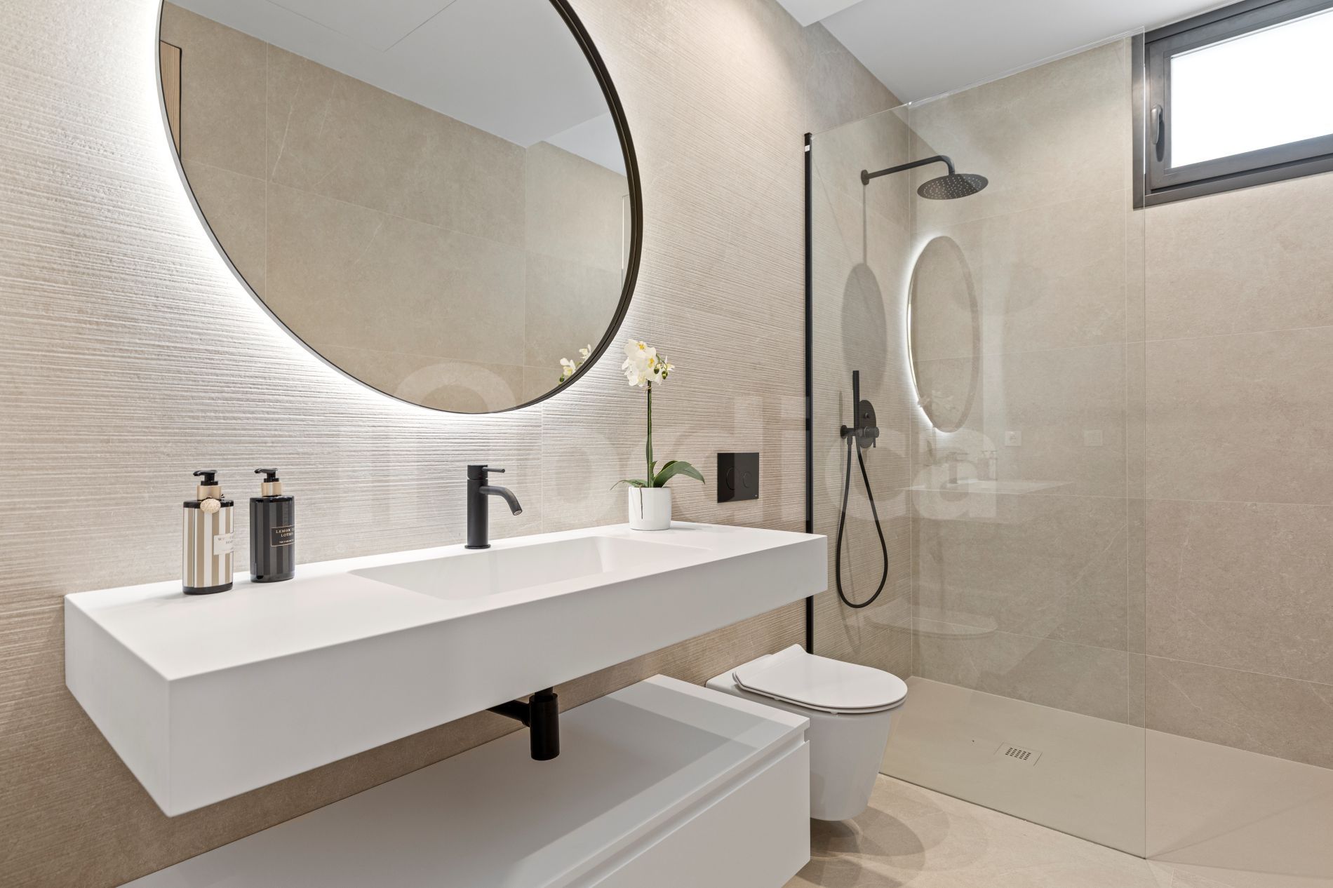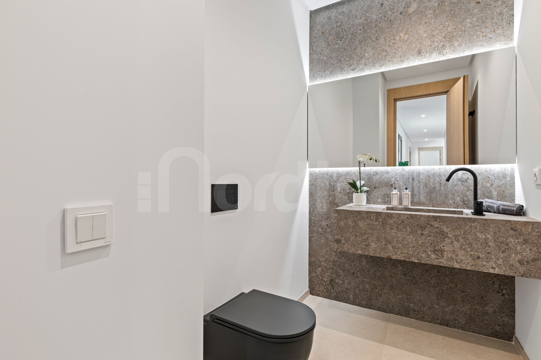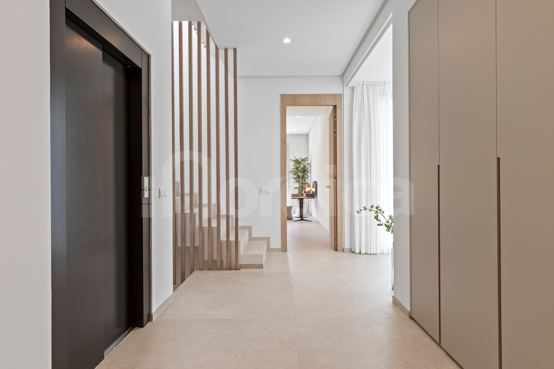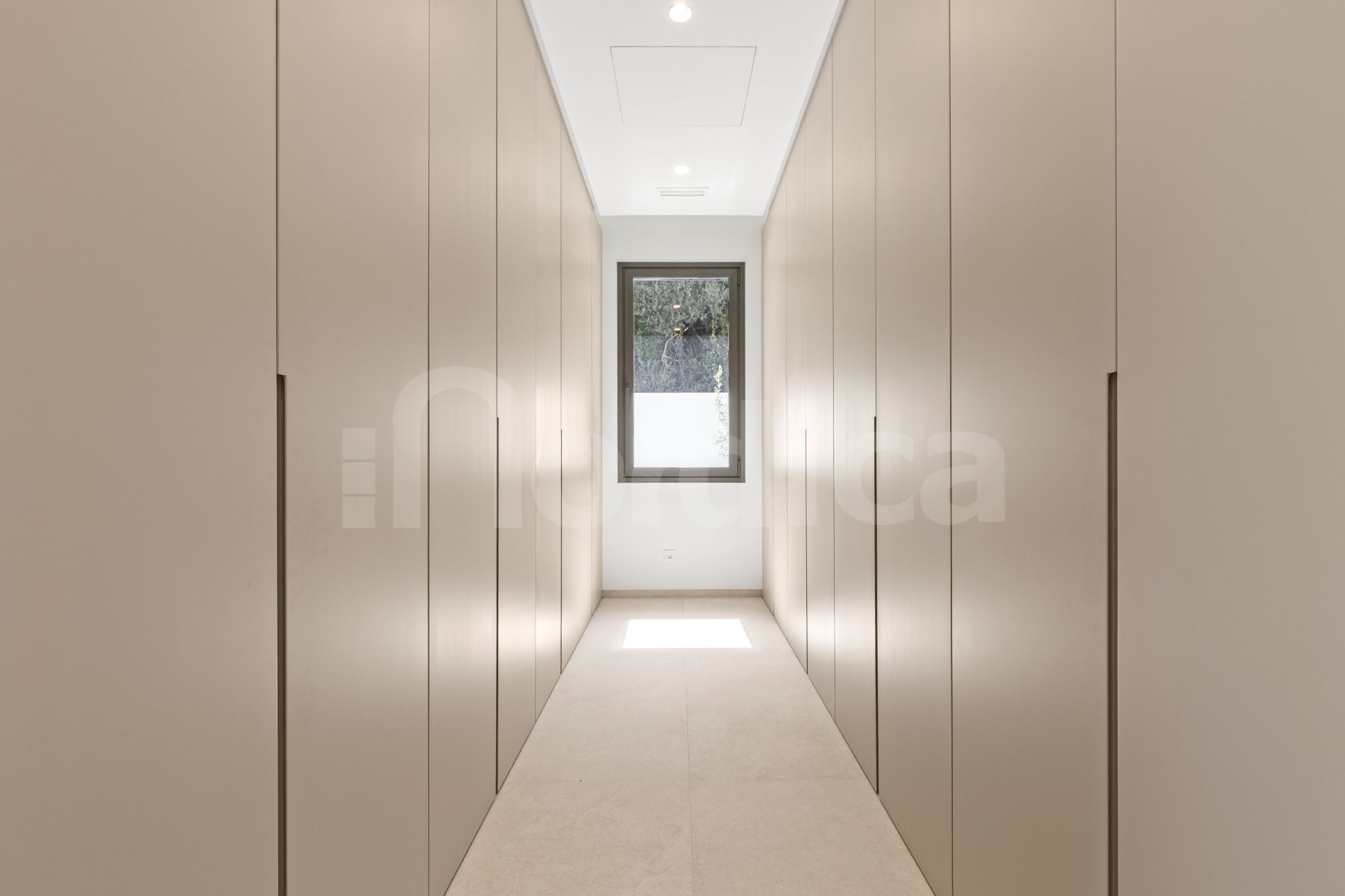 Die Villa erstreckt sich über drei Ebenen und verfügt über einen hellen, offenen Wohnbereich mit moderner Küche, die direkt auf die Terrasse, den angelegten Garten und den privaten Swimmingpool führt. Es stehen sechs großzügige Schlafzimmer, jeweils mit eigenem Bad, sowie zwei zusätzliche Gästetoiletten zur Verfügung. Die Master-Suite im ersten Obergeschoss bietet ein großzügiges Ankleidezimmer. Das Untergeschoss bietet einen großen, vielseitig nutzbaren offenen Raum, der sich ideal für ein Fitnessstudio, ein Heimkino, einen Spielbereich oder eine auf die Bedürfnisse des zukünftigen Eigentümers zugeschnittene Freizeitzone eignet.
