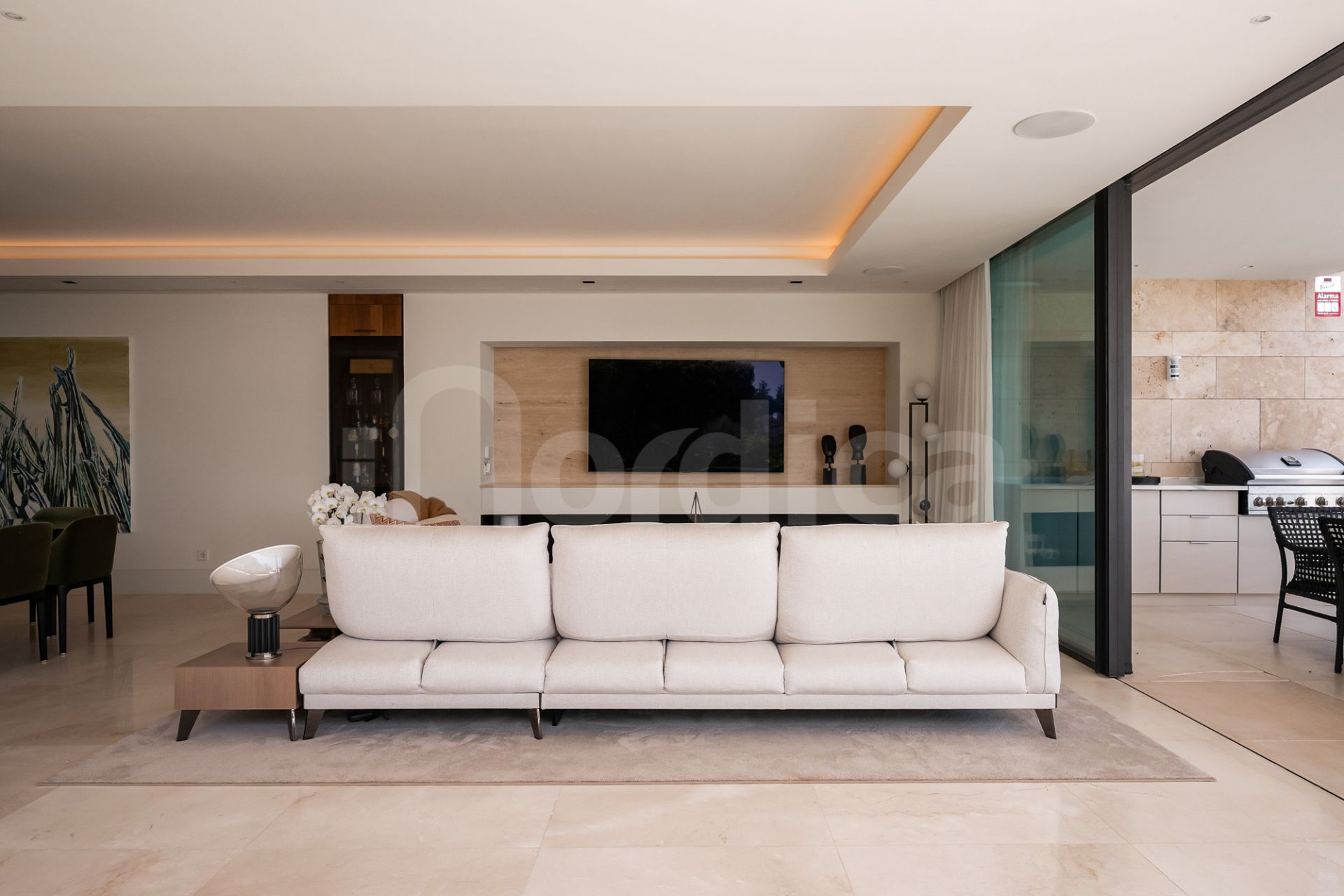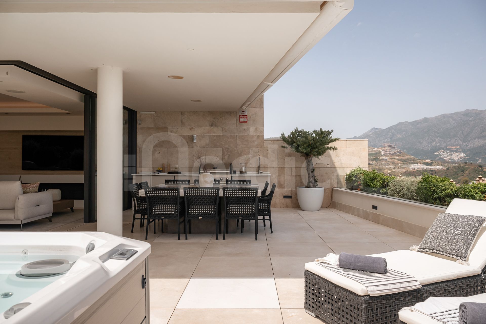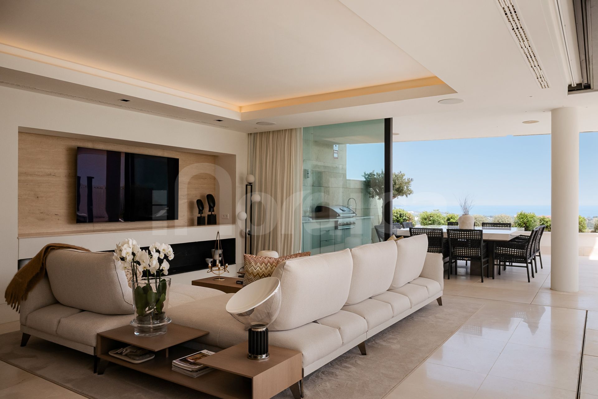 Ein zentraler Flur trennt die Wohn- und Privatbereiche durchdacht voneinander. Auf der einen Seite befinden sich die offenen Gesellschaftsräume mit einer Designerküche, ausgestattet mit Geräten von Gaggenau und Miele, einem beeindruckenden, raumhohen Weindisplay und vollautomatischen Fenstern, die sich komplett öffnen lassen und so den Innen- mit dem Außenbereich verbinden. Eine L-förmige Terrasse erstreckt sich vom Wohnbereich und bietet Meerblick sowie großzügige Flächen zum Entspannen und Speisen, ergänzt durch einen Whirlpool, eine Außendusche und eine Sommerküche. Üppige Bepflanzung verstärkt das Gefühl von Privatsphäre und schafft die Atmosphäre einer freistehenden Villa.