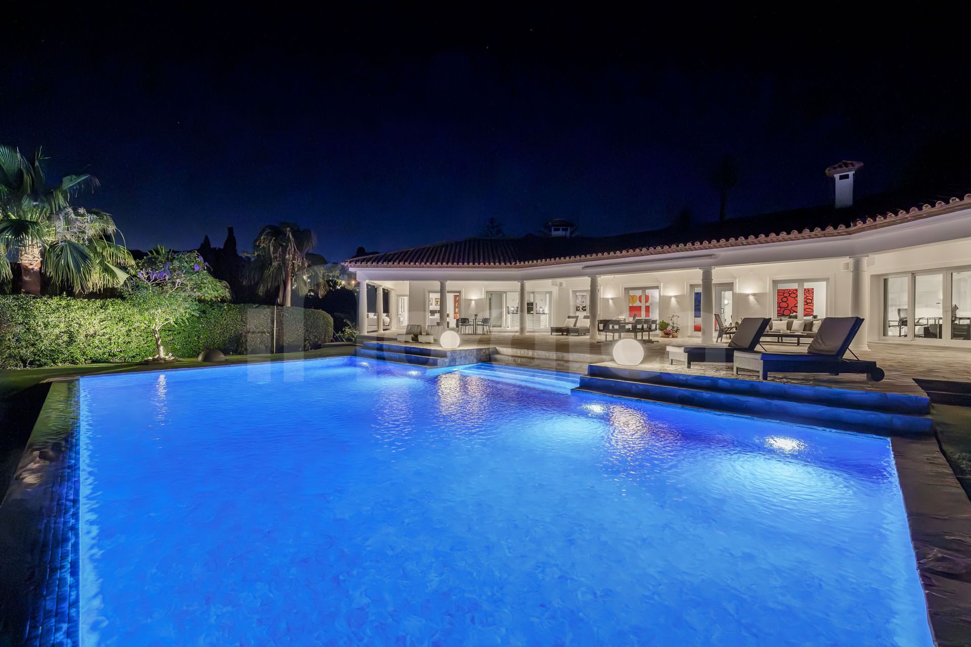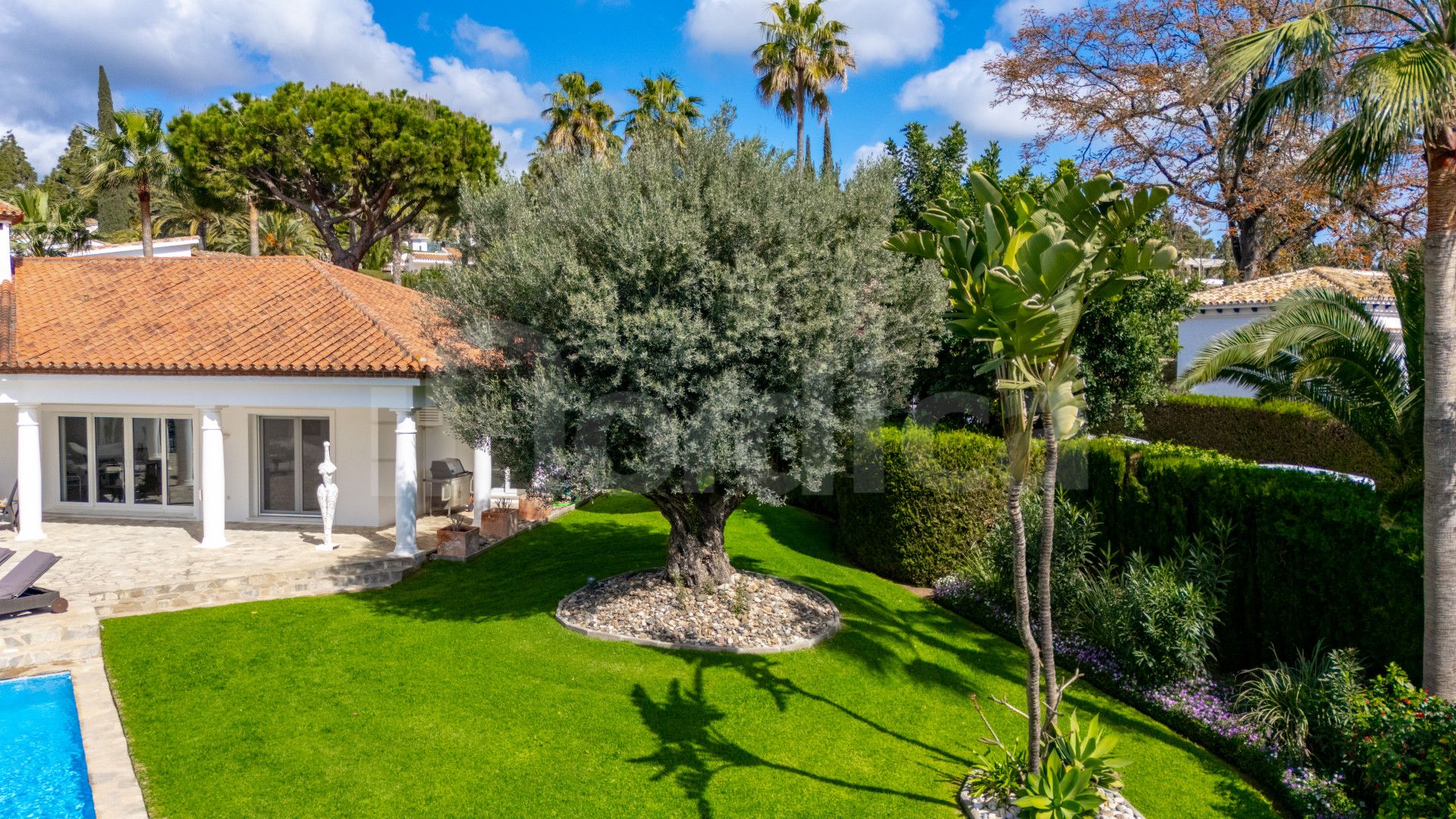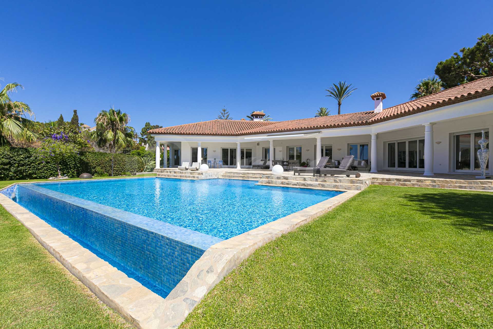 Entdecken Sie diese nach Süden ausgerichtete Villa zum Verkauf in Hacienda Las Chapas, Marbella. Diese wunderschöne Immobilie befindet sich in einer äußerst begehrten Lage, nur wenige Augenblicke entfernt von erstklassigen Schulen, Golfplätzen, Geschäften, Restaurants, dem Strand und bietet rund um die Uhr Sicherheit vor Ort. Die Hauptvilla ist durchdacht auf einer einzigen Ebene angelegt. Die nach Süden ausgerichtete Ausrichtung der Immobilie gewährleistet vollständige Privatsphäre und eine Fülle von natürlichem Licht den ganzen Tag über, während die großzügige Terrasse zum Essen im Freien und zur Unterhaltung im Freien einlädt. Im Inneren dient eine geräumige offene Küche und ein Wohn-/Essbereich als Herzstück des Hauses. Der Raum ist sowohl funktional als auch einladend, komplett mit einem gemütlichen Kamin und direktem Zugang zur Terrasse. Die Villa verfügt über vier geräumige Schlafzimmer, jedes mit eigenem Bad. Ein herausragendes Merkmal ist die Master-Suite, die mit einem begehbaren Kleiderschrank und direktem Zugang zum üppigen Garten ausgestattet ist.