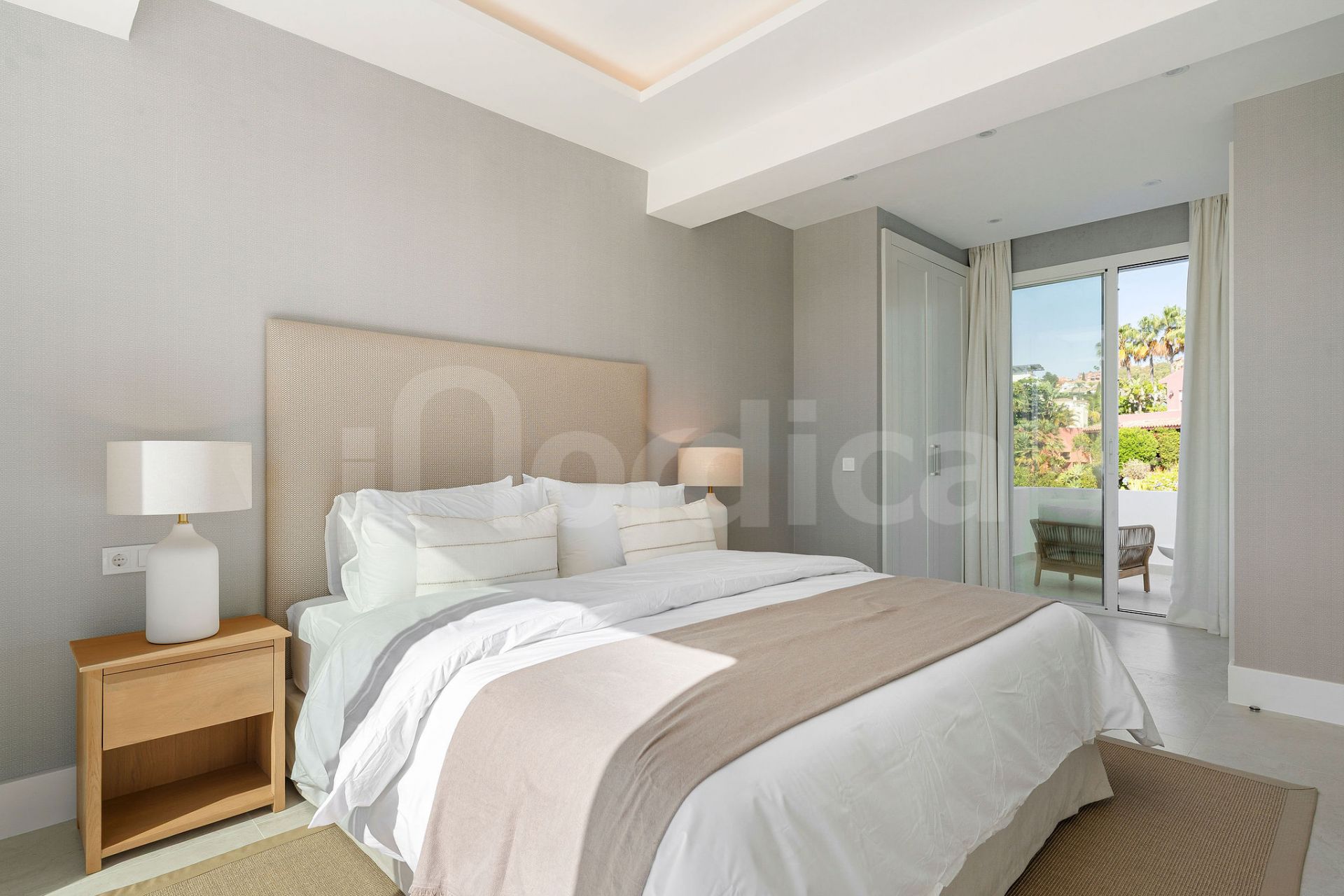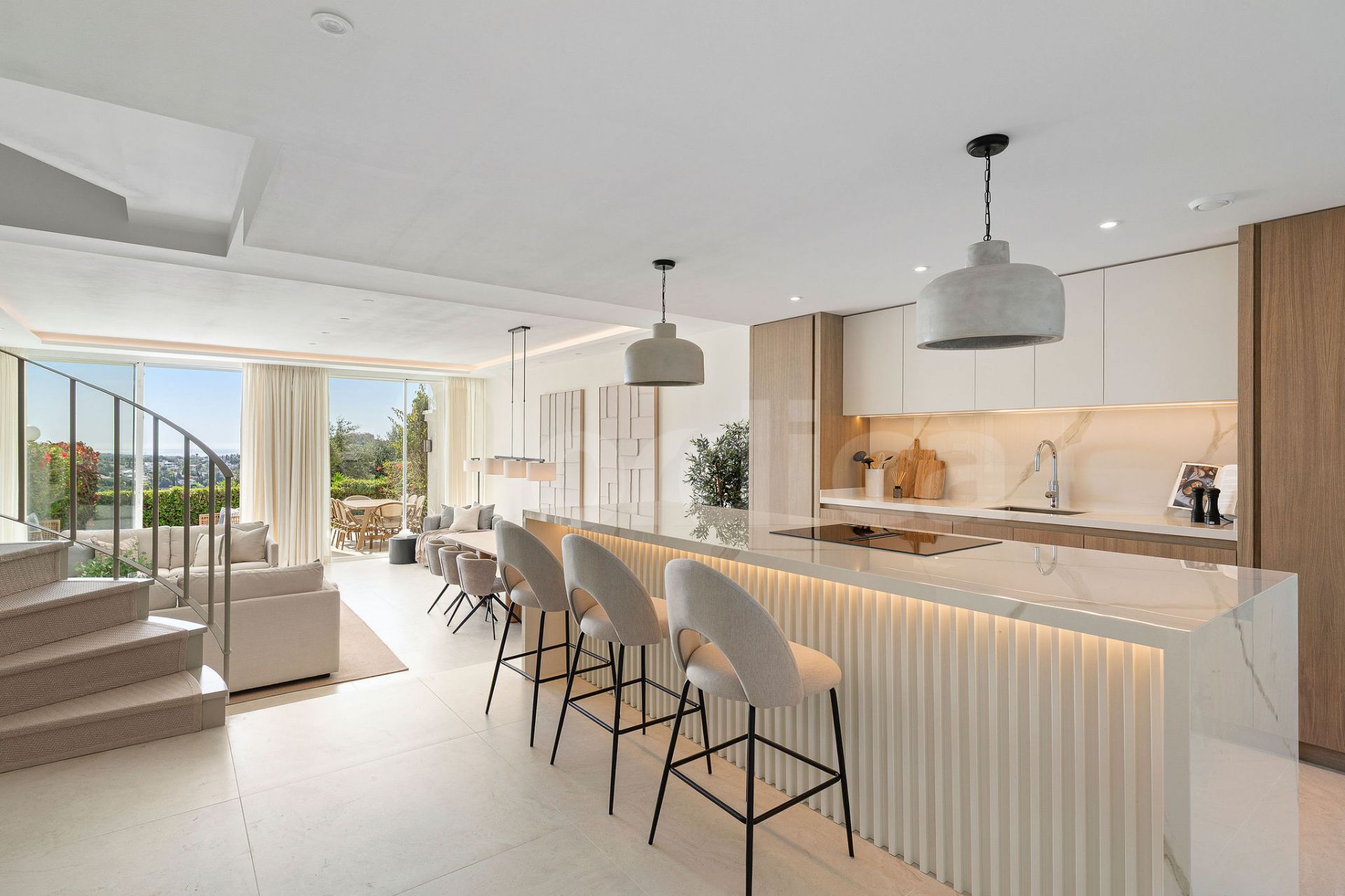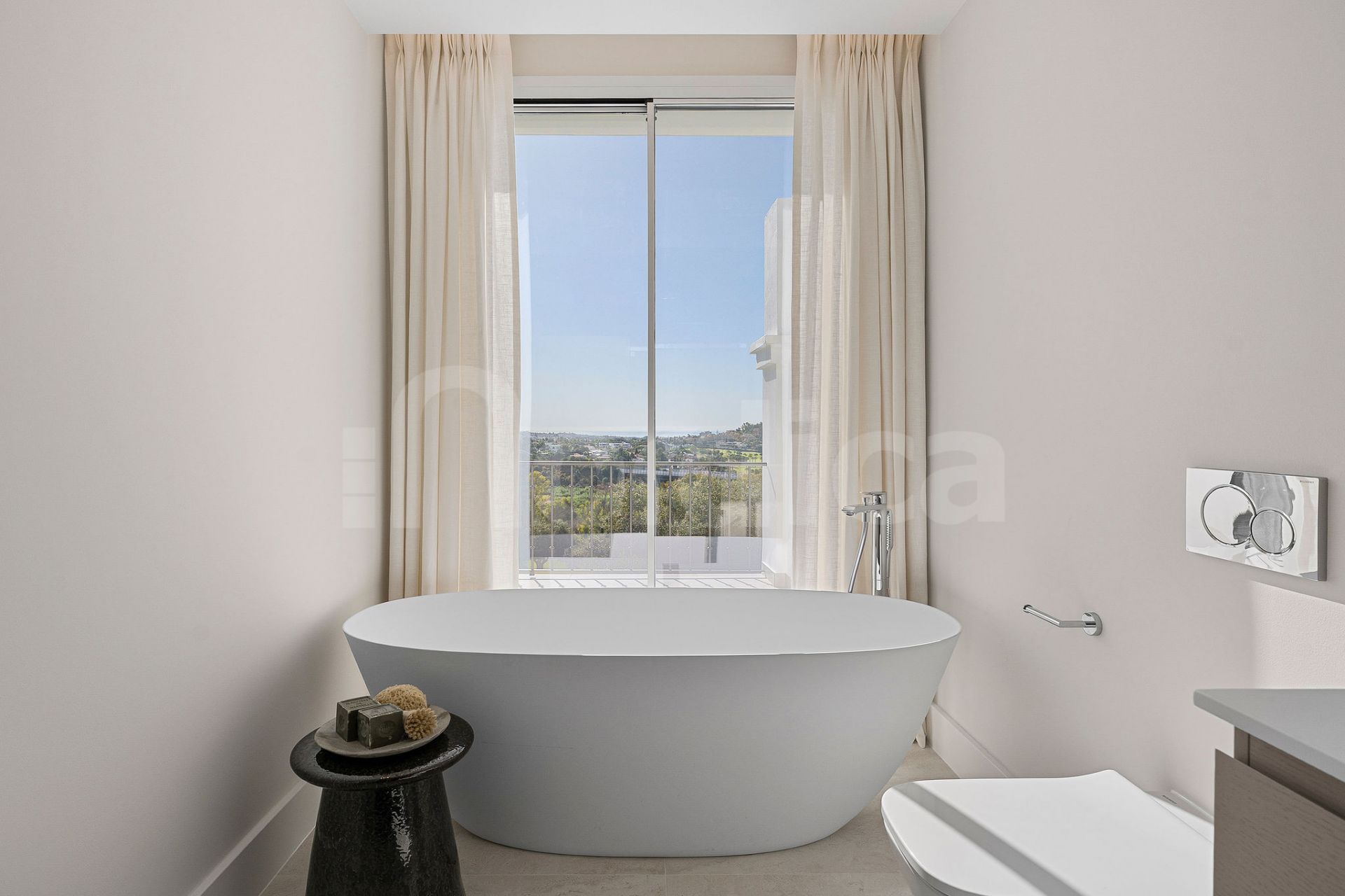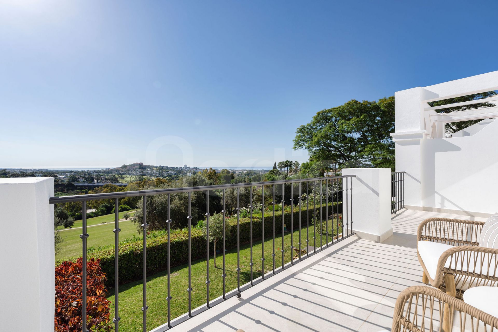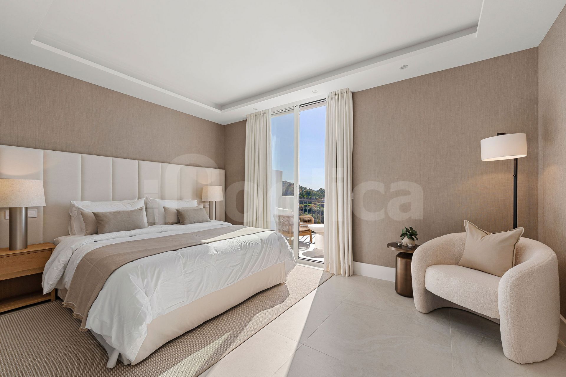 Im obersten Stockwerk genießt die vierte Schlafzimmersuite zwei private Terrassen mit Panoramablick über das Meer, den Golfplatz und die umliegenden Berge.