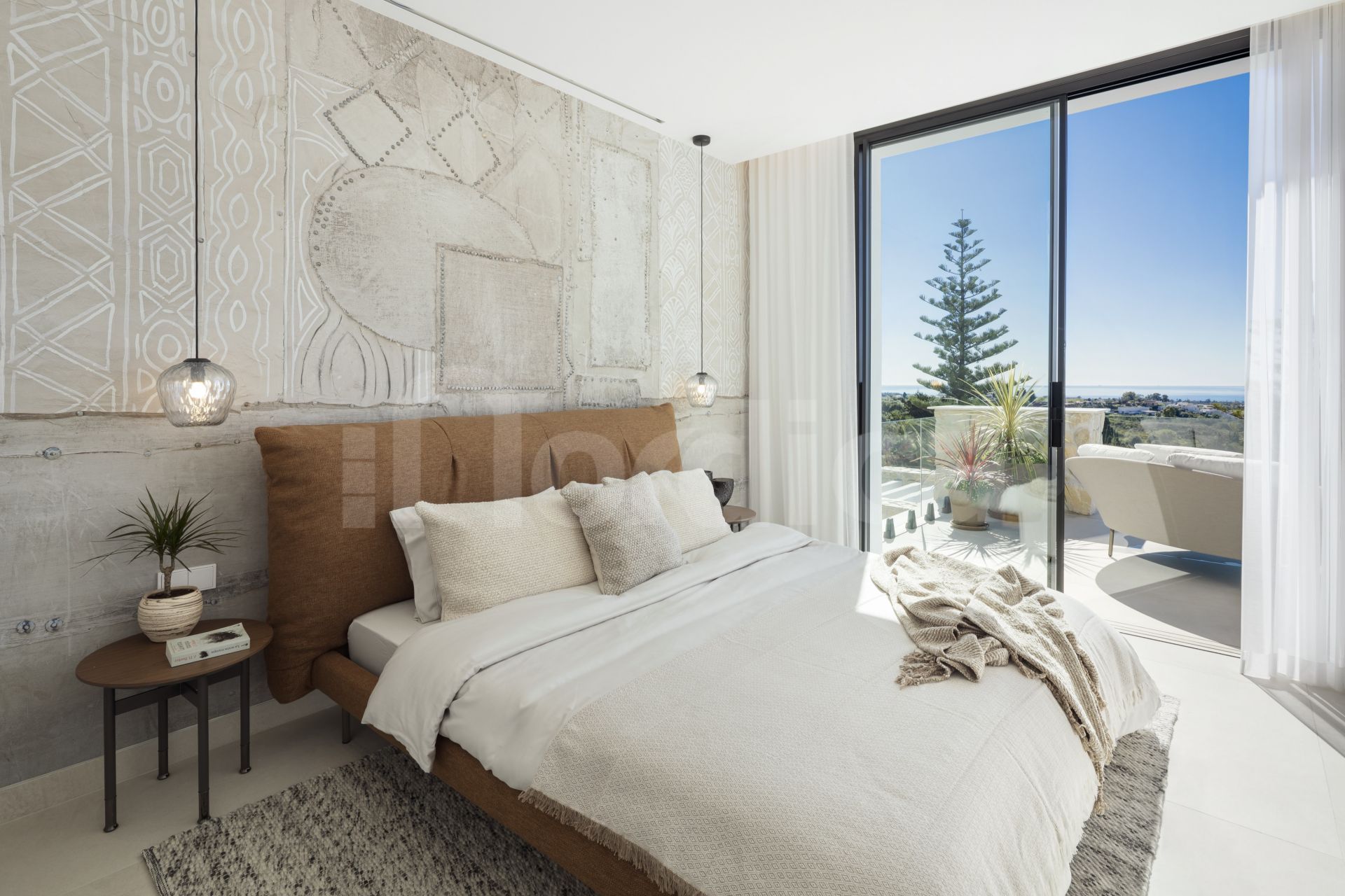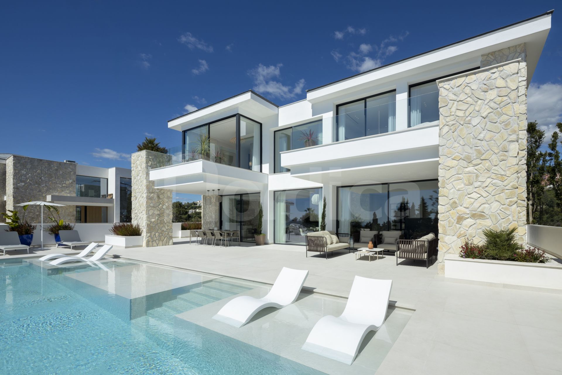 Diese kürzlich fertiggestellte, brandneue Villa mit hochwertiger Ausstattung befindet sich in einer exklusiven, abgeschlossenen Wohnanlage mit nur drei Luxusresidenzen im begehrten Gebiet von La Quinta. Auf drei Ebenen verteilt, vereint dieses beeindruckende Fünf-Schlafzimmer-Anwesen anspruchsvolles Innendesign mit höchstem Wohnkomfort im Freien und bietet atemberaubende Panoramablicke auf die umliegenden Berge und das Meer.