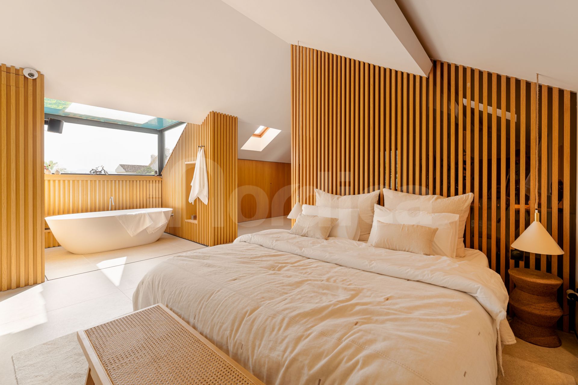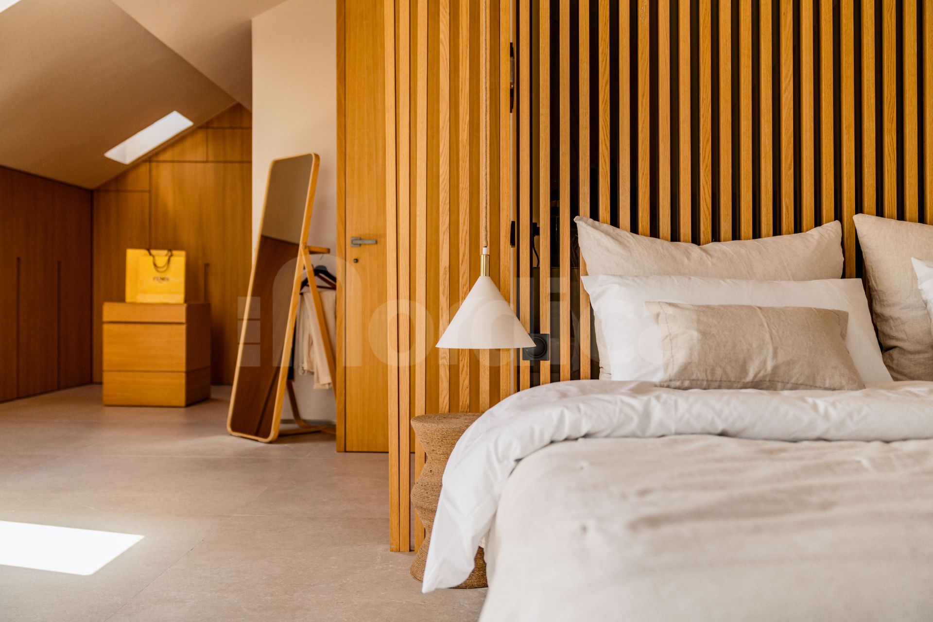 Eine interne Treppe führt in das Obergeschoss, wo sich die Master Suite befindet, die Privatsphäre und Ruhe bietet und über einen französischen Balkon direkten Zugang zur Terrasse hat.