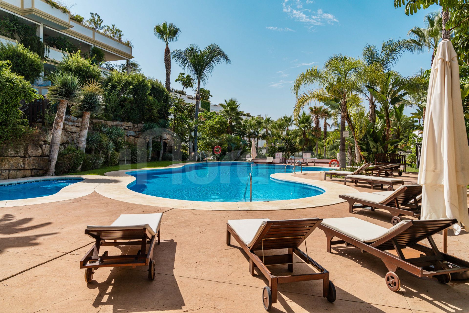 Willkommen im Penthouse Estelle, einem luxuriösen, dreischlafzimmerigen Duplex-Apartment zum Verkauf in Las Lomas del Rey, einer sicheren und prestigeträchtigen Urbanisation, die ideal an Marbellas exklusiver Goldener Meile gelegen ist. Das 2006 erbaute und kürzlich renovierte, elegante Anwesen vereint zeitgenössische Ausstattungen mit praktischem Luxus. Dank der erhöhten Lage genießt das Apartment einen ununterbrochenen Blick auf den umliegenden La Concha Berg und die Gemeinschaftsgärten.