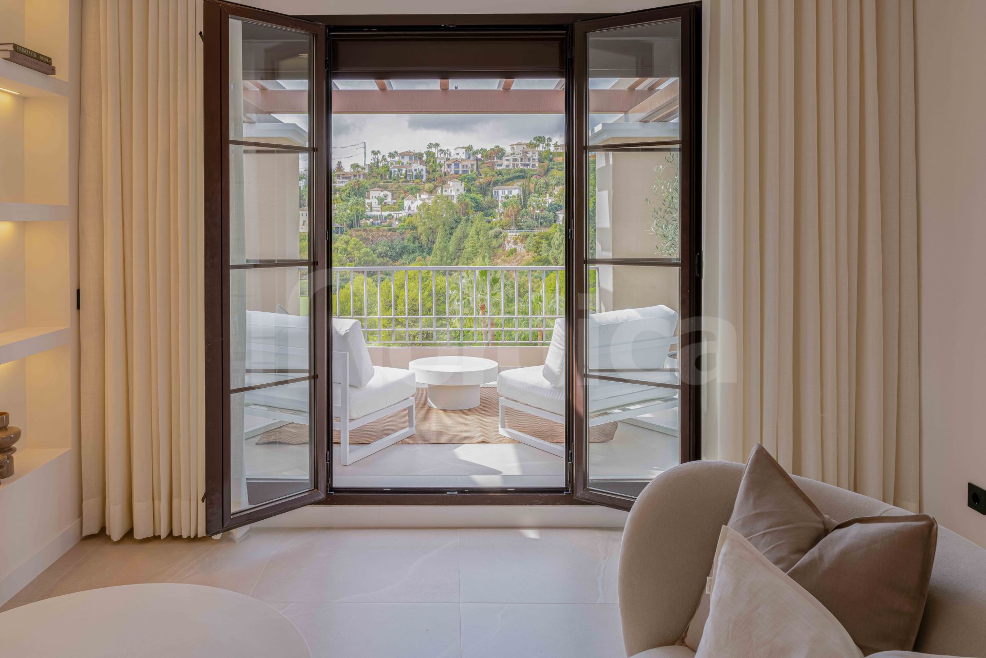 Die großzügige 31,5 m² große Terrasse bietet einen Panoramablick über den Golfplatz und das Mittelmeer – der ideale Ort, um sich zu entspannen und die Sonne zu genießen.