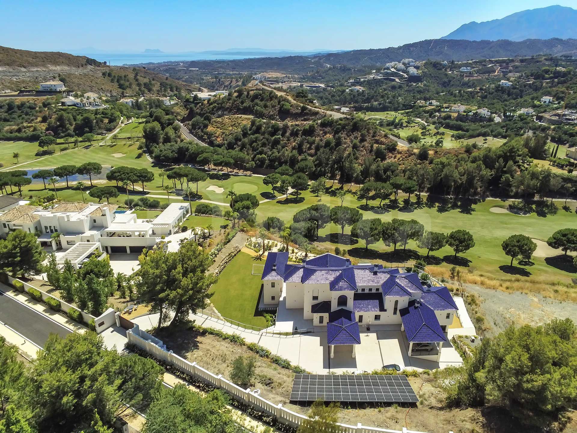 Durch imposante private Tore gelangt man zur Villa, wobei sich ein malerischer Aussichtspunkt eröffnet, der ideal ist, um das Panorama des Mittelmeers und des Felsens von Gibraltar zu genießen. Die elegante weiße Fassade des Hauses und die ausgewogene architektonische Gestaltung vermitteln beim Betreten des überdachten Eingangs sofort ein Gefühl zeitloser Raffinesse.