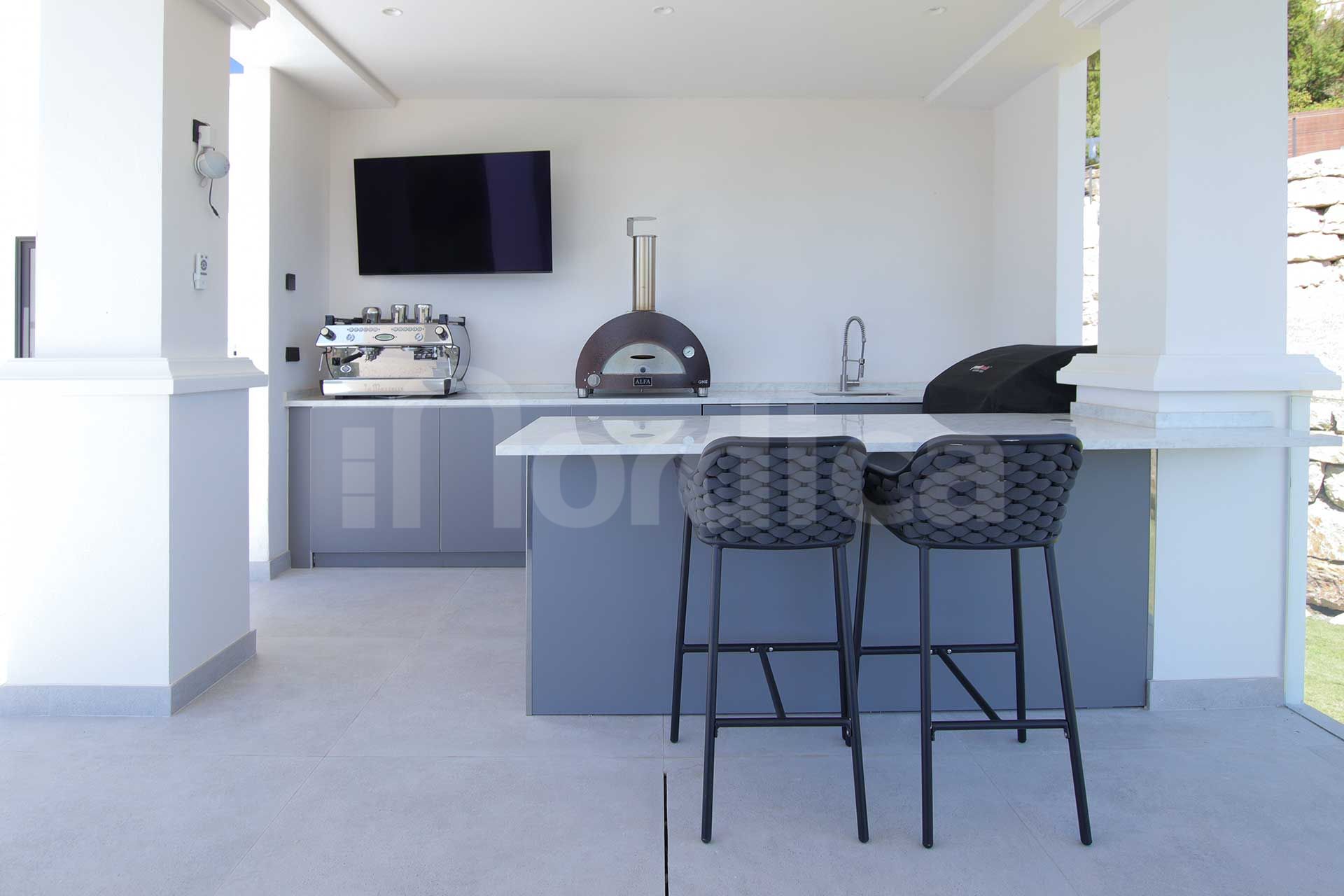 Das Erdgeschoss öffnet sich nahtlos zu einer weitläufigen, überdachten Terrasse mit Blick auf den beheizten Infinity-Pool und die umliegende Landschaft. Dieser Außenbereich eignet sich perfekt für geselliges Beisammensein und bietet stilvolle Sitz- und Essbereiche, eine voll ausgestattete Außenküche mit Pizzaofen und Grill sowie eine professionelle Kaffeemaschine. Die angelegten Gärten sind wunderschön gestaltet und verfügen über Spazierwege, eine ebene Rasenfläche, die sich ideal für Sport oder Familienaktivitäten eignet, sowie mehrere Bereiche zum Entspannen und Genießen der ruhigen Umgebung.