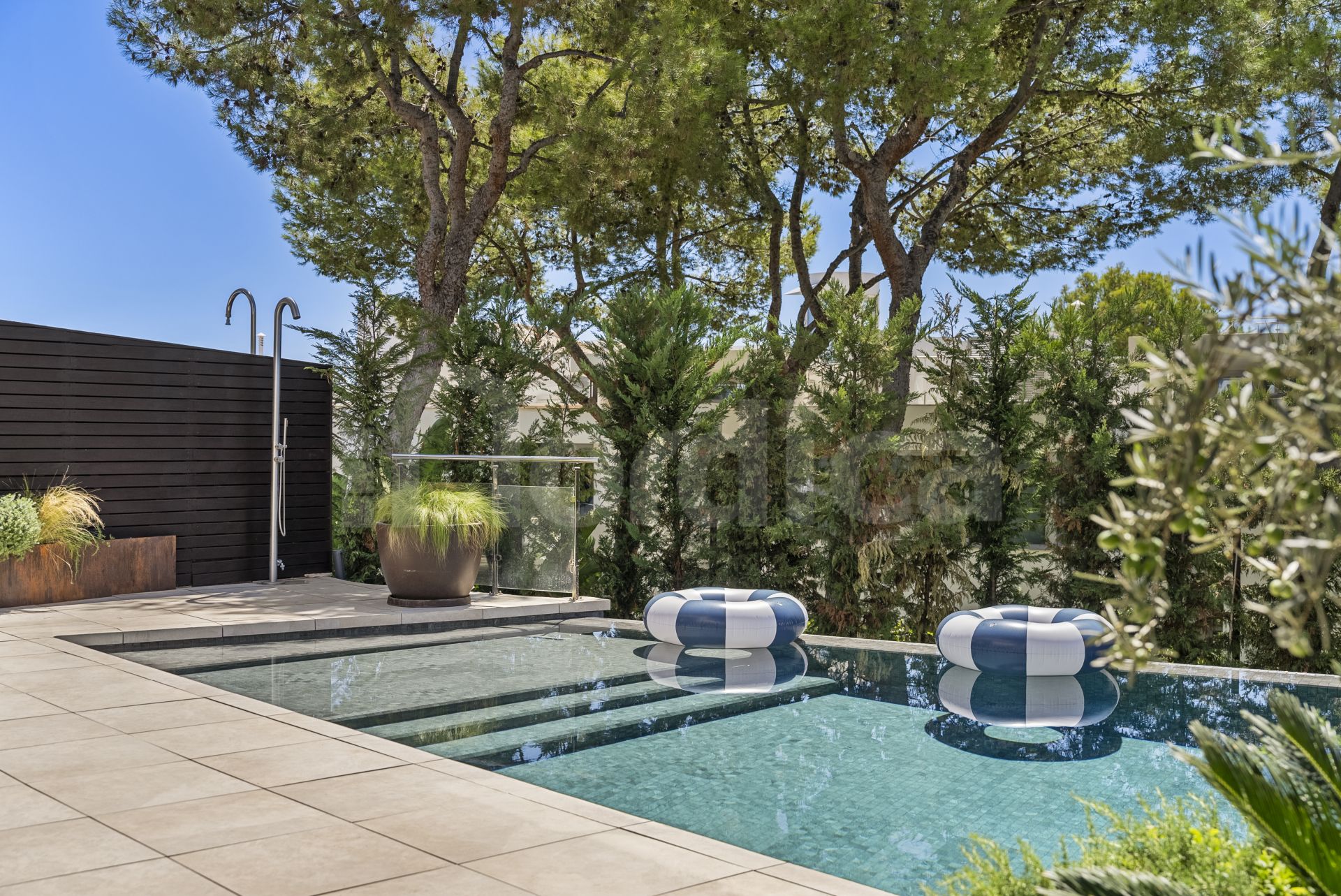 Das Haus erstreckt sich über vier großzügige Ebenen, die alle durch einen privaten Aufzug verbunden sind und so einen nahtlosen Zugang vom Eingangsbereich bis zur Dachterrasse ermöglichen. Die Wohnbereiche verteilen sich auf zwei Ebenen und sind sowohl für Entspannung als auch für Unterhaltung konzipiert. Sie bieten großzügige, offene Räume und eine große, nach Süden ausgerichtete Terrasse mit privatem Swimmingpool und maßgefertigten Ausstattungen. Die Dachterrasse bietet den idealen Rahmen, um den Sonnenuntergang über der Küste zu genießen – ausgestattet mit einer Außenküche und einem Jacuzzi für höchsten Freizeitkomfort.