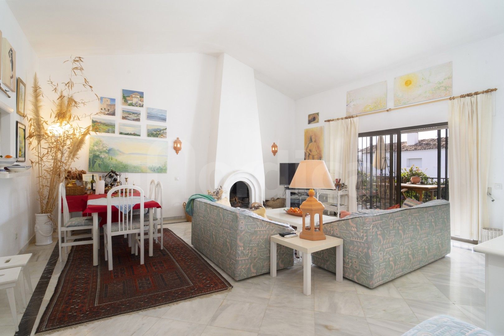 Das großzügige Wohn- und Esszimmer verfügt über hohe Decken und einen charmanten Kamin, der dem Zuhause Charakter und Wärme verleiht. Große Türen führen auf eine überdachte Terrasse mit Blick auf die angelegten Gärten, mit teilweisem Meerblick und teilweisem Bergblick, die das Gefühl von Weite und Ruhe verstärken.