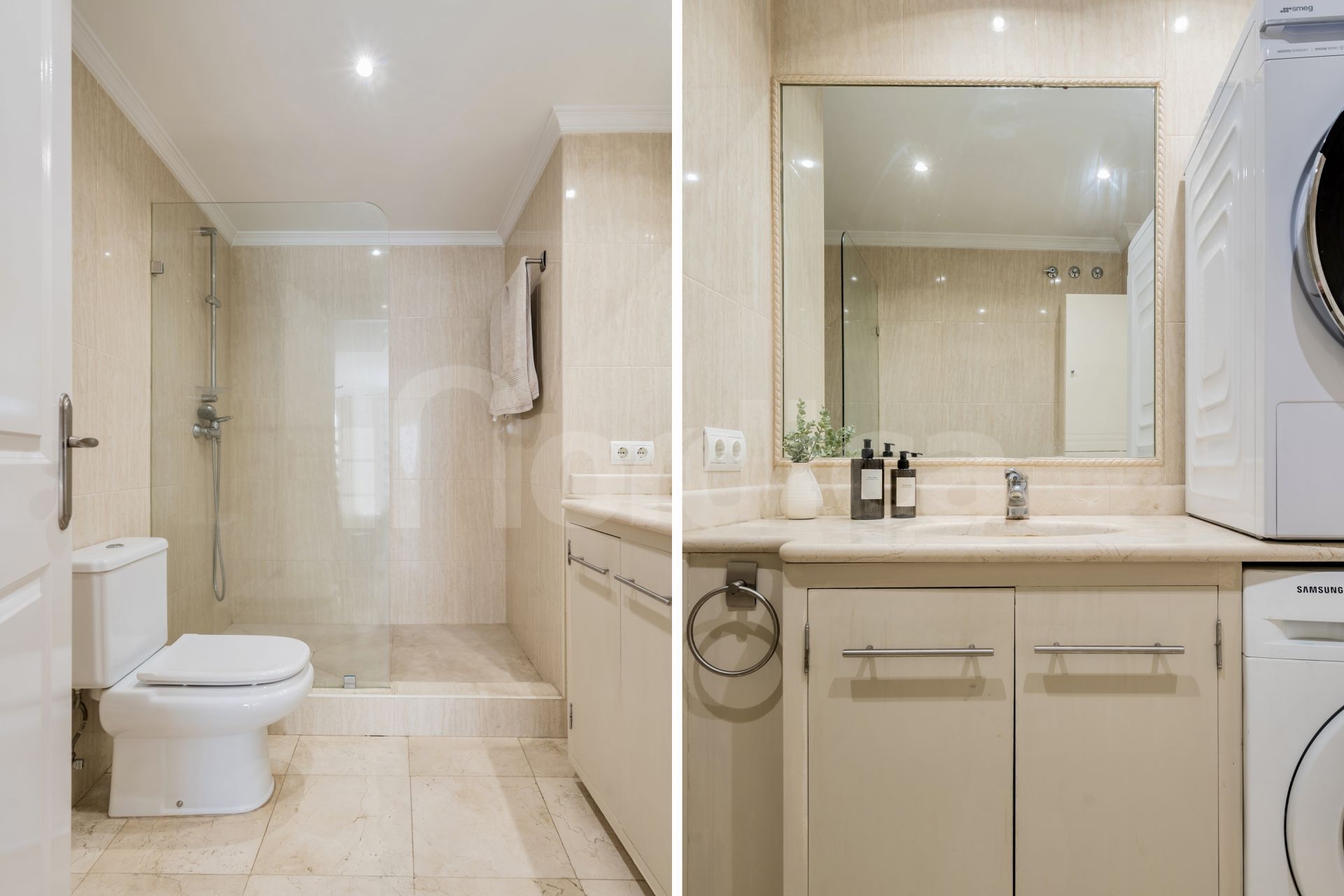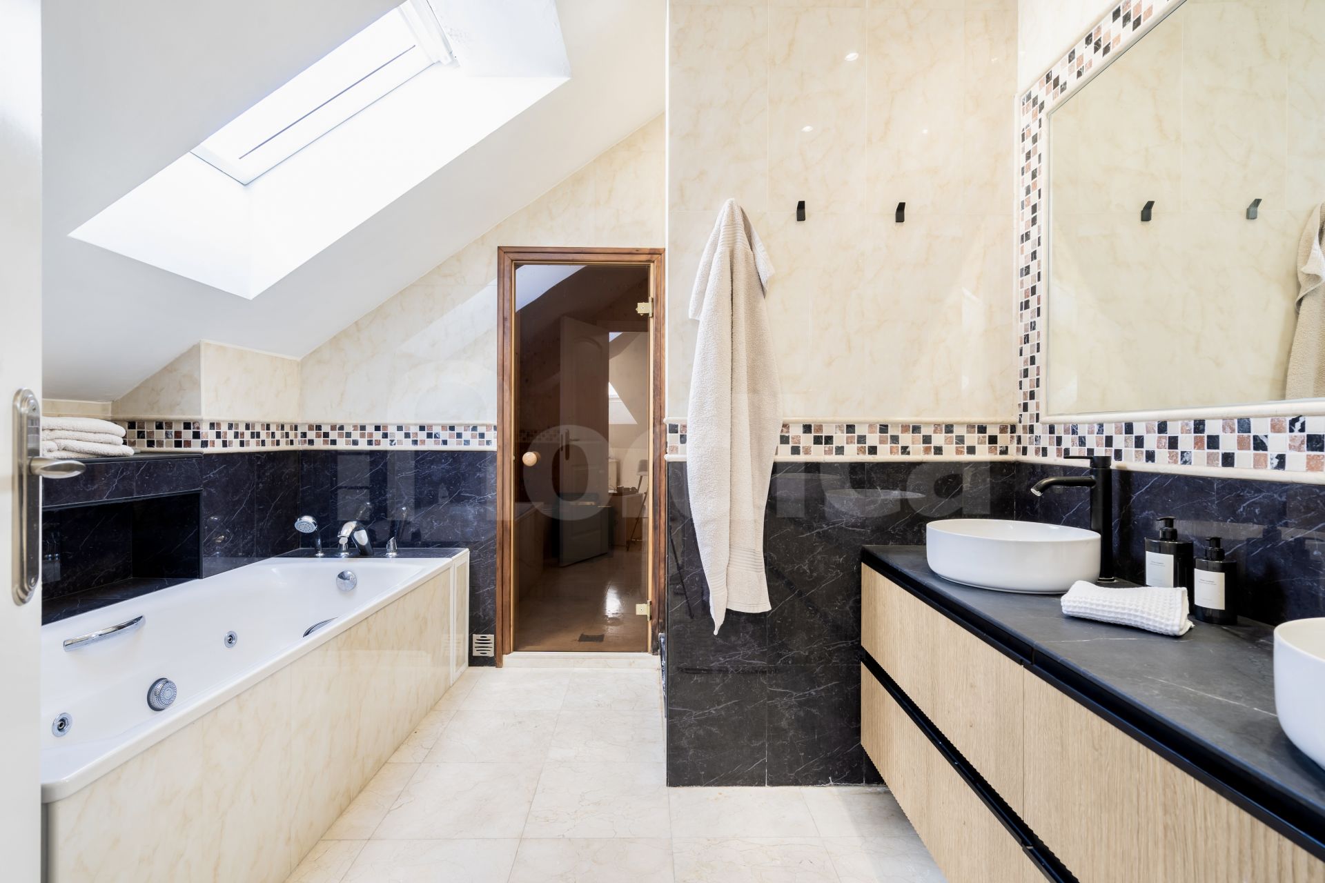 Die obere Ebene ist ausschließlich der beeindruckenden Master-Suite gewidmet und bietet einen privaten Rückzugsort. Das en-suite Badezimmer ist als persönlicher Wellnessbereich gestaltet und verfügt über eine Dusche, einen Whirlpool und eine kompakte Sauna für maximale Entspannung.