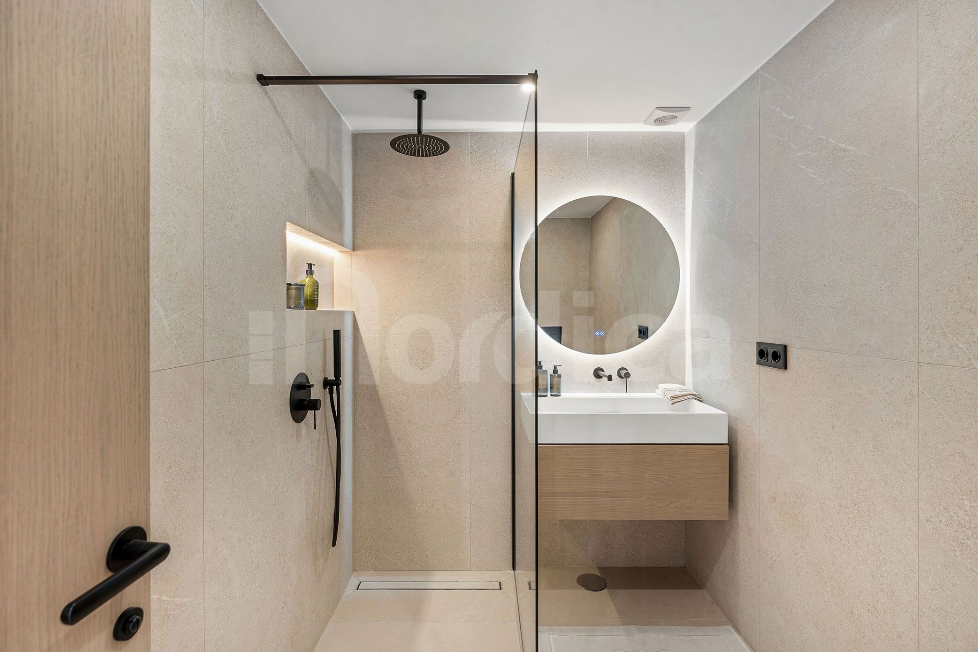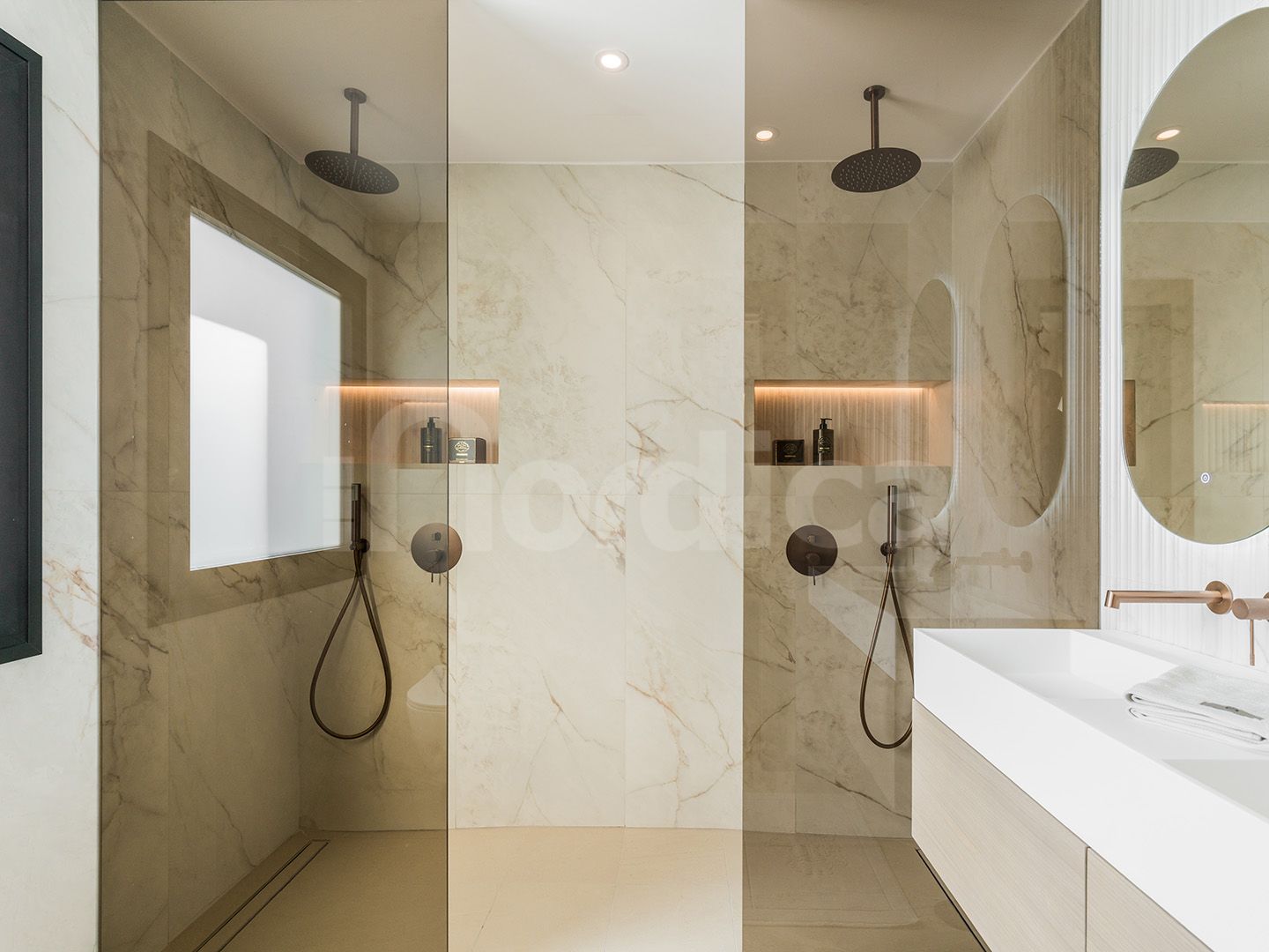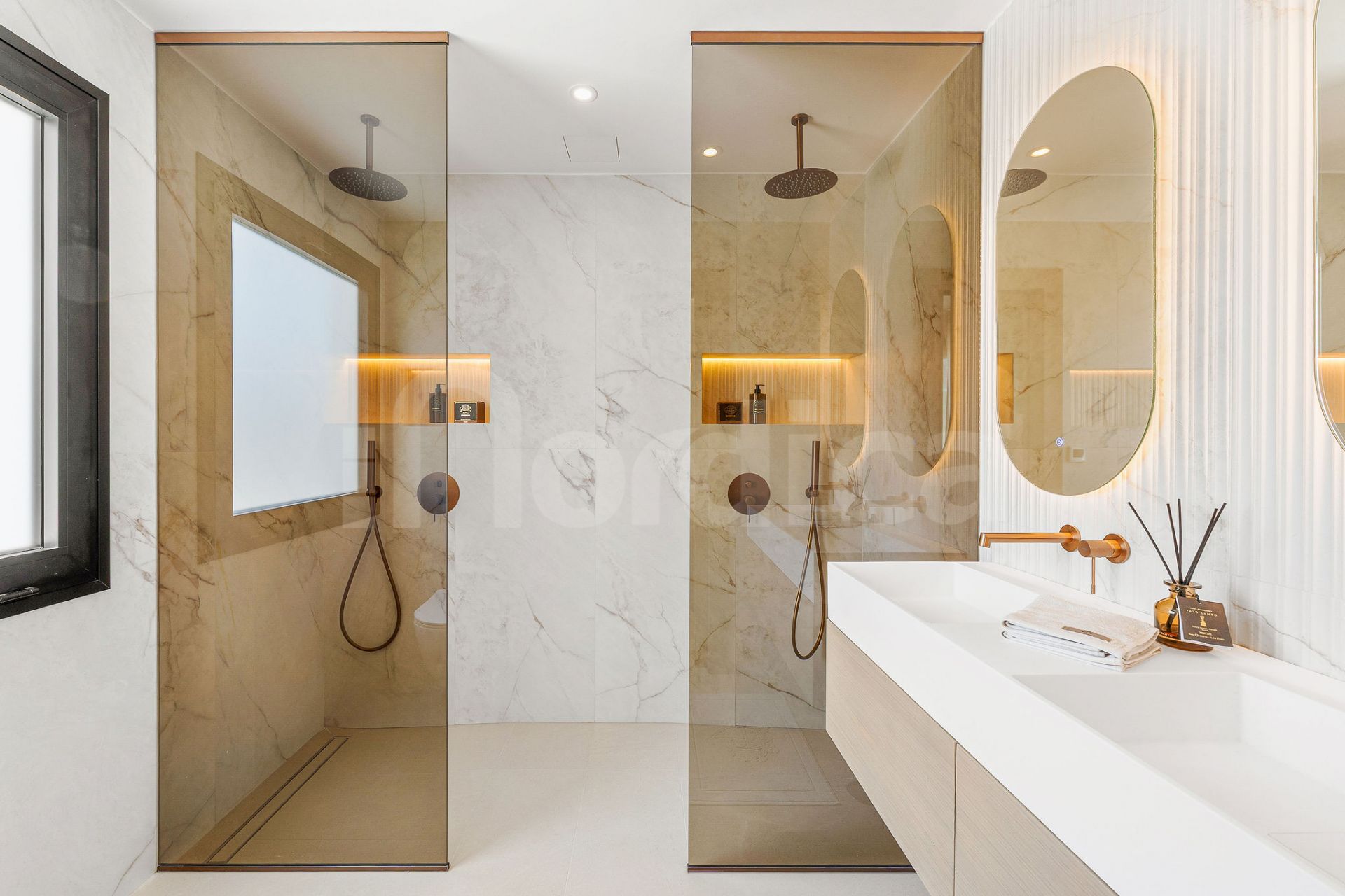 Im Obergeschoss bietet das Hauptschlafzimmer ein luxuriöses en-suite Badezimmer mit Doppel-Regendusche, einen begehbaren Ankleideraum und eine private Terrasse. Zwei weitere Gästezimmer teilen sich ein stilvolles Badezimmer und vervollständigen das Raumangebot. Zur Immobilie gehören außerdem zwei private Stellplätze sowie eine Vorinstallation für eine Ladestation für Elektrofahrzeuge.