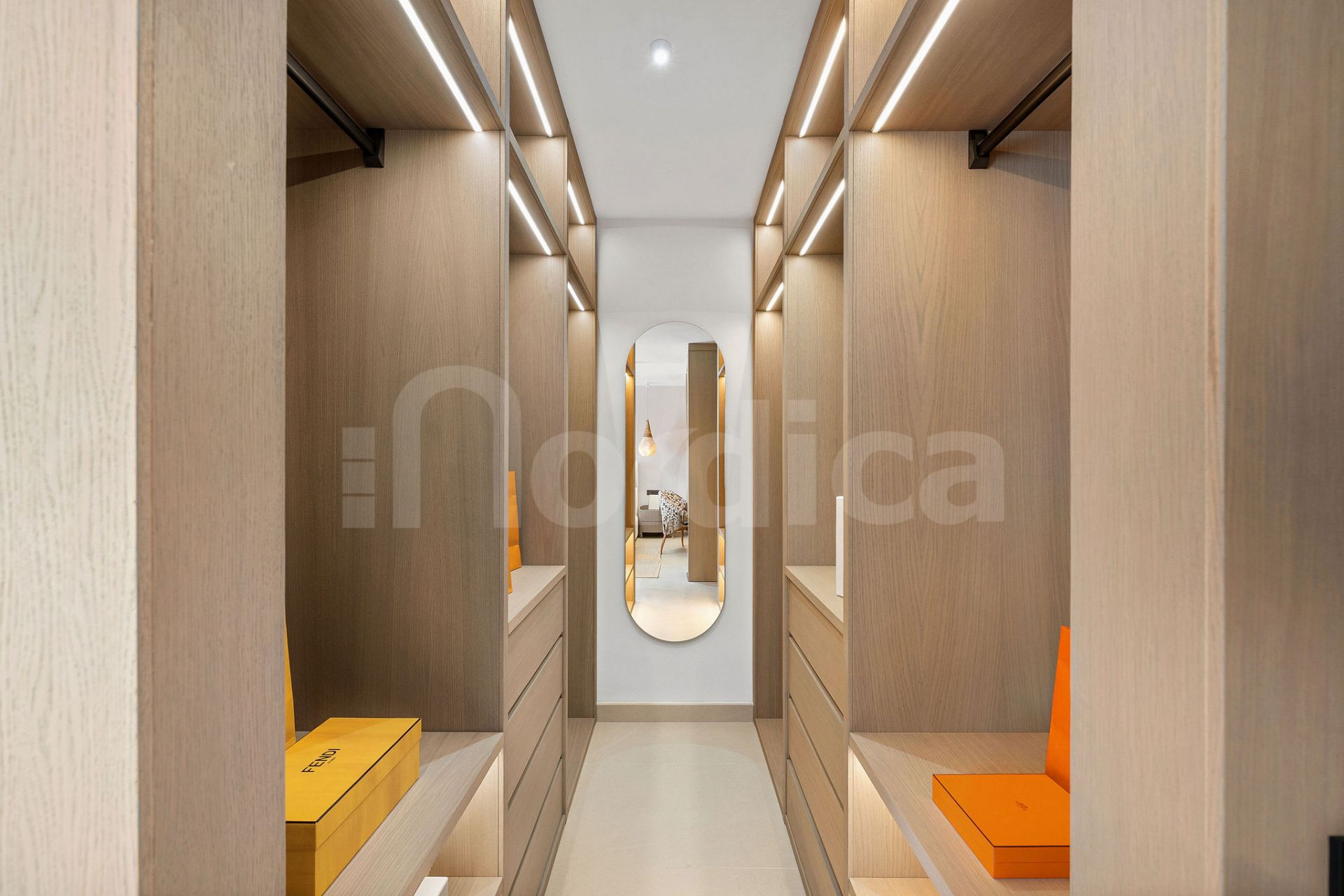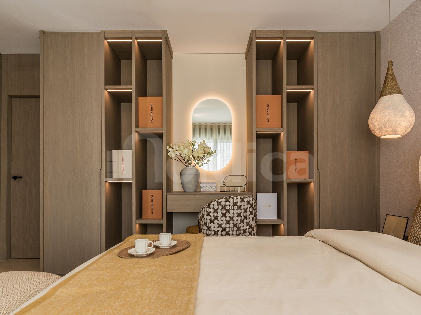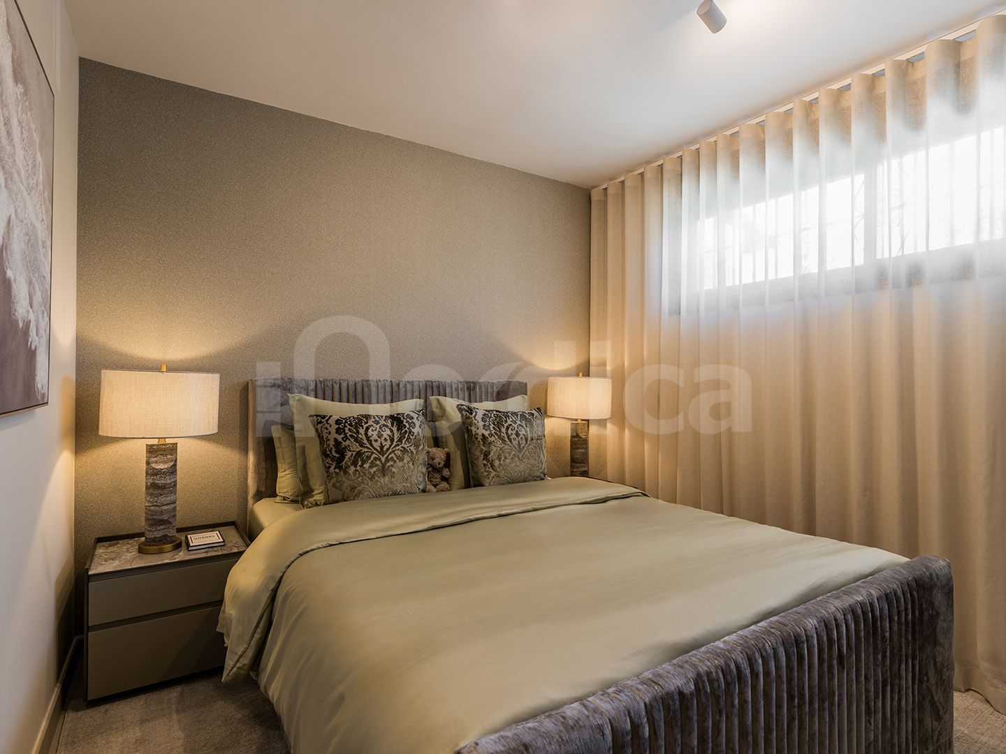 Im Obergeschoss bietet das Hauptschlafzimmer ein luxuriöses en-suite Badezimmer mit Doppel-Regendusche, einen begehbaren Ankleideraum und eine private Terrasse. Zwei weitere Gästezimmer teilen sich ein stilvolles Badezimmer und vervollständigen das Raumangebot. Zur Immobilie gehören außerdem zwei private Stellplätze sowie eine Vorinstallation für eine Ladestation für Elektrofahrzeuge.