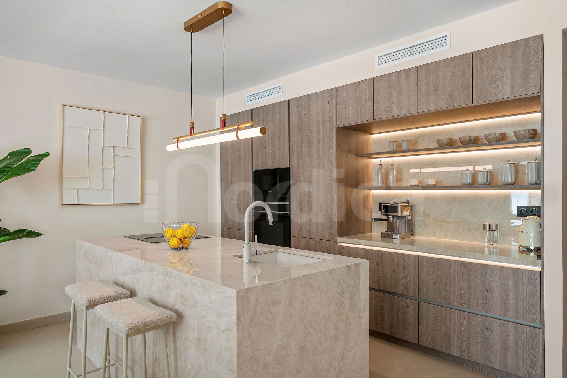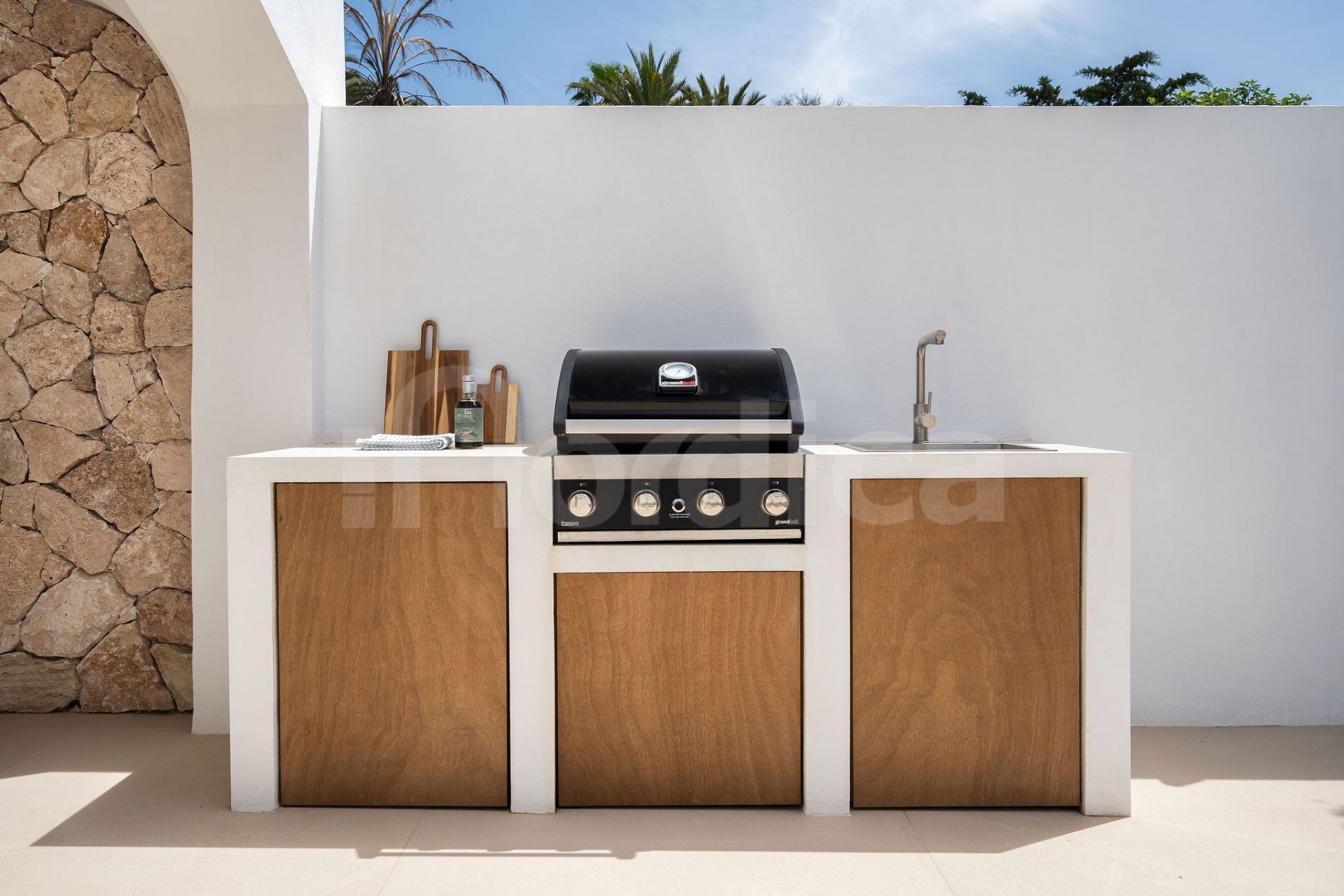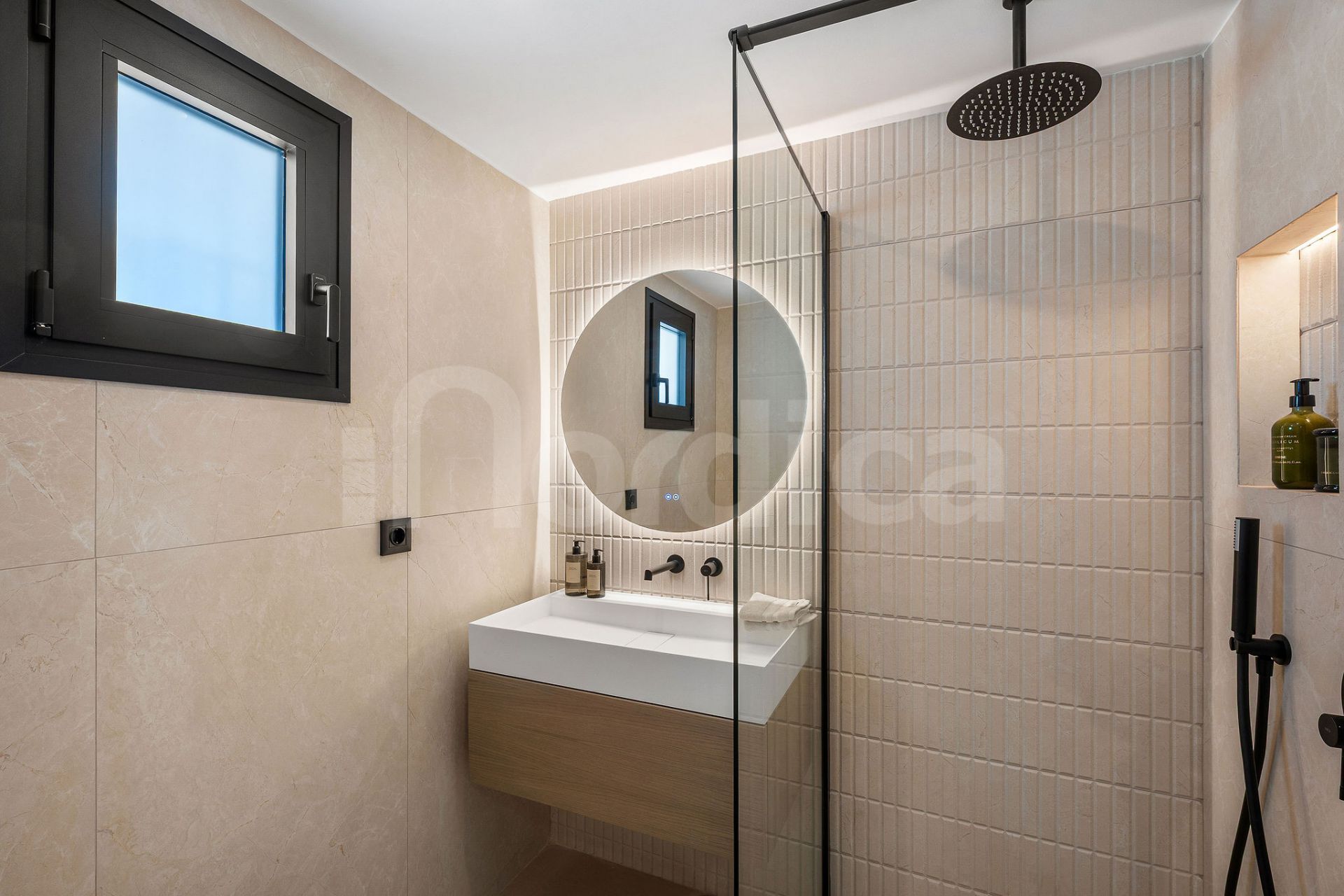 Auf zwei Ebenen verteilt, präsentiert das Erdgeschoss einen großzügigen Wohnbereich mit voll integrierter moderner Küche, hochwertigen Geräten und einer zentralen Kochinsel. Das helle Wohnzimmer öffnet sich zu einer teilweise überdachten Terrasse mit Außenküche, eingebautem Grill und Weinkühlschrank, ergänzt durch einen privaten beheizten Pool und eine Außendusche für ganzjährigen Outdoor-Genuss. Auf dieser Ebene befinden sich zudem ein Gästezimmer, ein Badezimmer und ein separater Hauswirtschaftsraum.