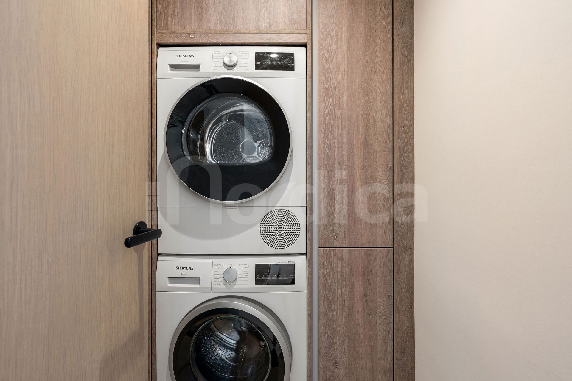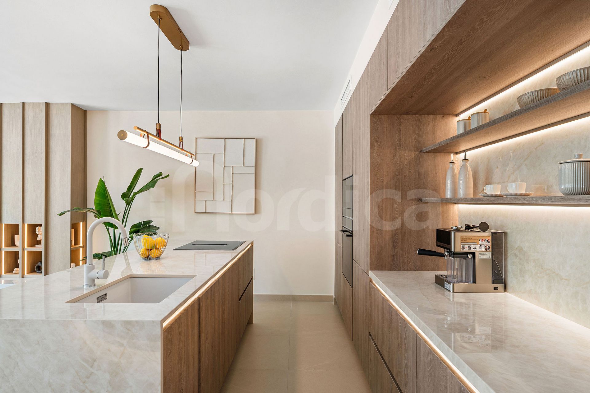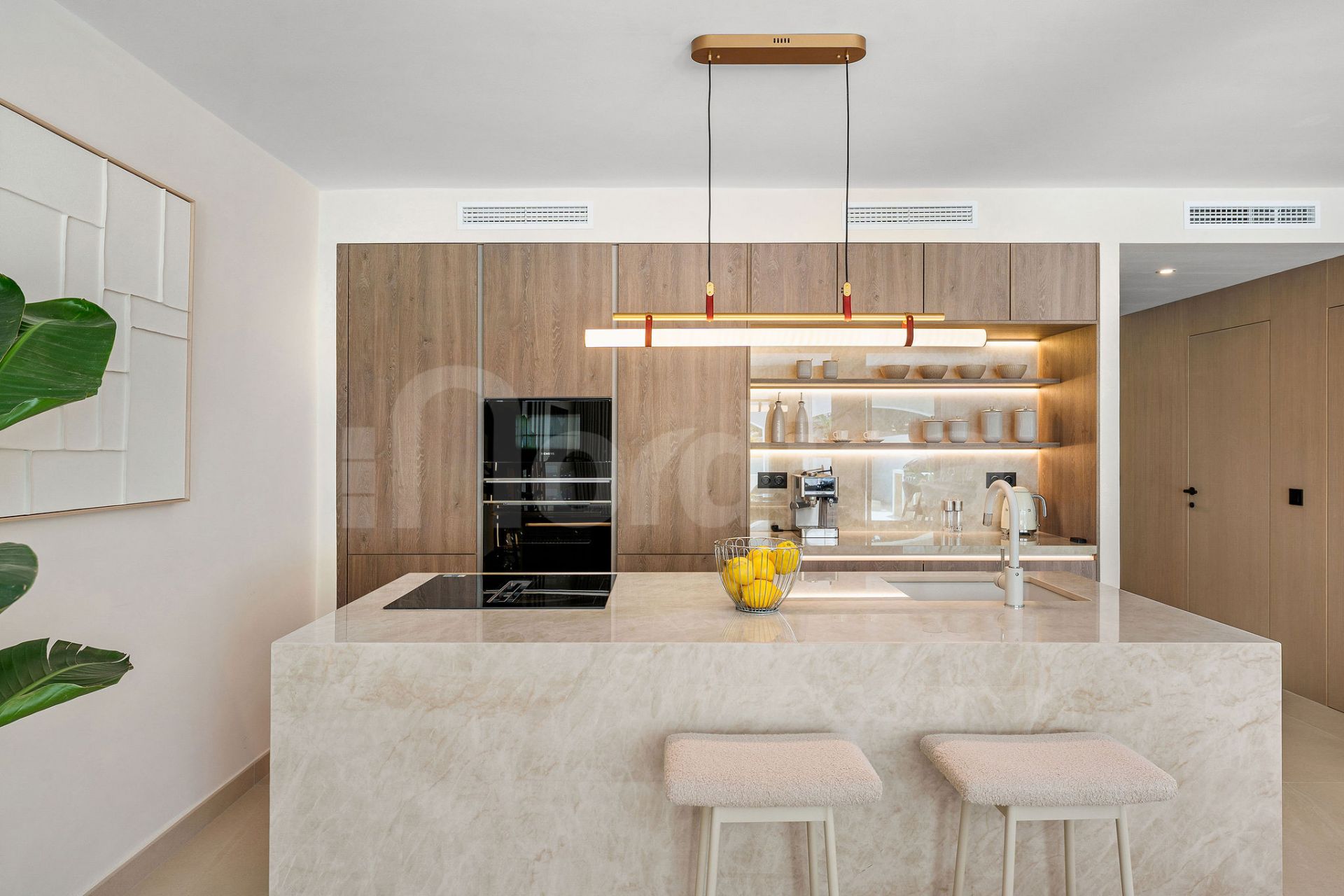 Auf zwei Ebenen verteilt, präsentiert das Erdgeschoss einen großzügigen Wohnbereich mit voll integrierter moderner Küche, hochwertigen Geräten und einer zentralen Kochinsel. Das helle Wohnzimmer öffnet sich zu einer teilweise überdachten Terrasse mit Außenküche, eingebautem Grill und Weinkühlschrank, ergänzt durch einen privaten beheizten Pool und eine Außendusche für ganzjährigen Outdoor-Genuss. Auf dieser Ebene befinden sich zudem ein Gästezimmer, ein Badezimmer und ein separater Hauswirtschaftsraum.