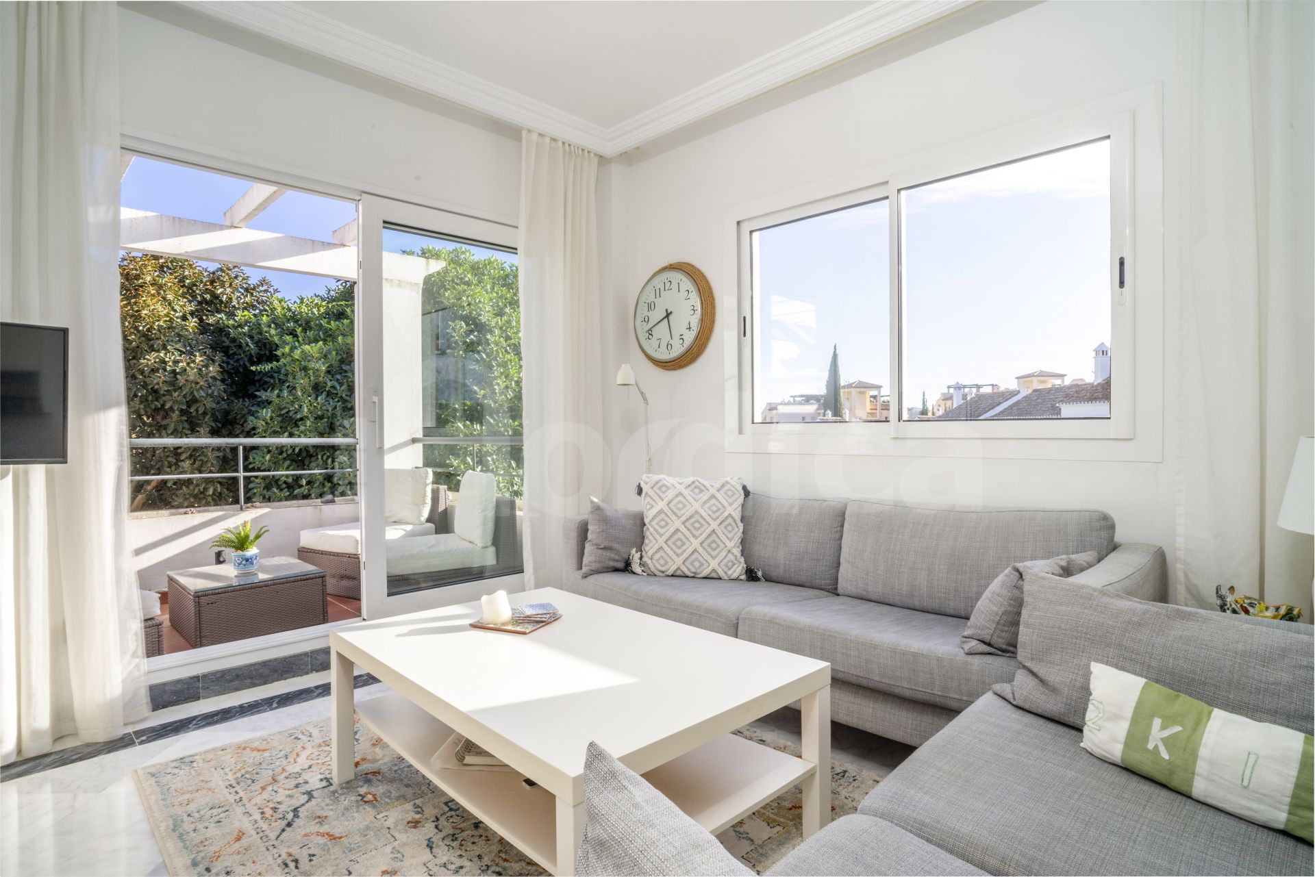 Willkommen in dieser charmanten Zwei-Zimmer-Eckwohnung in der begehrten Urbanisation Señorio de Gonzaga, im Herzen von Nueva Andalucía gelegen. Diese geschlossene Wohnanlage ist bekannt für ihre mediterrane Architektur, die wunderschön gepflegten Gärten und die einladenden Swimmingpools – sie bietet die perfekte Umgebung sowohl für dauerhaftes Wohnen als auch für Urlaubsaufenthalte.