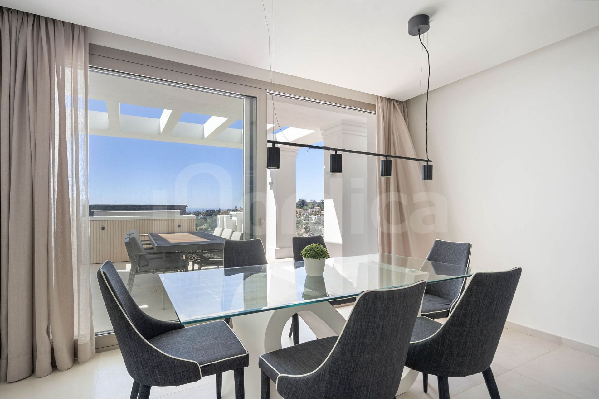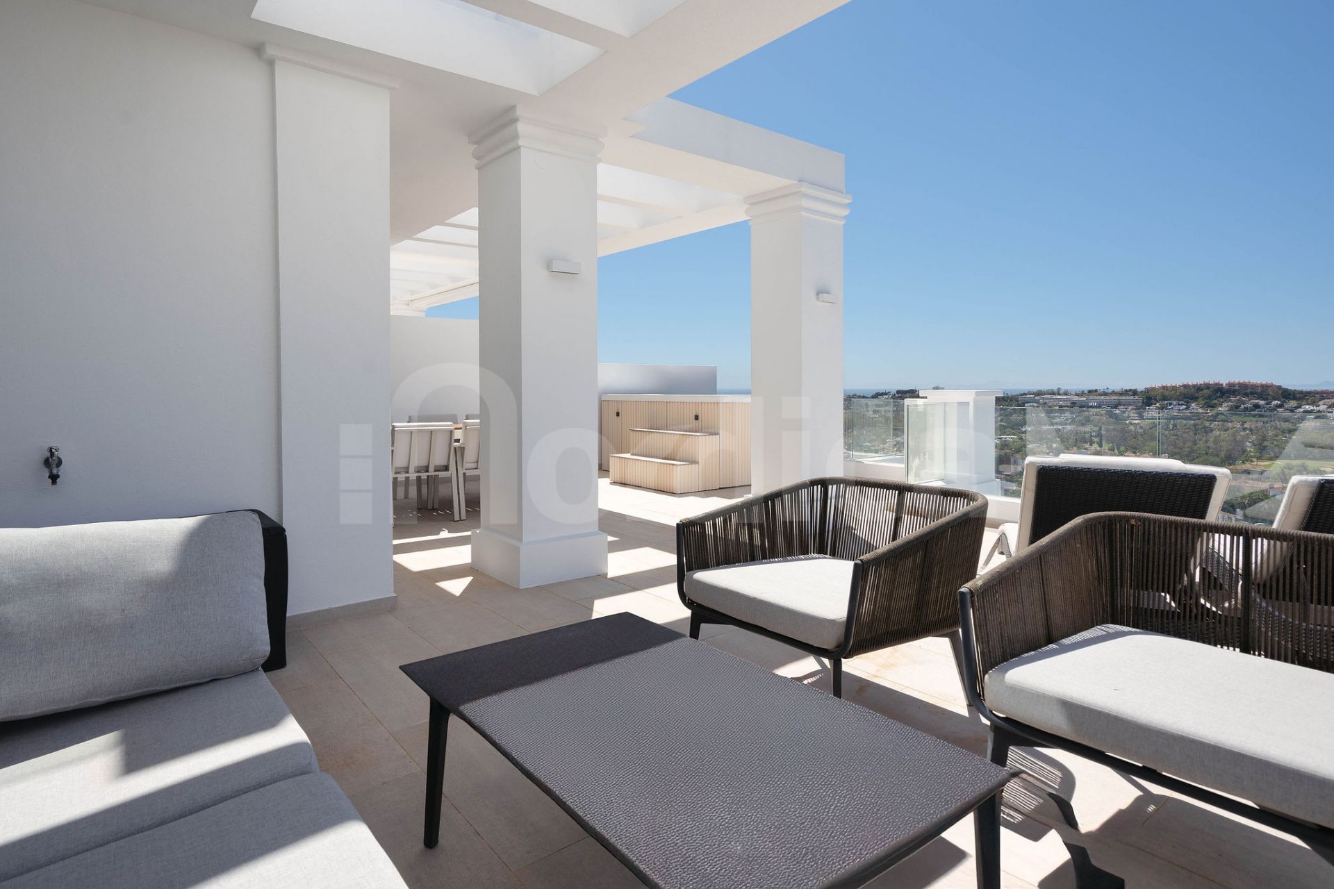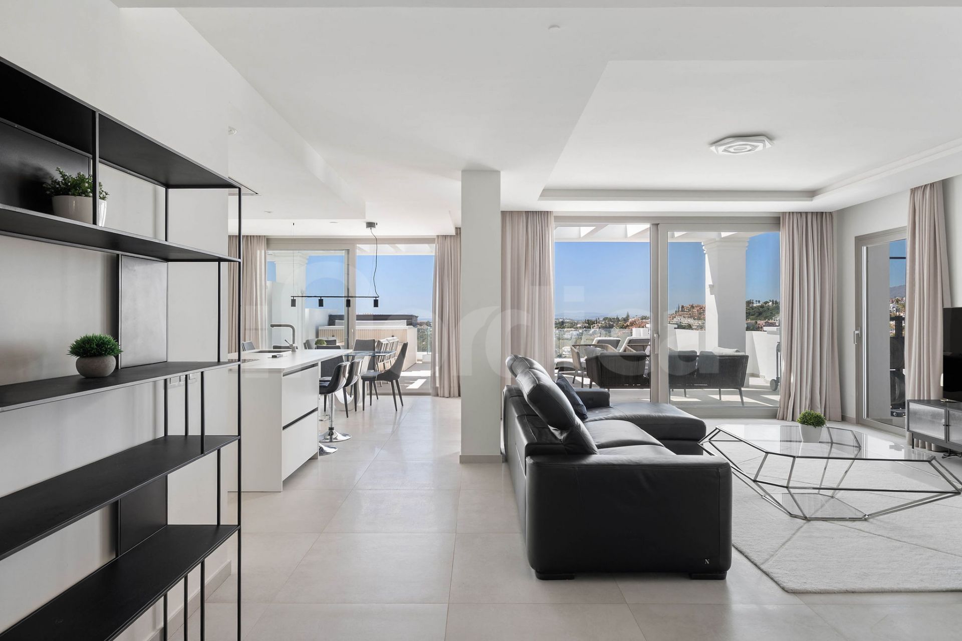 This exceptional apartment perfectly blends elegance, comfort, and contemporary design. The spacious open-plan living and dining area flows seamlessly onto an expansive south-west facing terrace, creating an ideal setting for both entertaining and unwinding. From here, enjoy breathtaking panoramic sea views stretching to Gibraltar, enhanced by a private drop jacuzzi for ultimate relaxation.