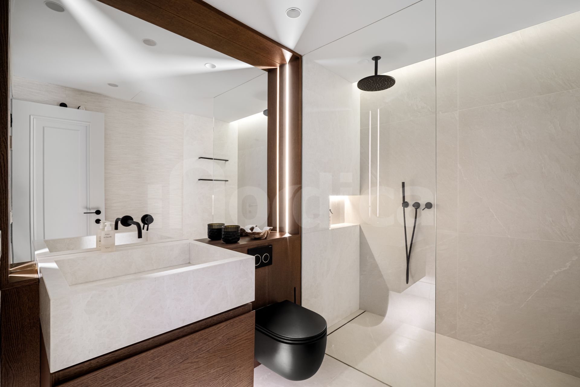Set within a gated community, this south-facing property spans 315 m², including 172 m² of interior space and over 140 m² of terraces. The main level features a bright living area opening onto a spacious terrace, a fully equipped modern kitchen, and two guest bedrooms with en-suite bathrooms and underfloor heating.
