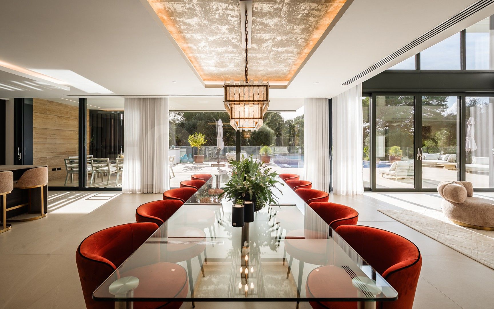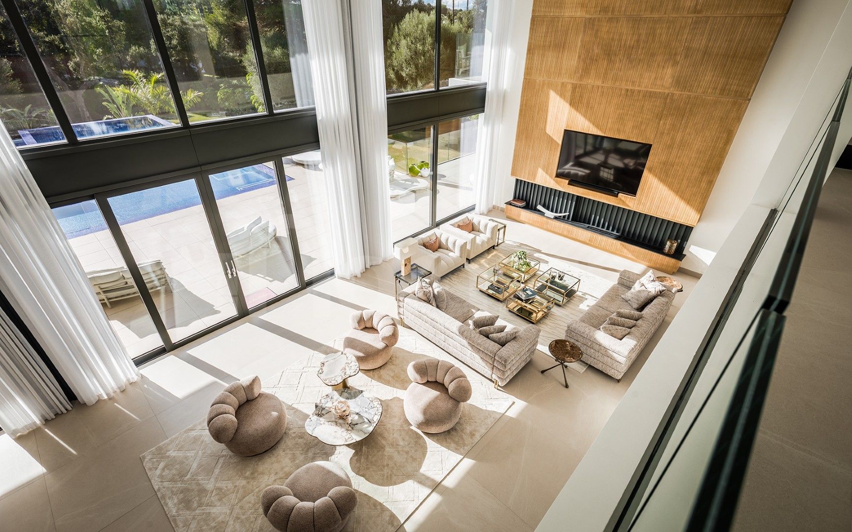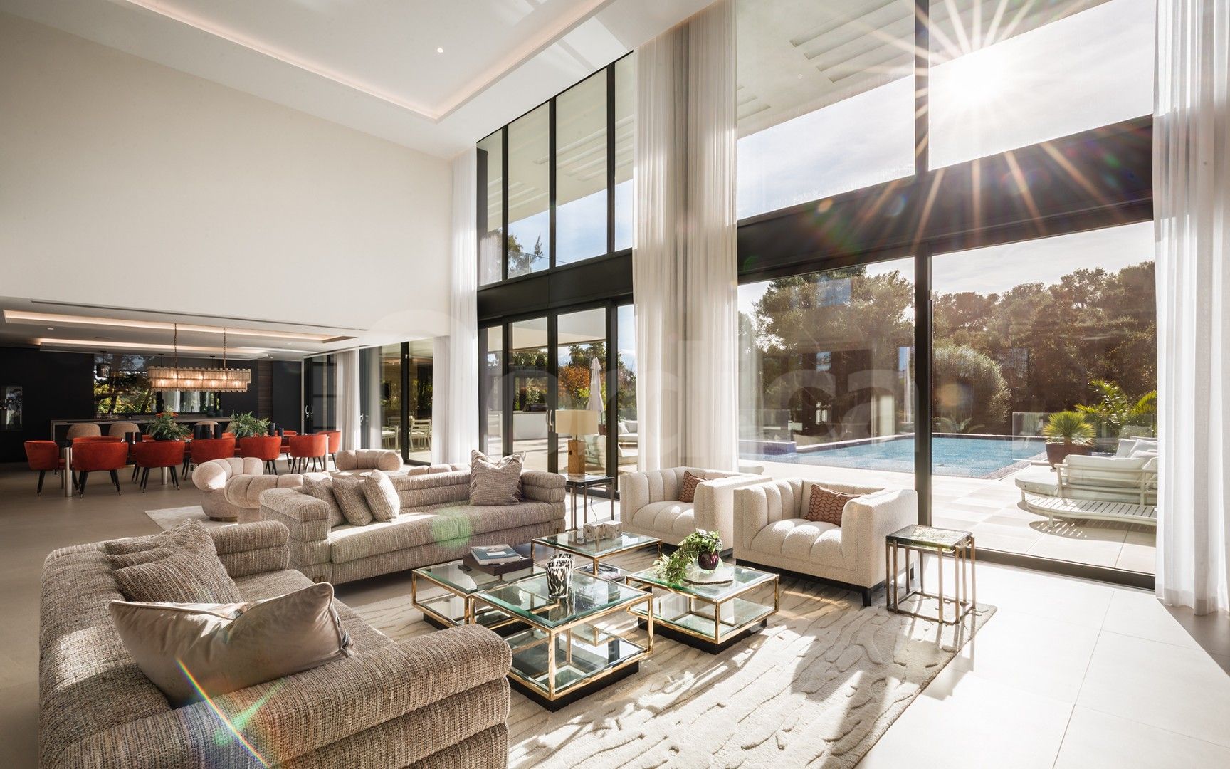 Upon entering, a spacious entrance hall leads to a spectacular double-height living area with ceilings reaching approximately six meters, creating an immediate sense of scale and sophistication. The open-plan layout is designed for both comfortable everyday living and elegant entertaining, with generous indoor and outdoor spaces that flow naturally from one area to the next.