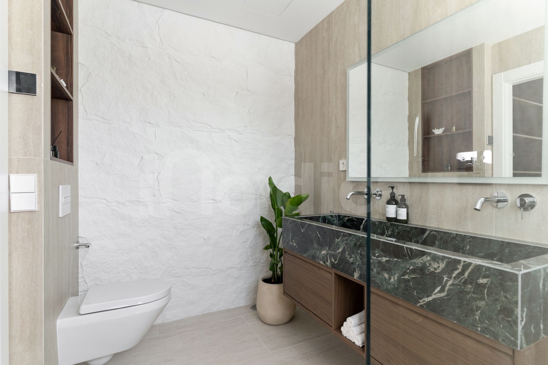 The main floor comprises of an open-plan kitchen, dining, and living space which flows directly onto a generous south facing terrace. The kitchen features elegant Italian marble countertops and a built-in wine bar, while a guest en-suite bedroom with its own terrace offers privacy and comfort.