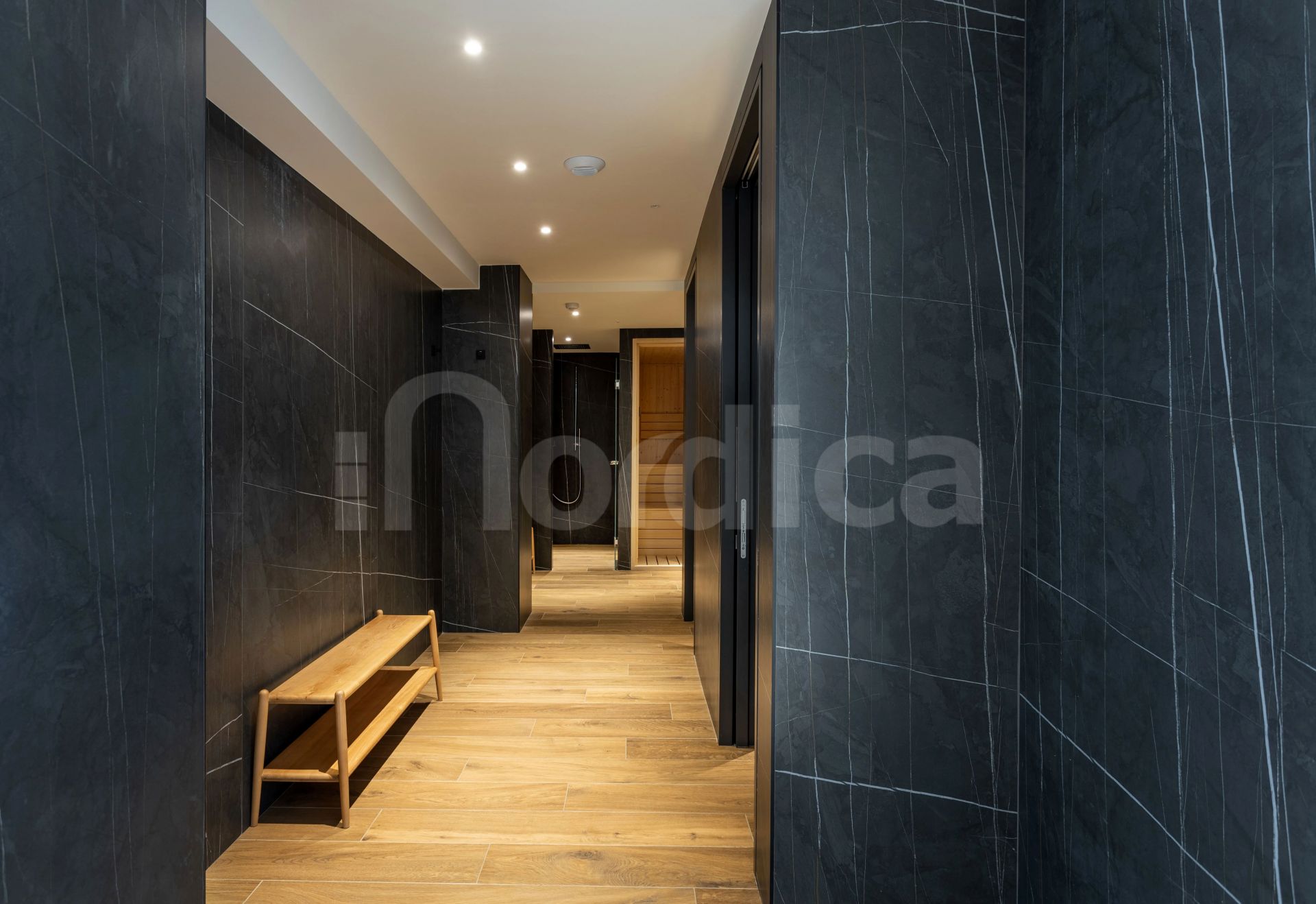 Upstairs, the master suite serves as a peaceful retreat with a walk-in closet and luxurious en- suite bath. Two additional bedrooms, both with en-suite bathrooms on this level. A dedicated laundry area tucked away from the main living spaces adds convenience to the home’s well-thought-out design. This is the only residence in the development with private, direct access to the pool, gym, and spa, giving it a sense of exclusivity.
