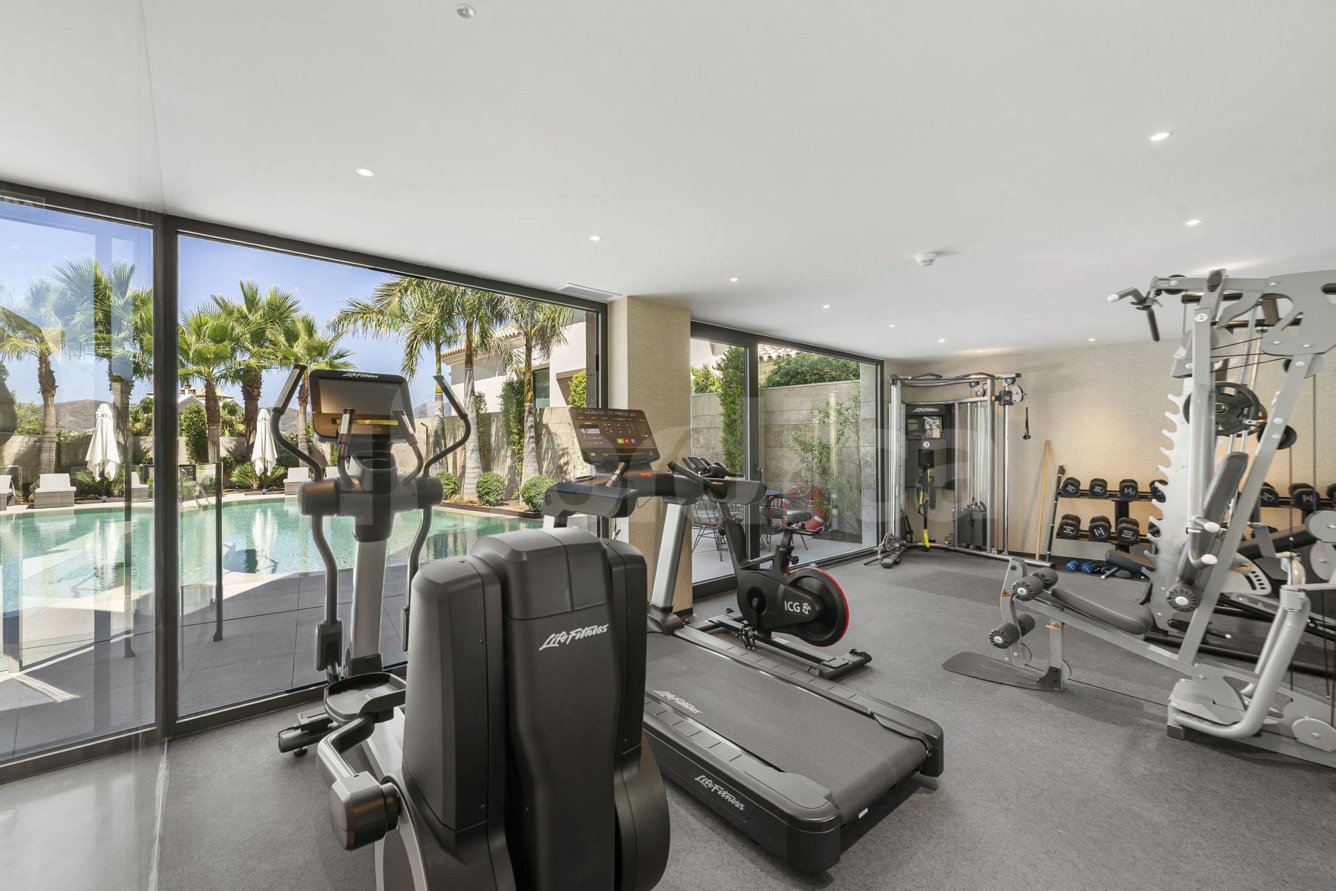 Located in a secure, gated community of just seven homes, the property features a generous, light-filled open-plan layout, where the spacious living and dining area flows effortlessly into a designer kitchen with Gaggenau and Miele appliances. Floor-to-ceiling automated sliding windows fully open to connect the interior with a large L- shaped terrace complete with an outdoor living, dining space, and summer kitchen.