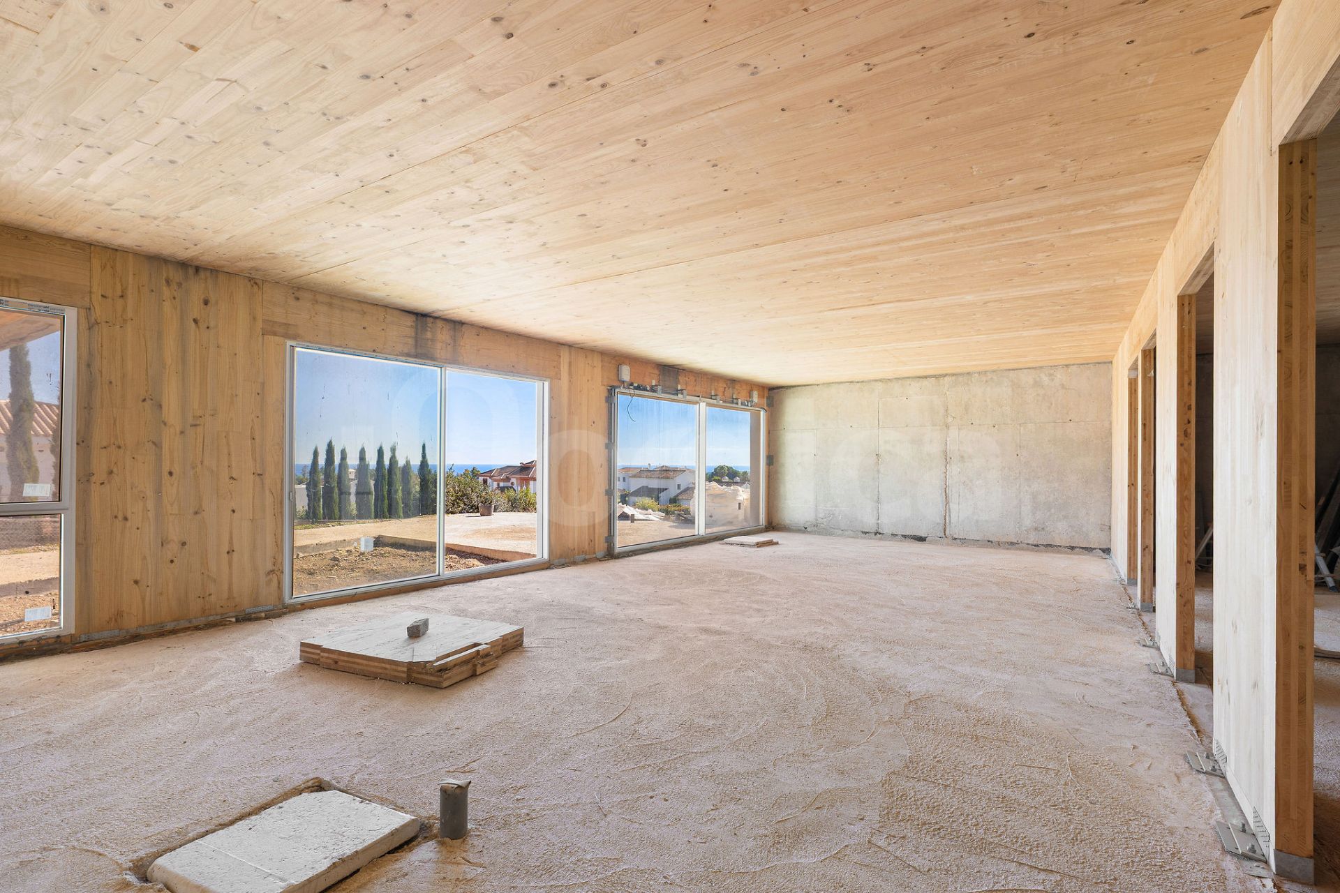 The project includes generous outdoor areas that embrace the natural surroundings, with multiple terraces and an infinity-style pool that provide sweeping views over the sea, countryside, golf course and mountains. Large openings and thoughtfully planned outdoor living spaces make the most of the villa’s elevated position and peaceful environment.