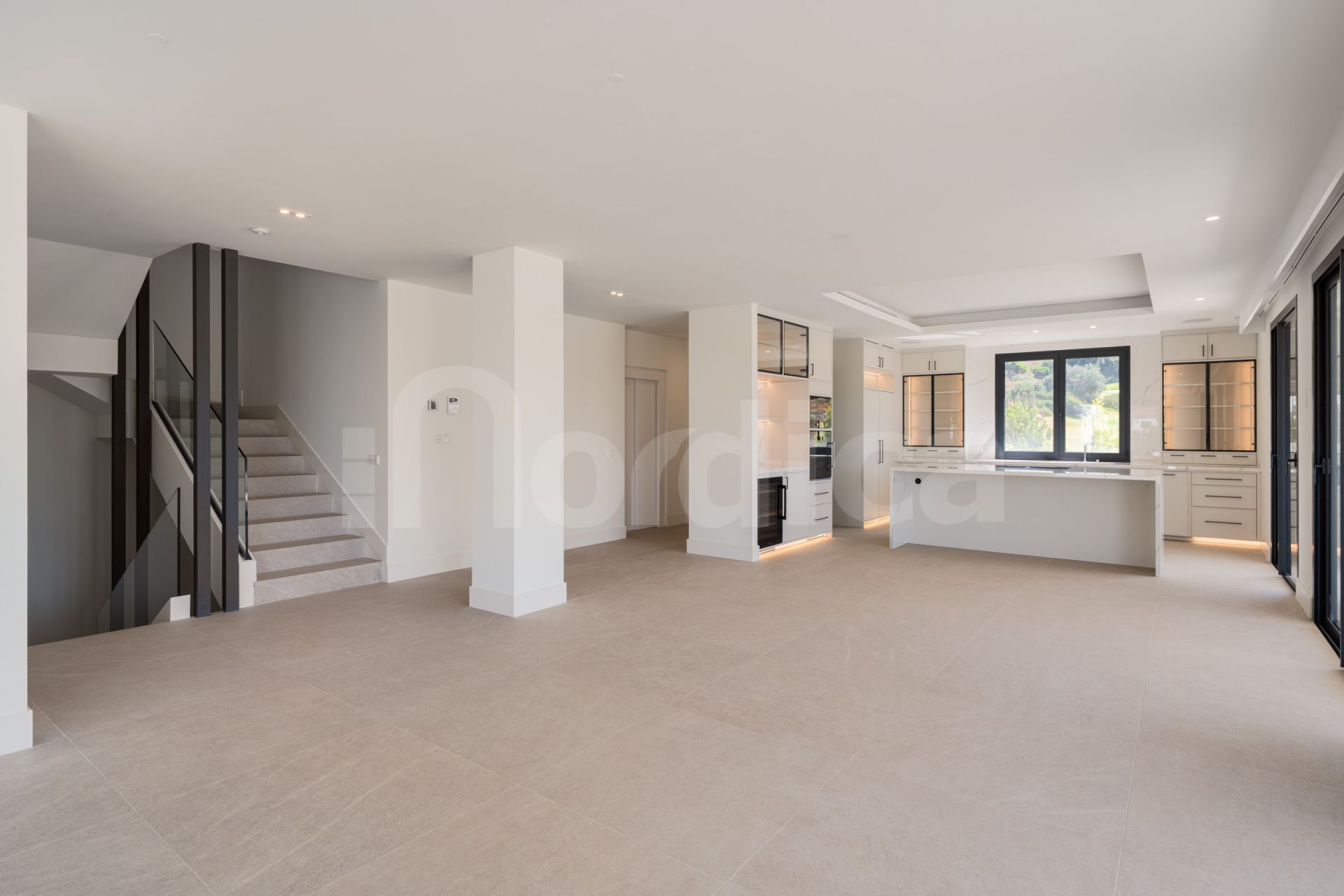 When you arrive to the property you are guided directly to the rooftop terrace via a private driveway, establishing a bold entrance that sets the tone. From the rooftop, expansive views sweep across the fairways of La Resina Golf Course and down to the Mediterranean Sea. Descending into the main living floor reveals a layout designed for fluid movement and connection. The open-plan design integrates spacious living and dining areas, centred around a custom kitchen with a stone island.