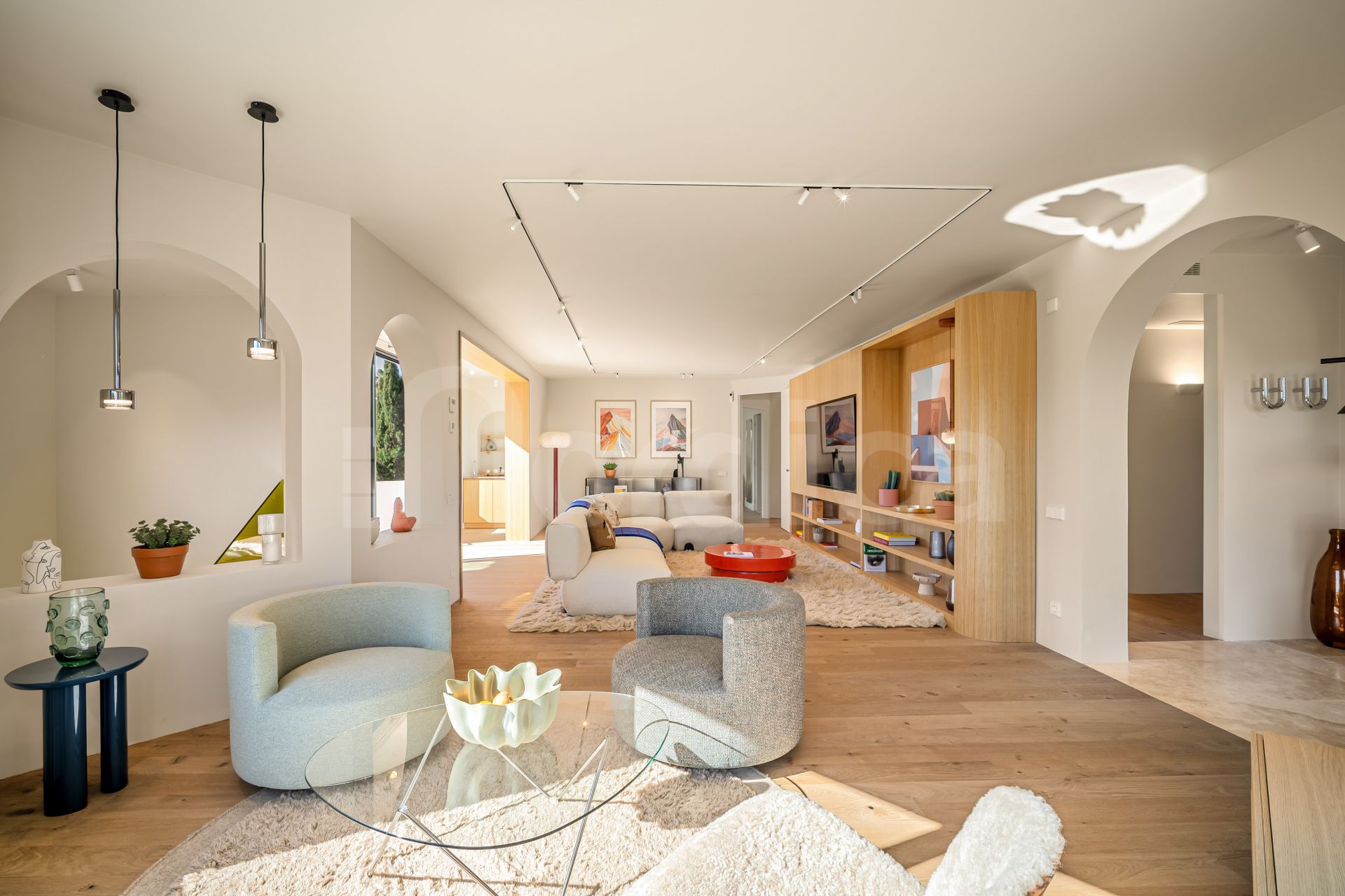 The interior spans 262 m² and has been conceived by a renowned architect who balances clean, minimalist lines with natural textures and inviting finishes. At its centre lies a beautiful open-plan kitchen equipped with Miele appliances and seamlessly connected to the dining and living areas. Large openings lead directly to the landscaped terrace and pool, ensuring an effortless indoor–outdoor lifestyle.