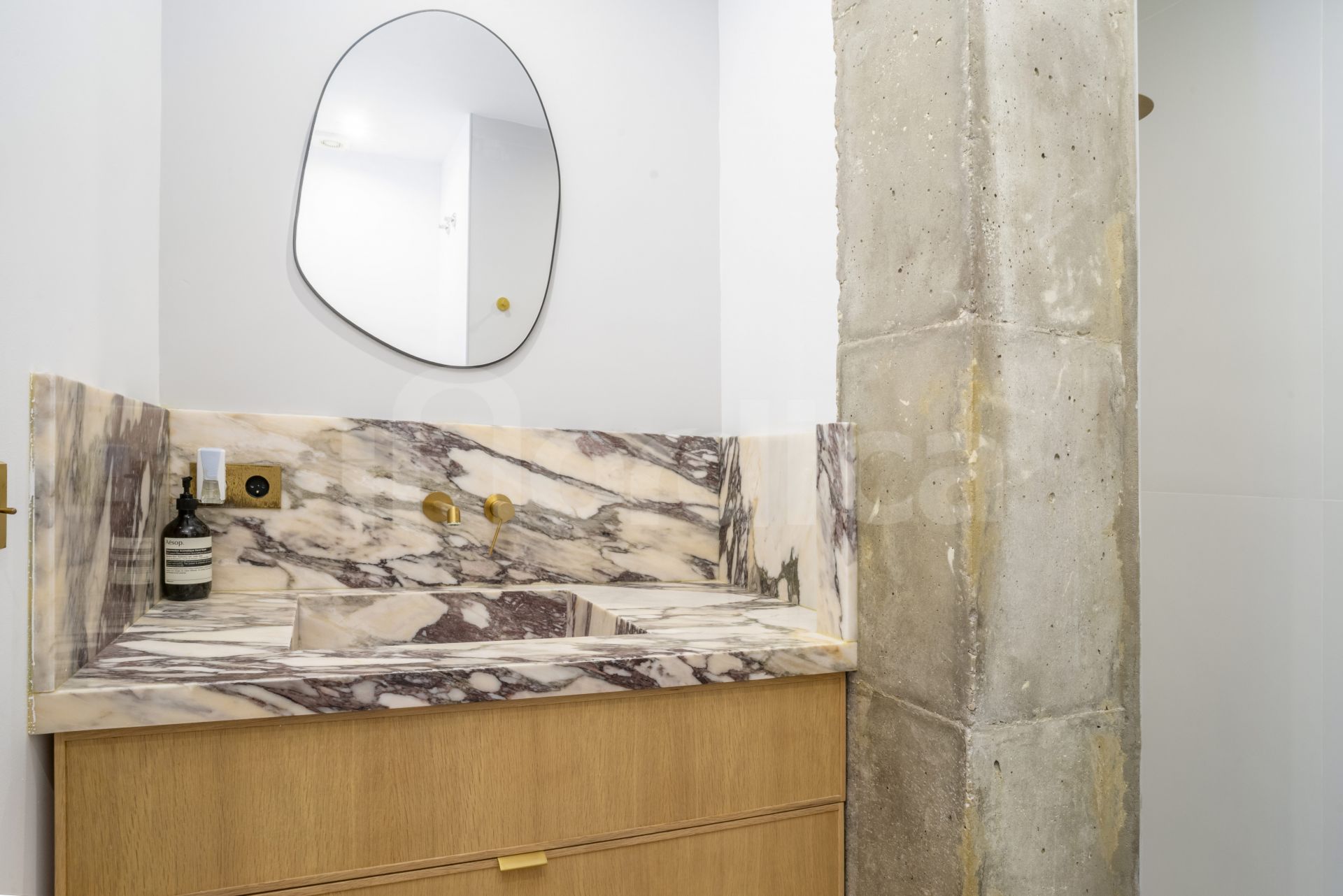 The apartment offers three rooms and two bathrooms, all thoughtfully renovated with high-quality materials and contemporary finishes. The third room is currently arranged as an office but can easily be converted back into a bedroom if required, providing valuable flexibility.