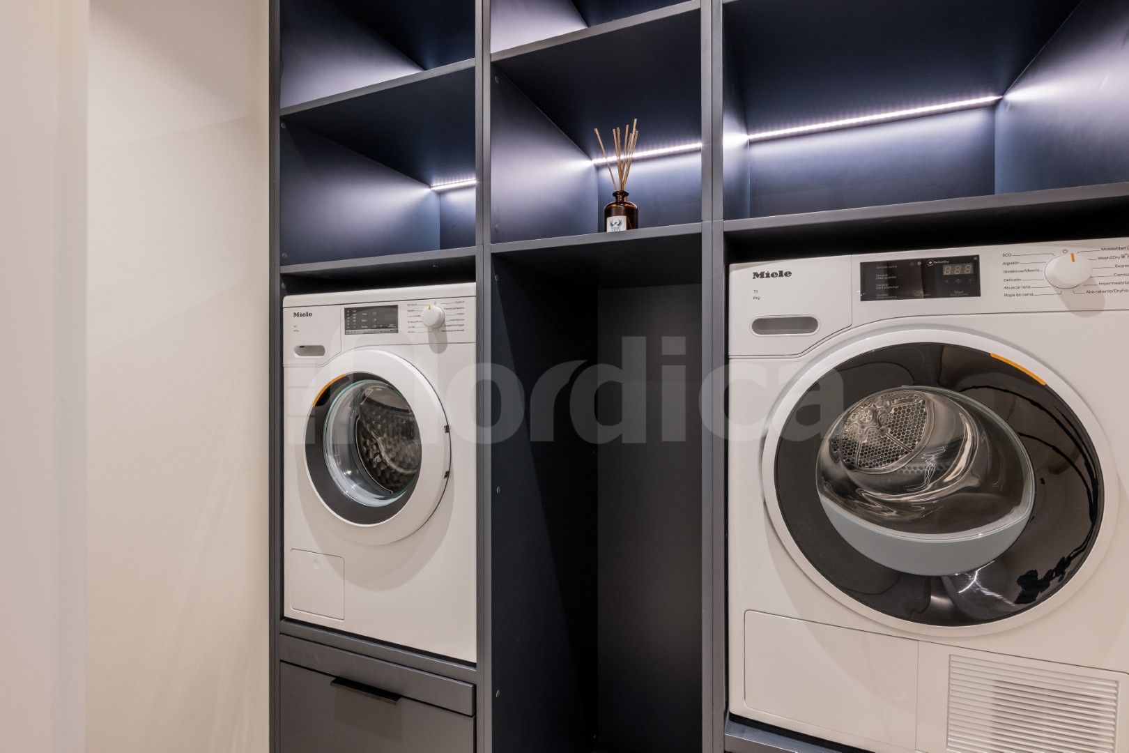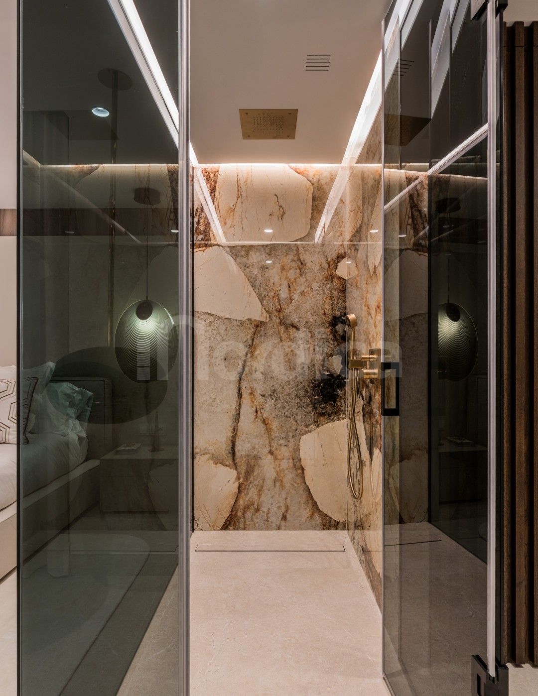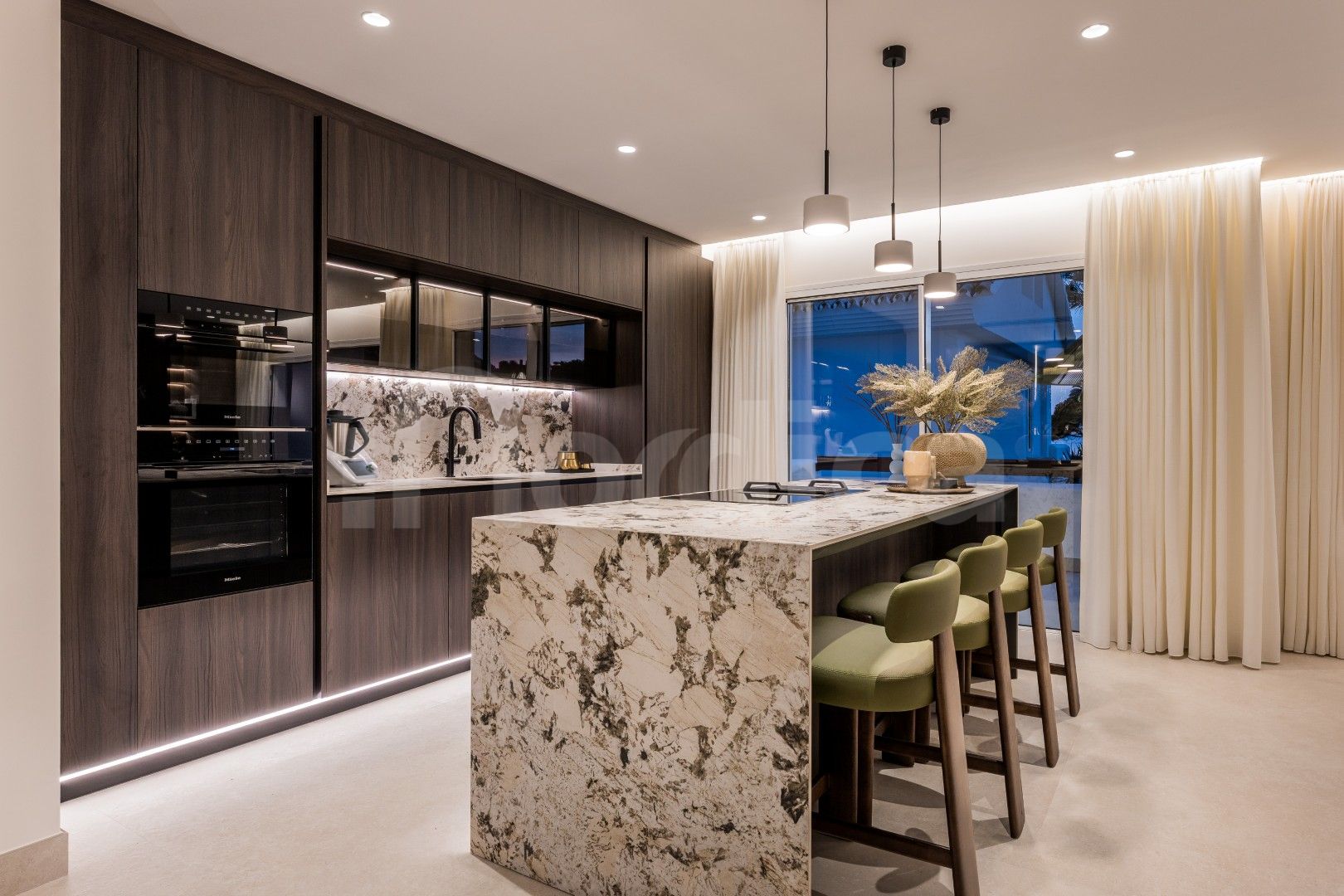 The apartment showcases premium finishes throughout, including elegant flooring, bespoke furnishings, and a fully equipped open-plan designer kitchen with state-of-the-art German appliances. Every detail has been crafted for sophistication and comfort — from the custom wardrobes and Bang & Olufsen sound system to the underfloor heating and modern electric fireplace. Expansive windows fill the living spaces with natural light while framing stunning panoramic sea views.