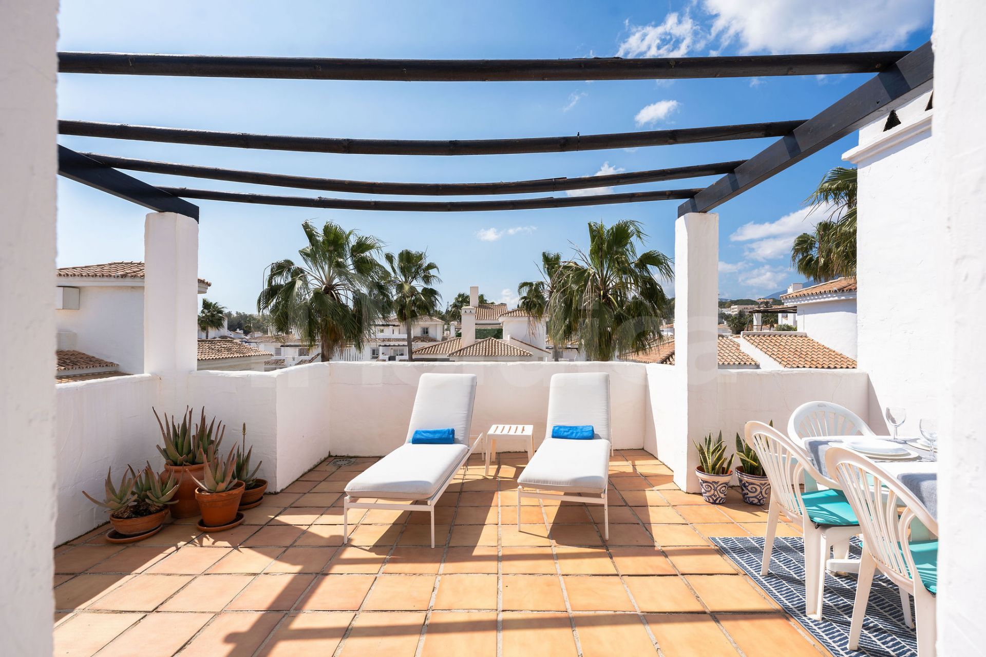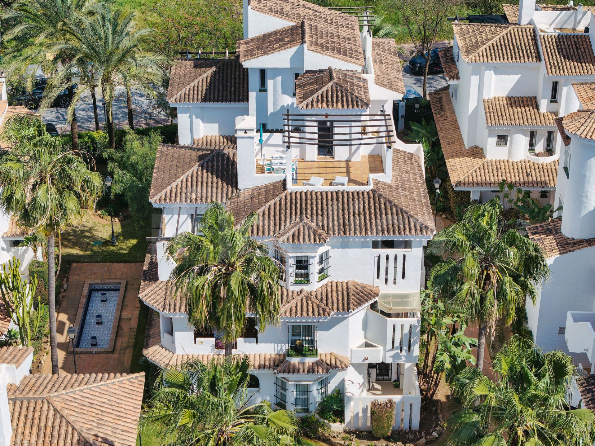 Set within a charming Andalusian-style development, this penthouse benefits from a welcoming community with meticulously landscaped gardens, eight inviting swimming pools, and a tranquil atmosphere. Residents enjoy the convenience of an on-site supermarket, while yoga studios, boutique shops, and leisure facilities are all within easy walking distance.